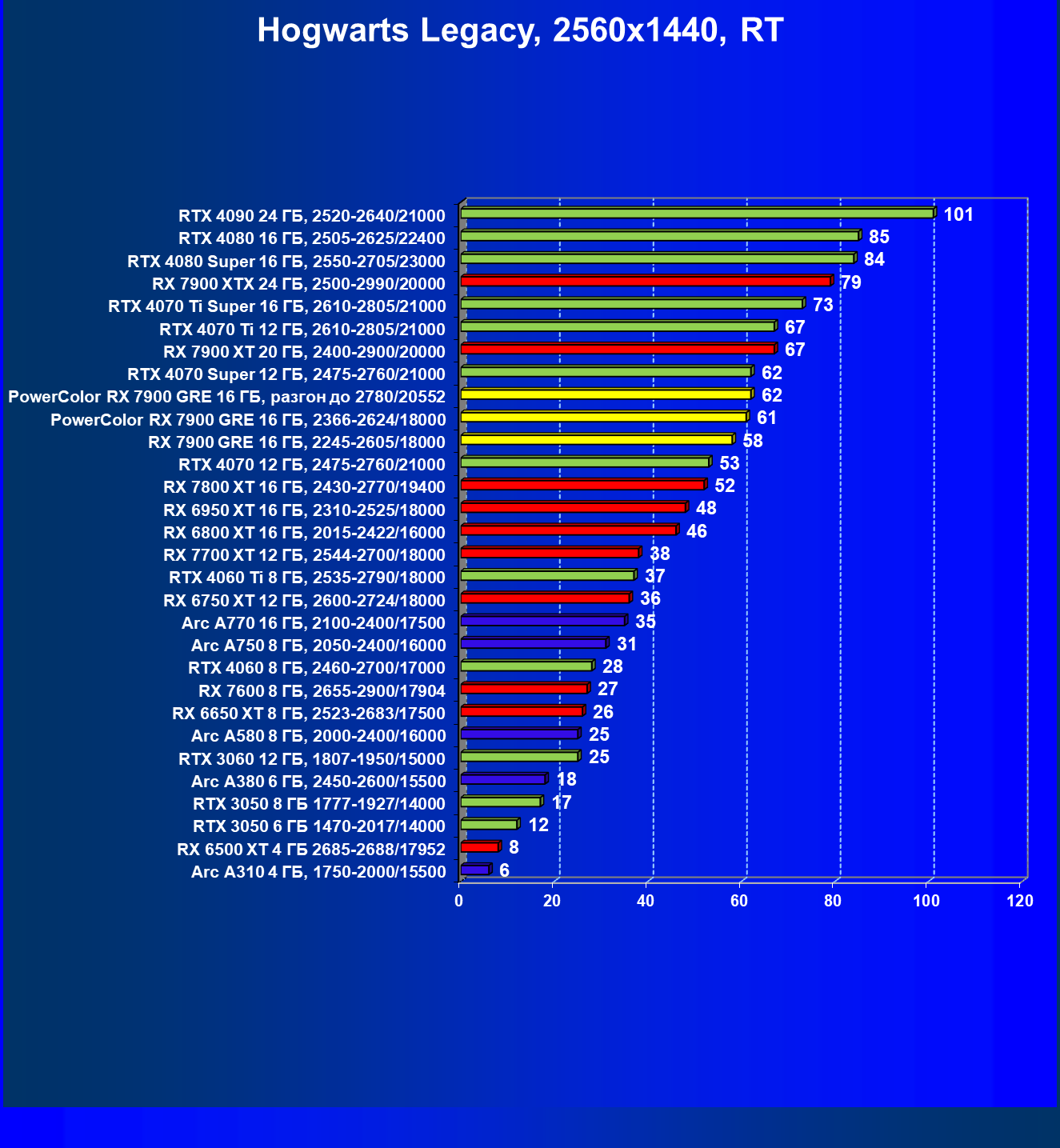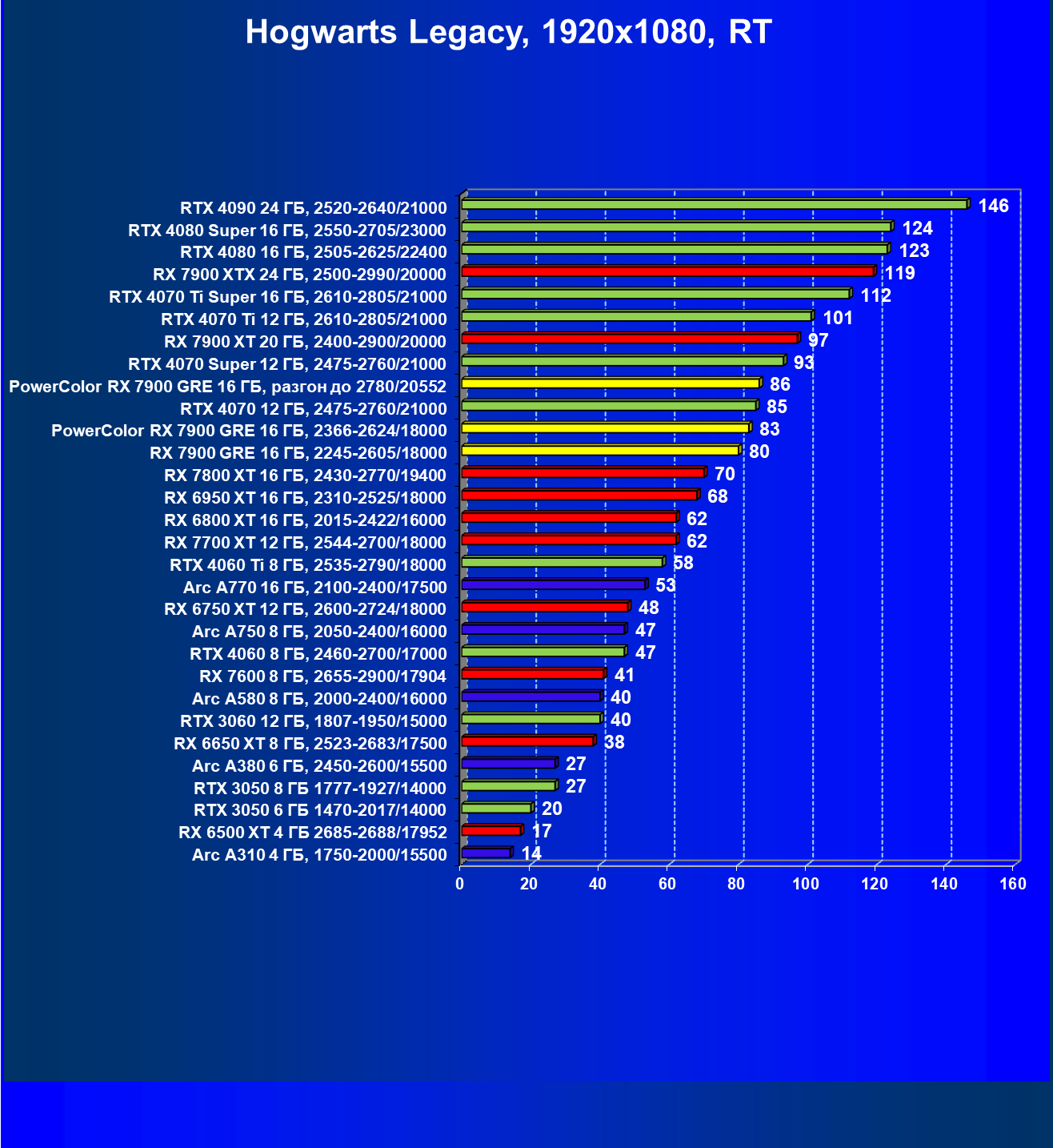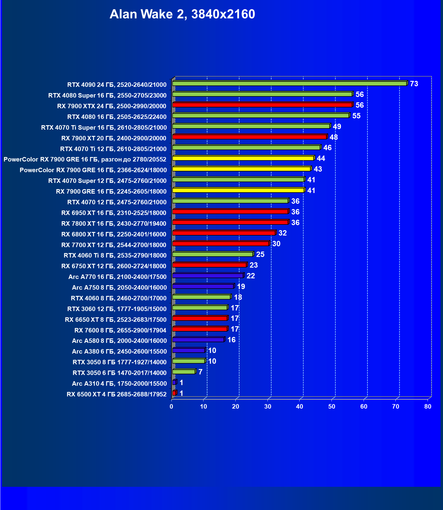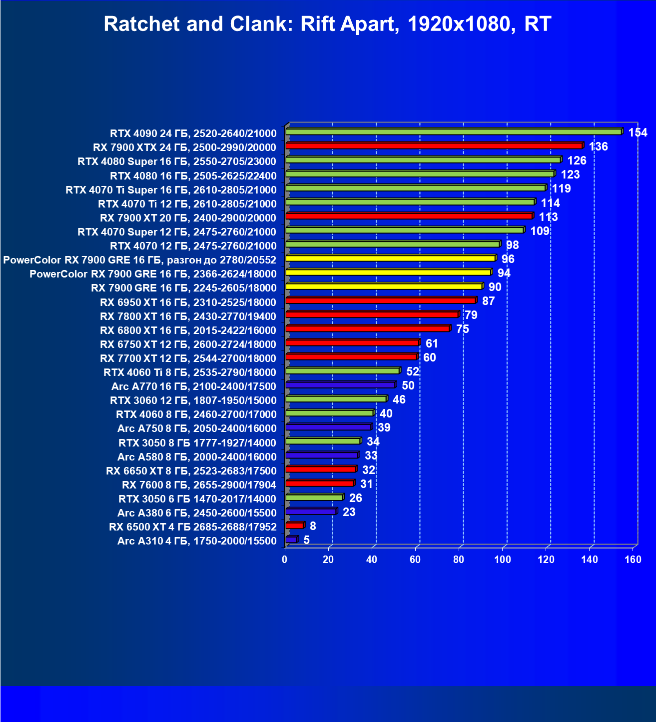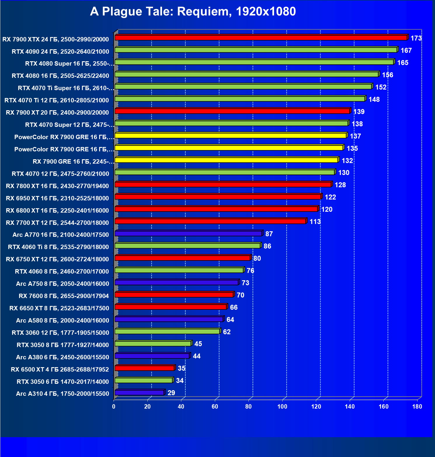 | 07 | PowerColor RX 7900 GRE 16 ГБ, разгон до 2780/20552 | 132 | 885 | 67 000 |