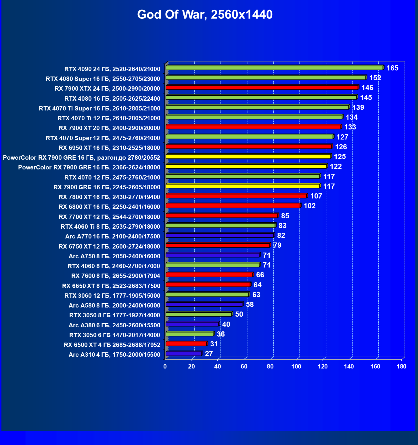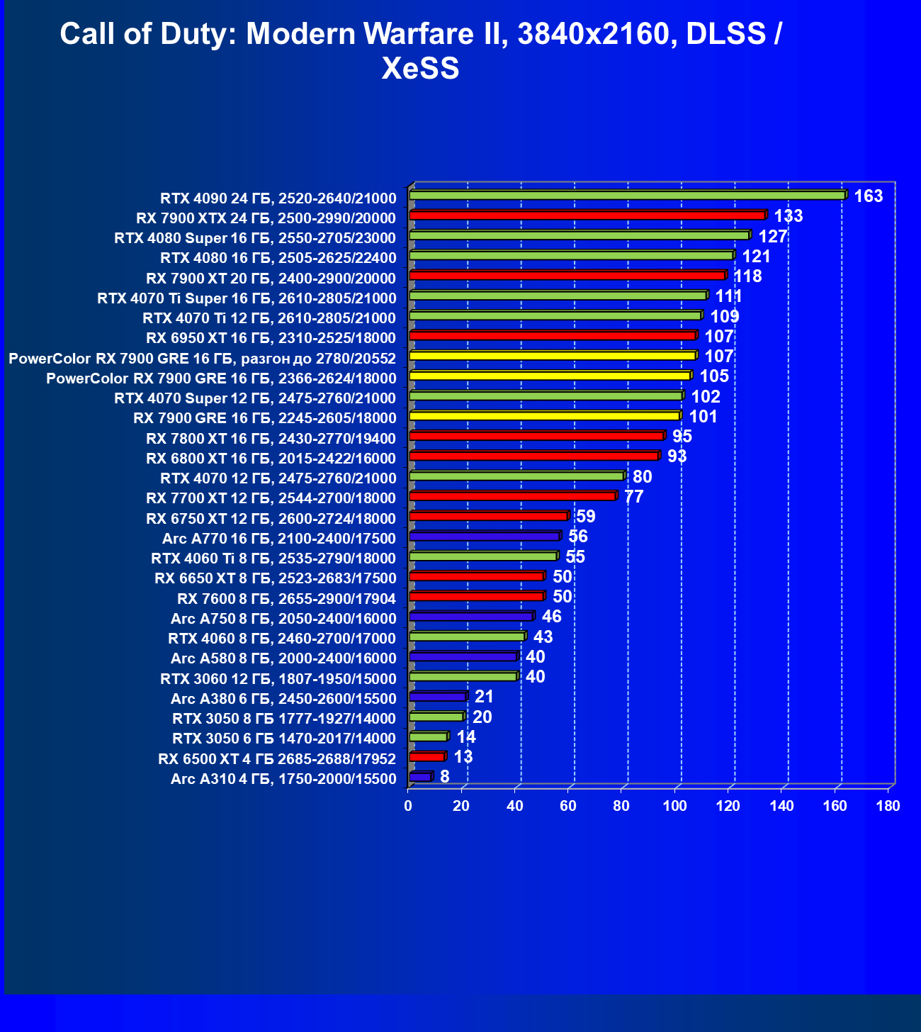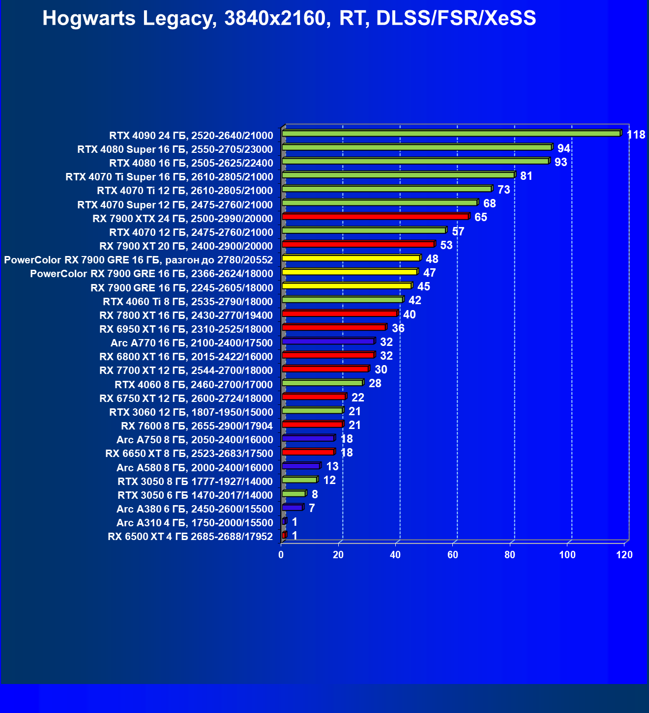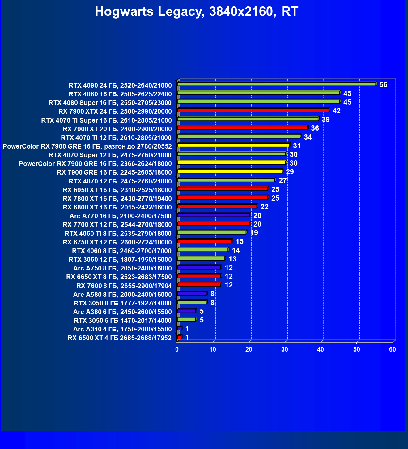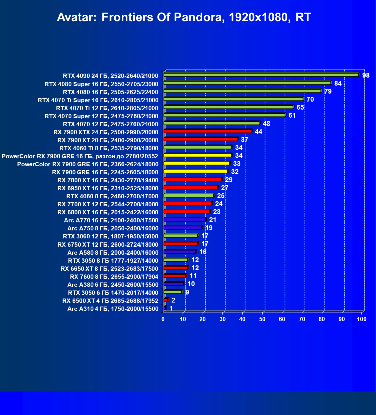 | 07 | PowerColor RX 7900 GRE 16 ГБ, разгон до 2780/20552 | 132 | 885 | 67 000 |