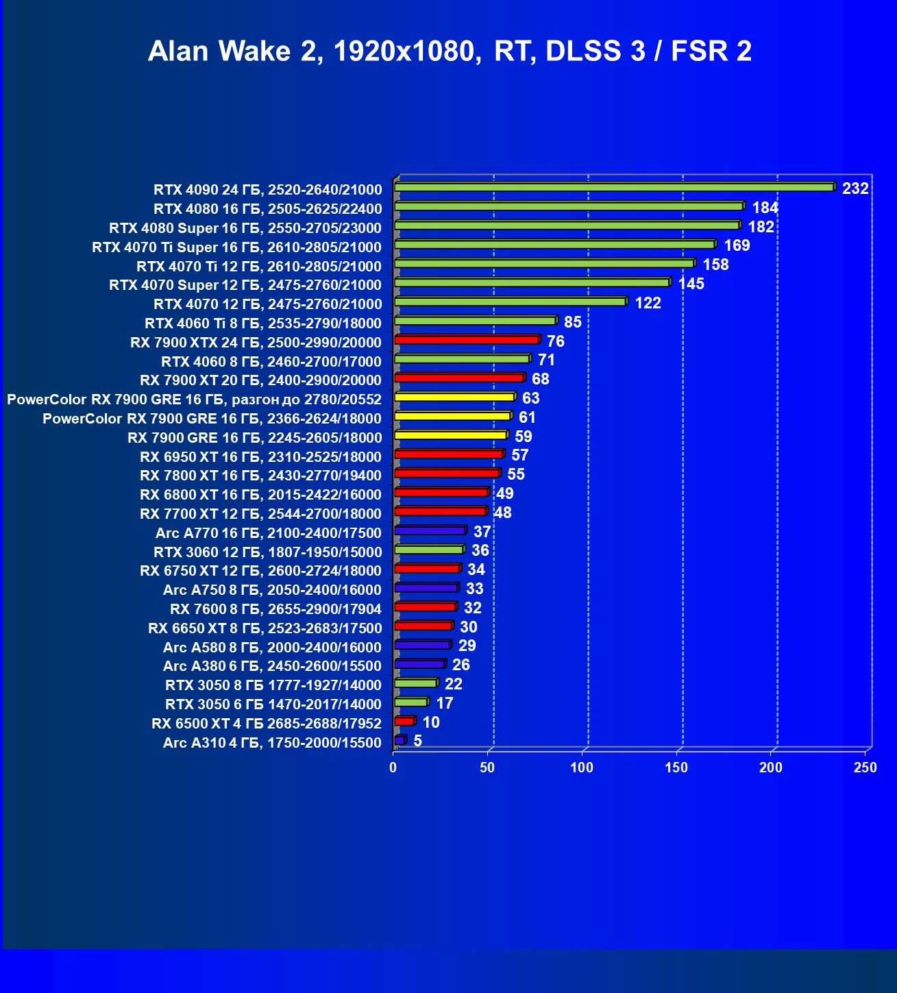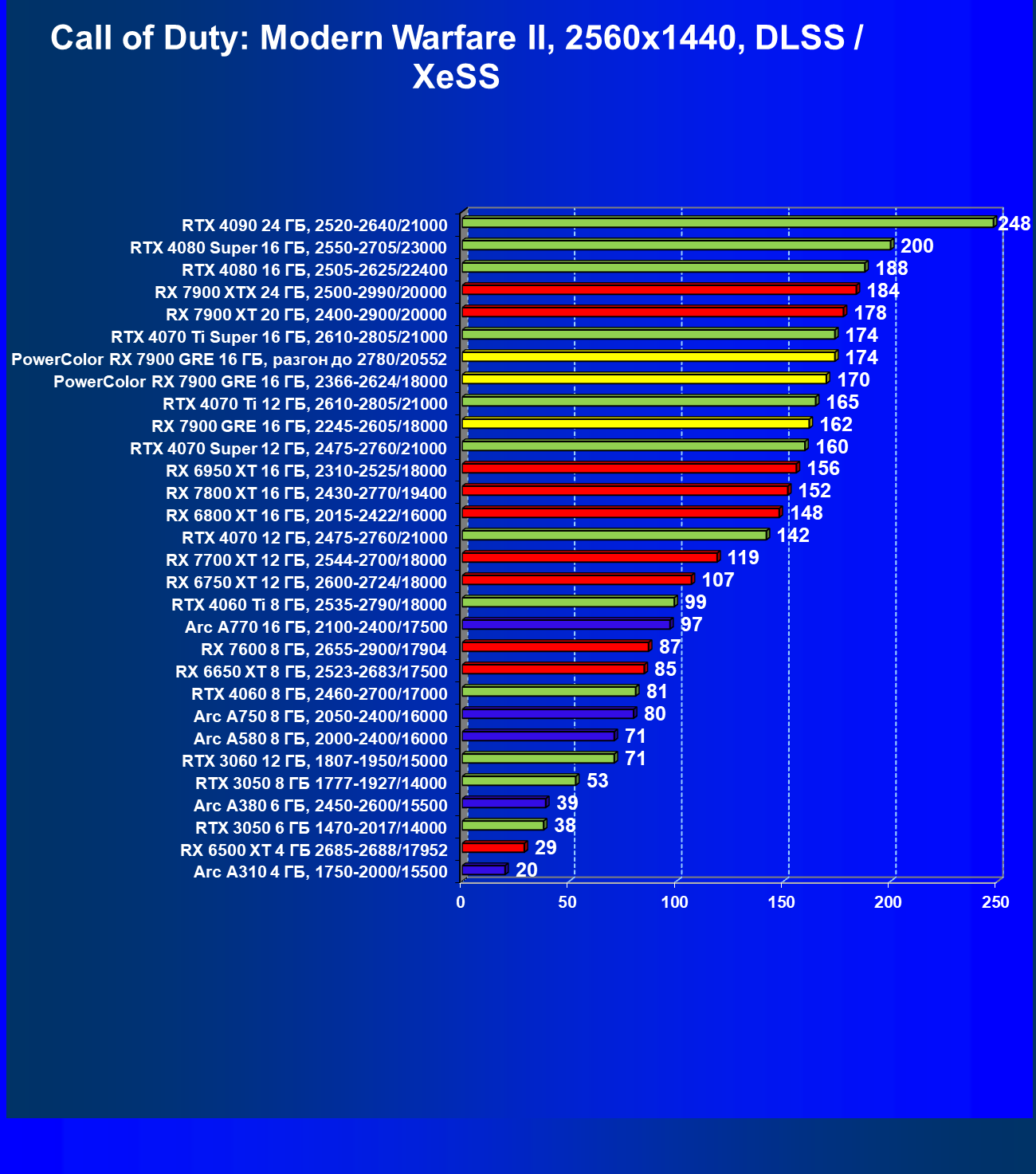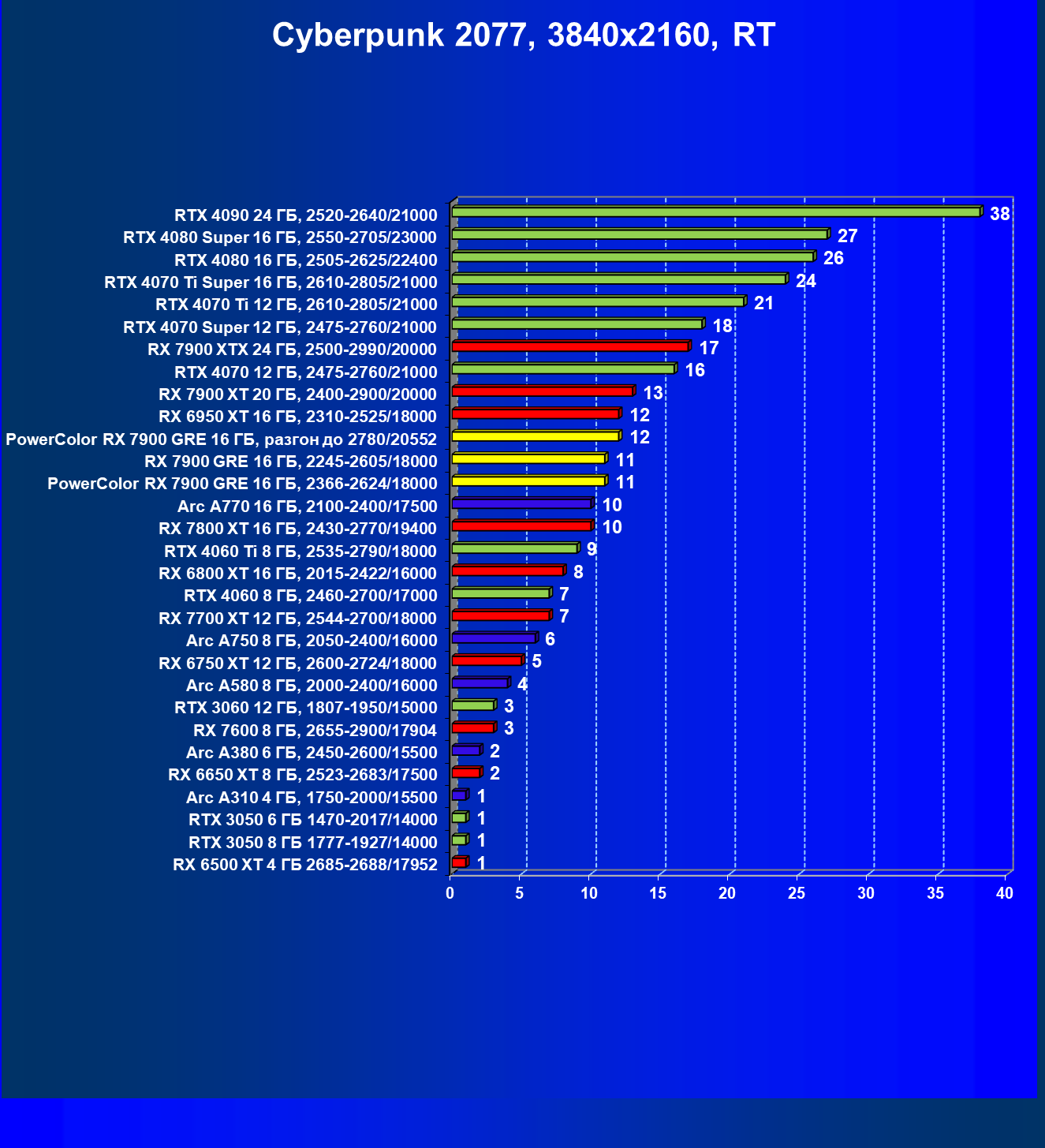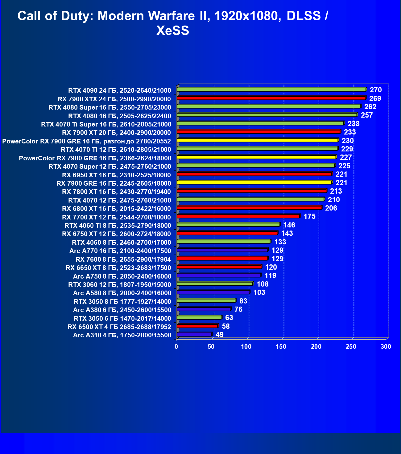 | 13 | PowerColor RX 7900 GRE 16 ГБ, разгон до 2780/20552 | 247 | 1654 | 67 000 |