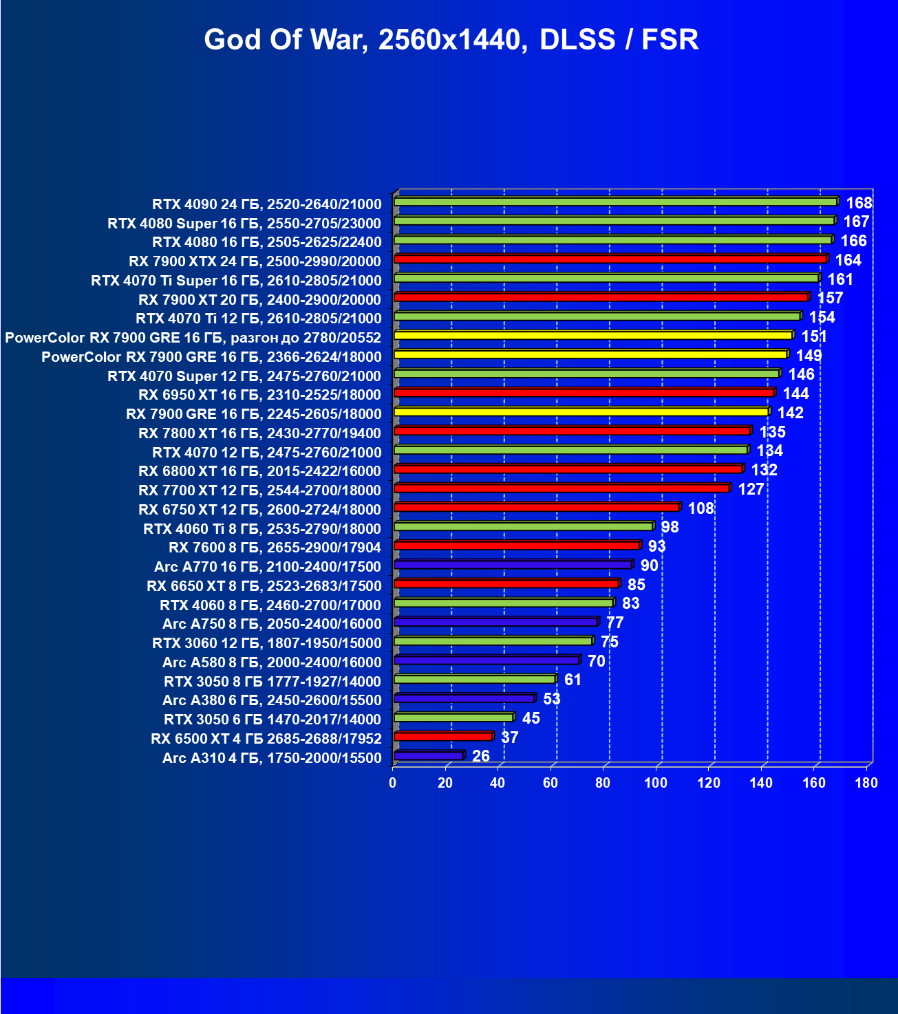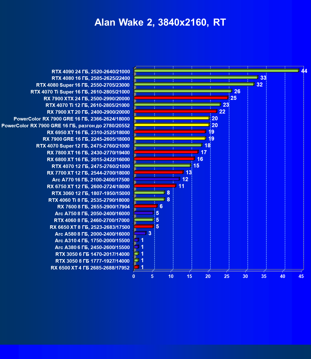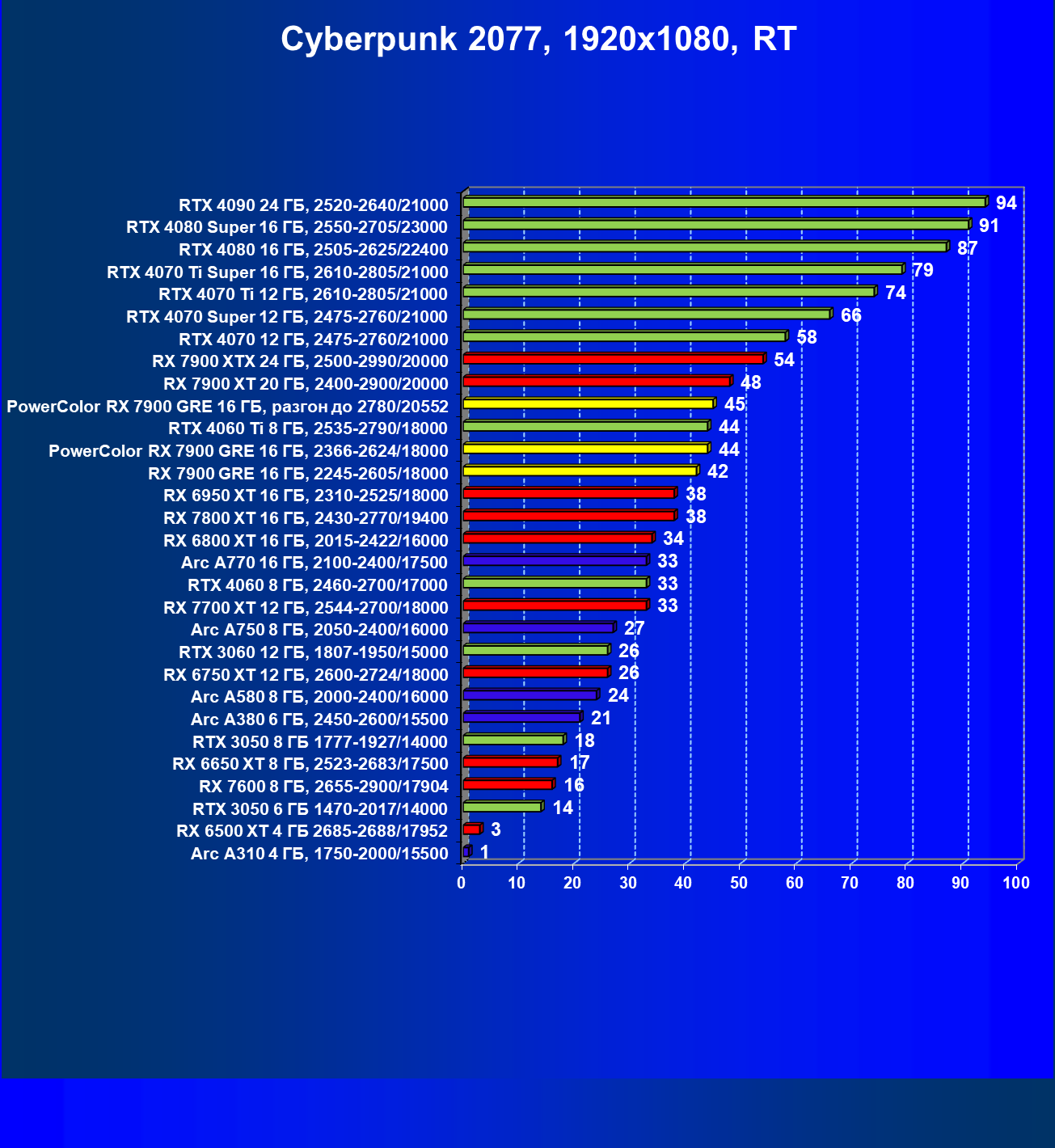 | 10 | PowerColor RX 7900 GRE 16 ГБ, разгон до 2780/20552 | 1654 | 247 | 67 000 |