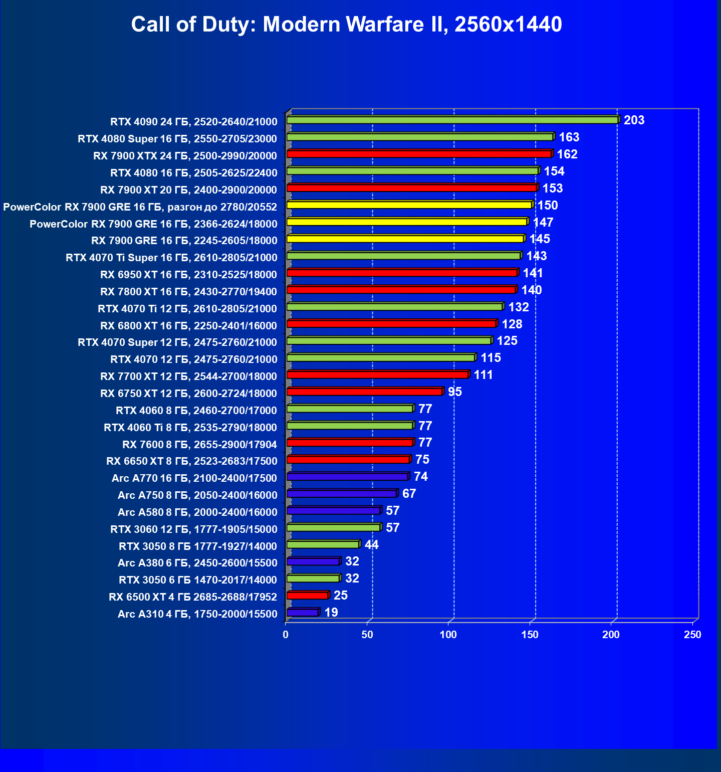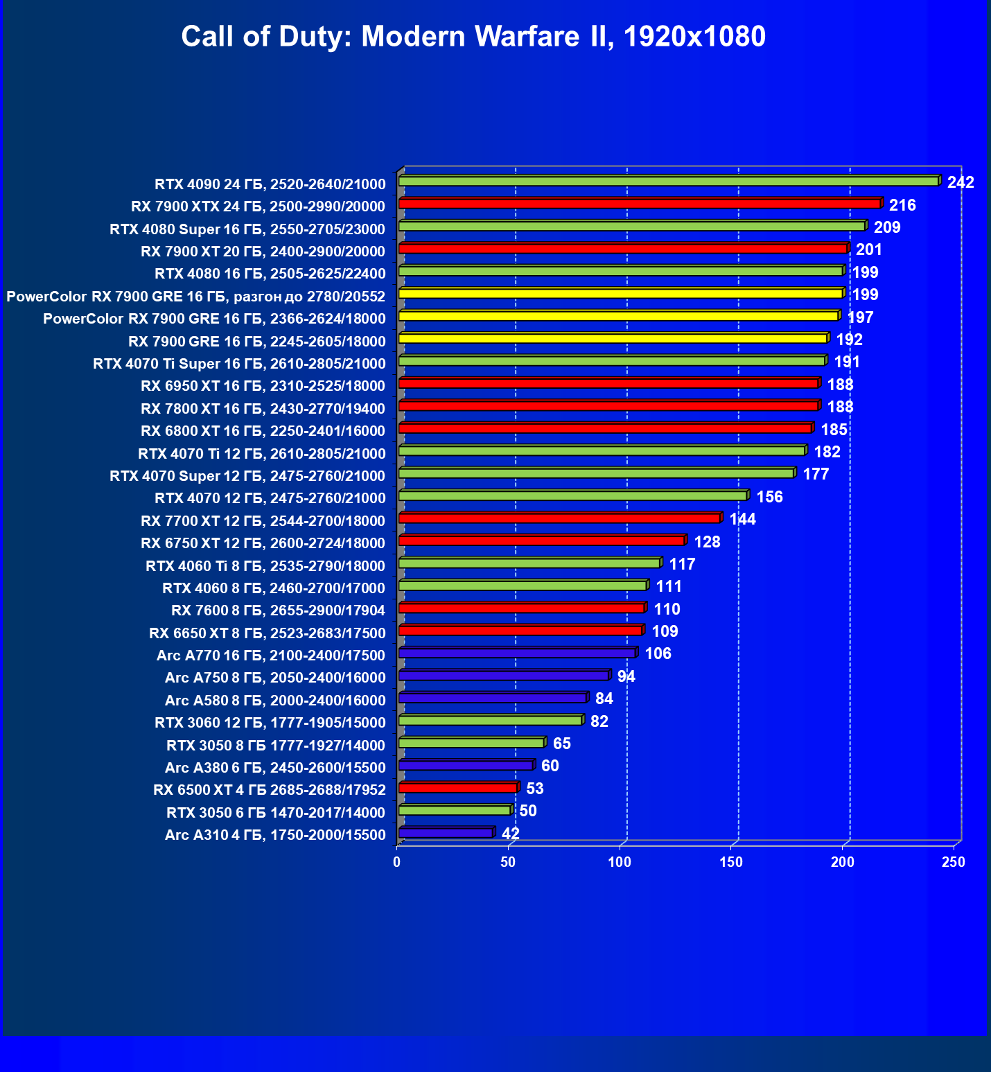| 15 | PowerColor RX 7900 GRE 16 ГБ, 2366—2624/18000 | 241 | 1613 | 67 000 |