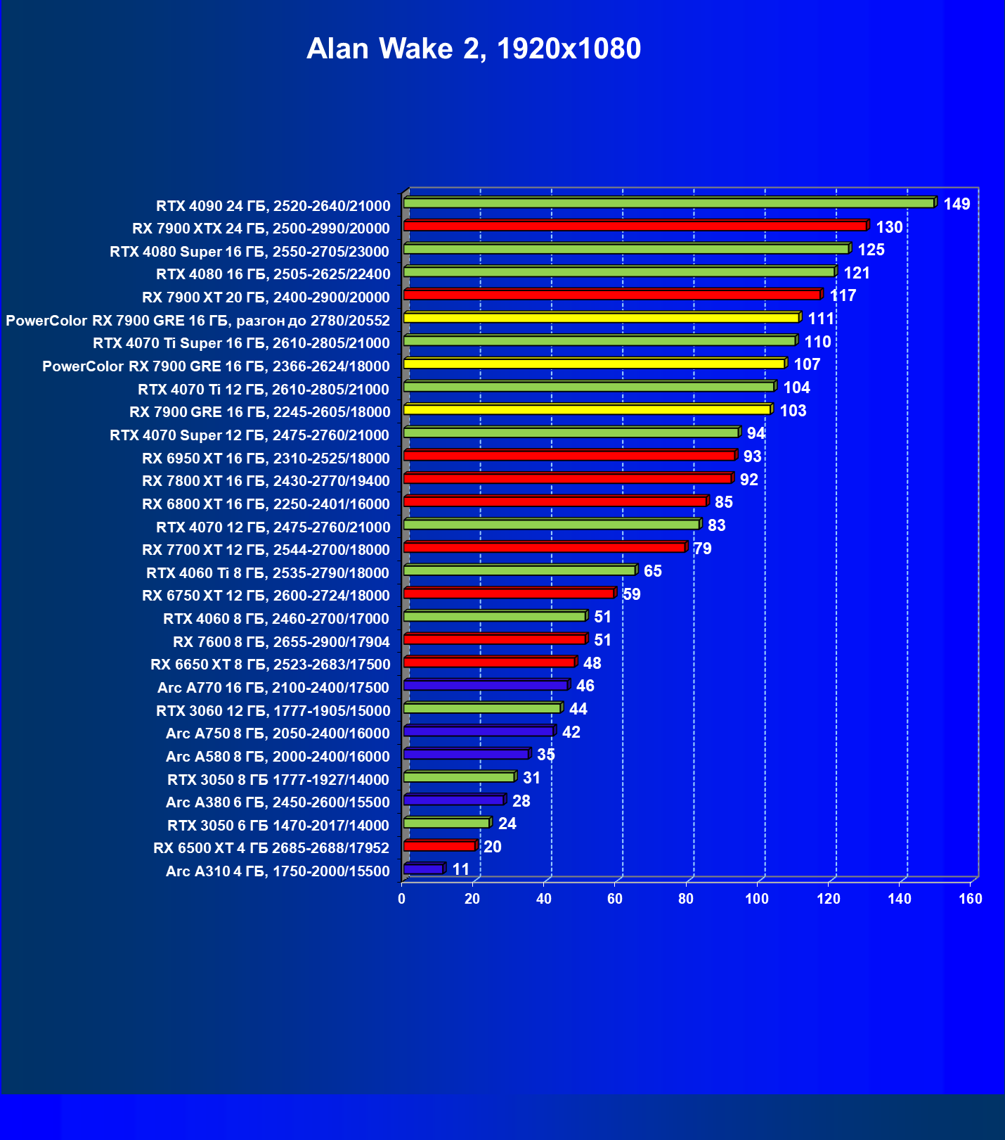 | 12 | RX 7900 GRE 16 ГБ, 2245—2605/18000 | 1545 | 231 | 67 000 |
