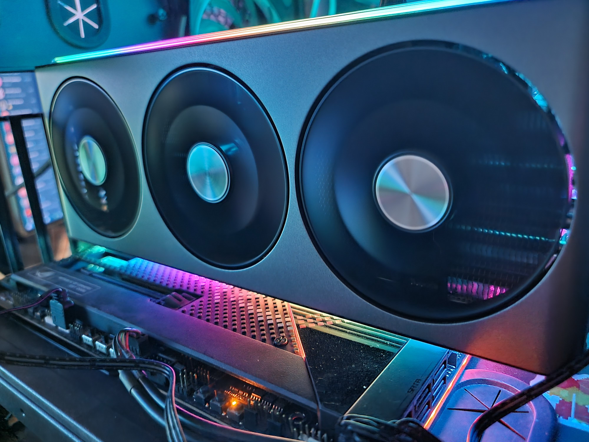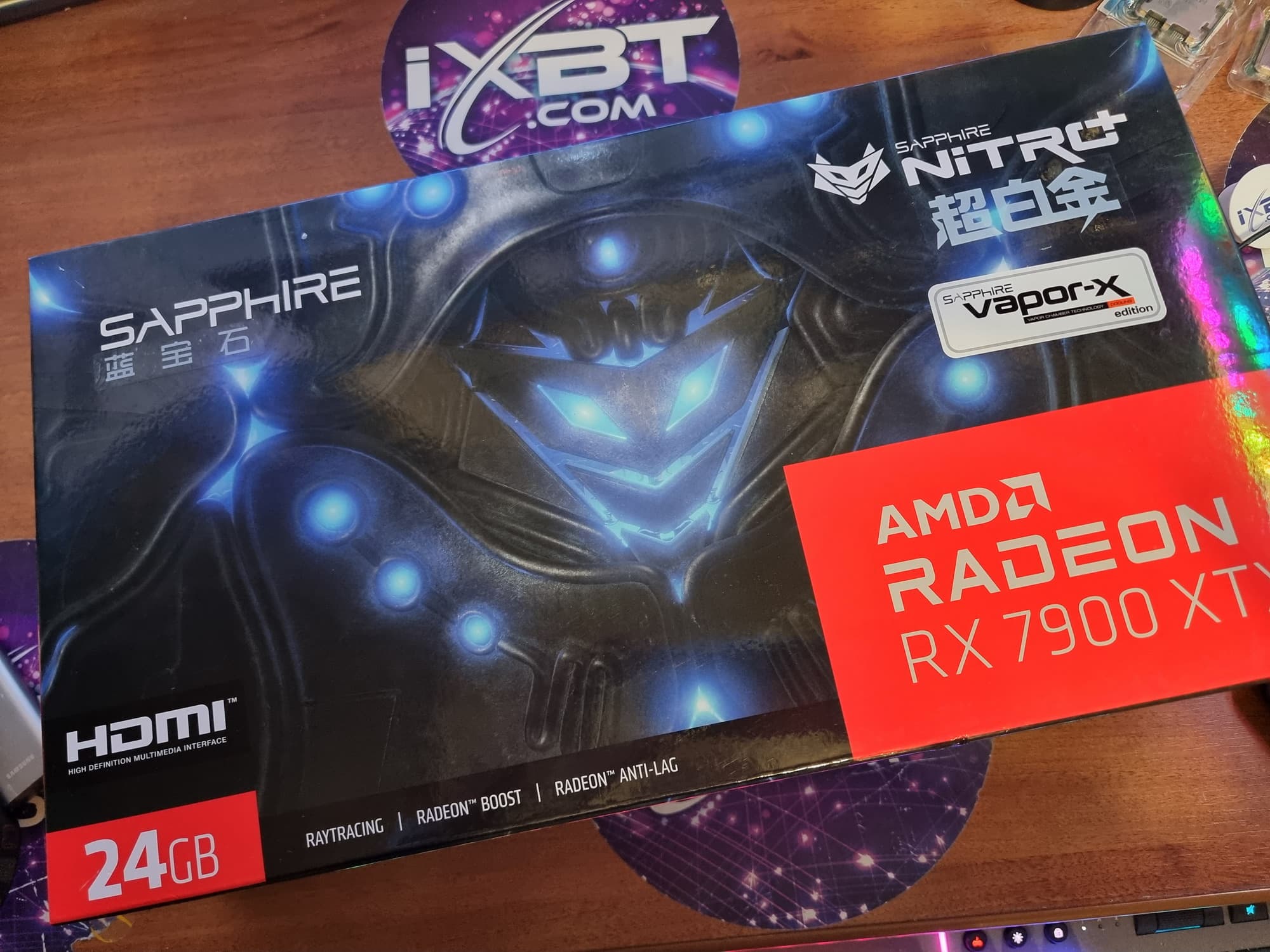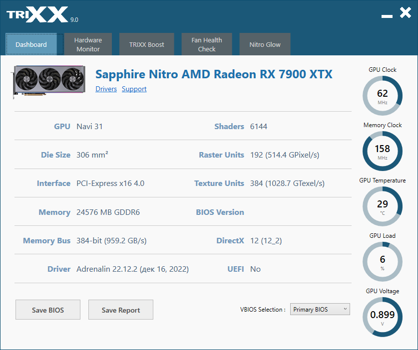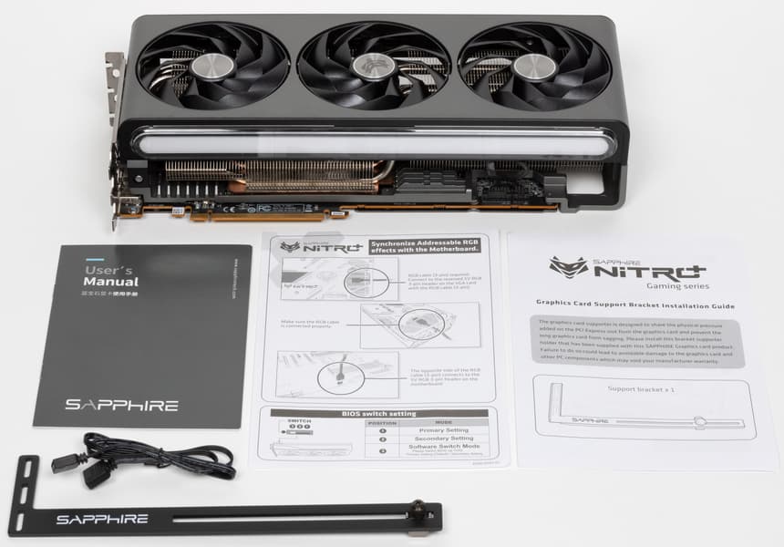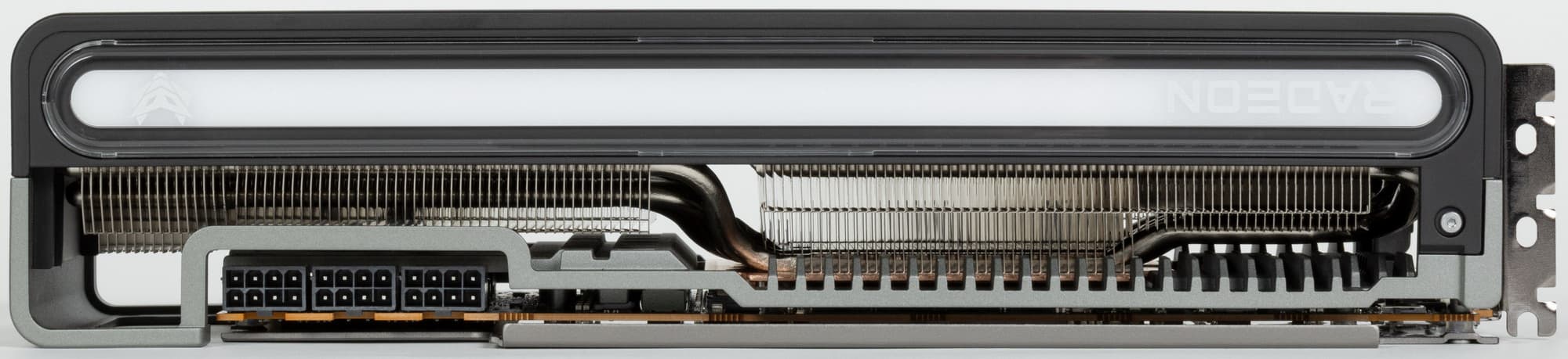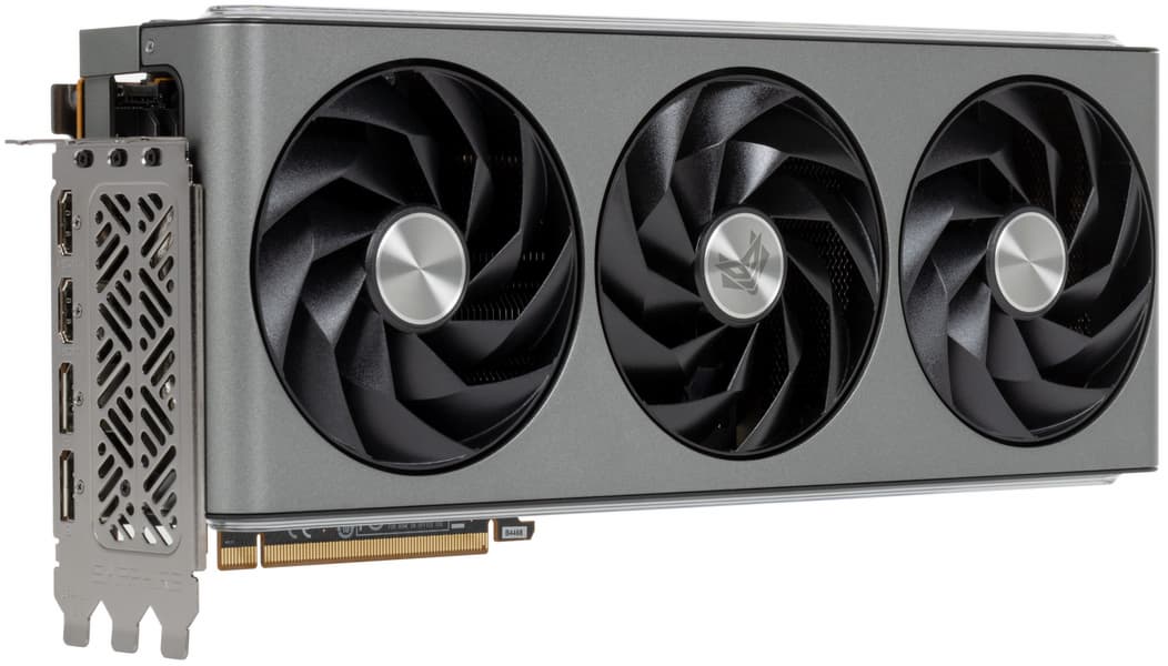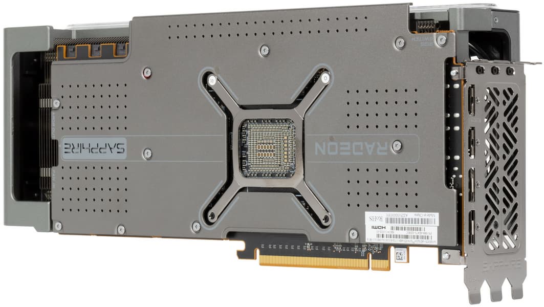 Конкретная протестированная нами видеокарта Sapphire Nitro+ Radeon RX 7900 XTX Vapor-X (24 ГБ) имеет огромные габариты, особенно по толщине, занимая 4 слота в системном блоке. СО у этой карты очень мощная, однако и шум в максимальном режиме очень существенный. Решение заключается в переключении карты на BIOS 2, где сильнее ограничено потребление, но потери производительности не так уж велики (3%-4%), а СО становится сравнительно тихой. Карта может потреблять примерно до 400 Вт (в режиме BIOS 2 — до 350 Вт), она требует использовать три 8-контактных разъема питания.