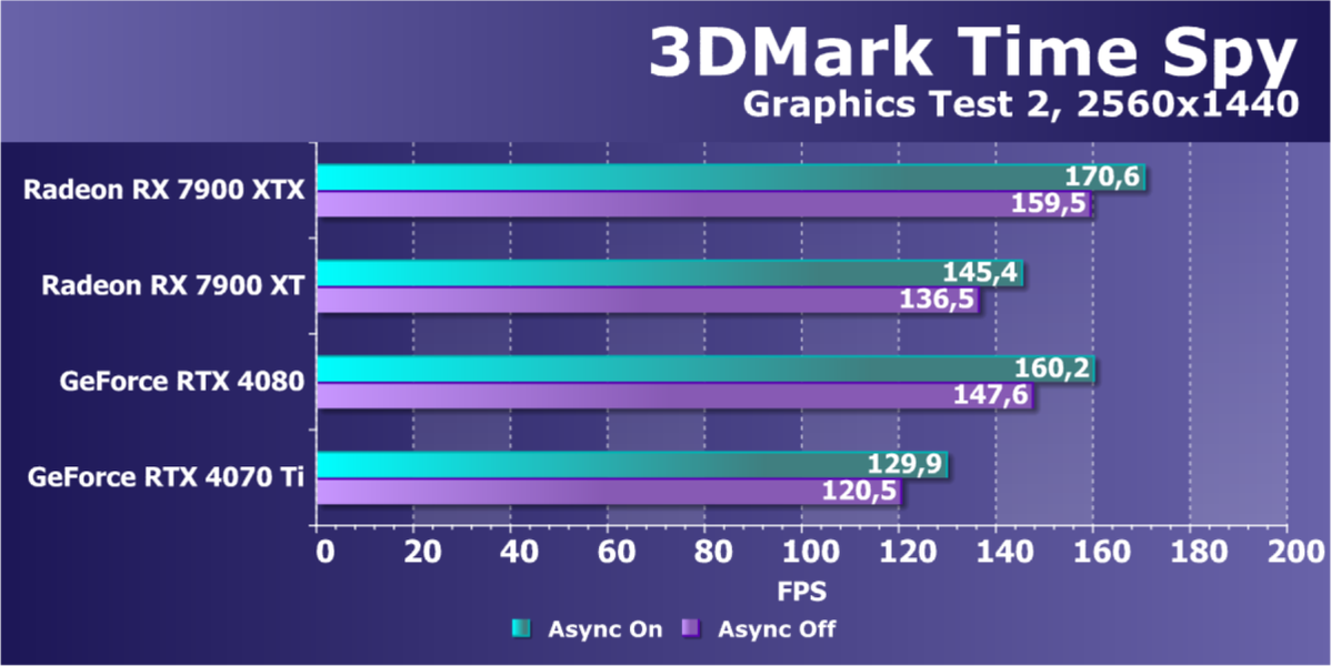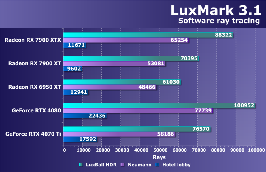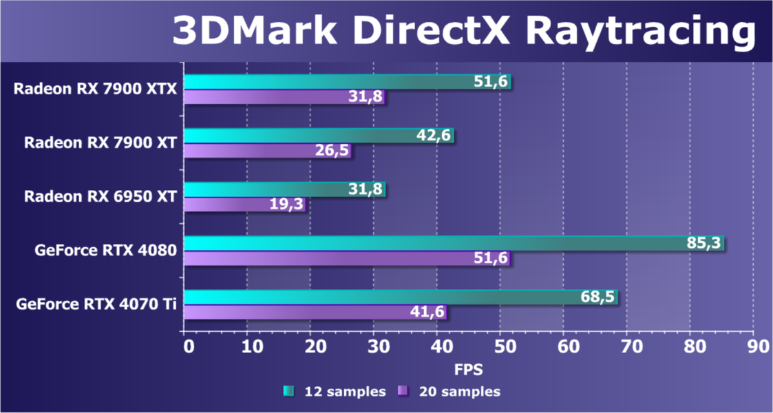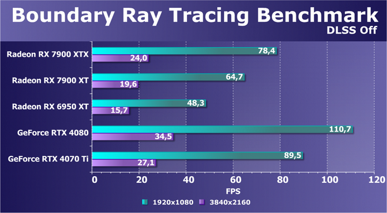 Если же включить аппаратную трассировку лучей в играх, то конкуренты RX 7900 XTX, созданные Nvidia, получат явное преимущество, и это важно потому, что трассировка лучей появляется во всё большем количестве игр, а нагрузка на соответствующие аппаратные блоки лишь увеличивается со временем. Ситуация с поддержкой трассировки в RDNA3 действительно улучшилась, но не настолько, чтобы догнать даже предыдущее поколение конкурента — Ampere. Но так как в играх трассировки не так уж много до сих пор, то для некоторых пользователей такое решение может показаться оптимальным.