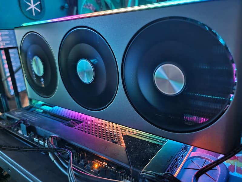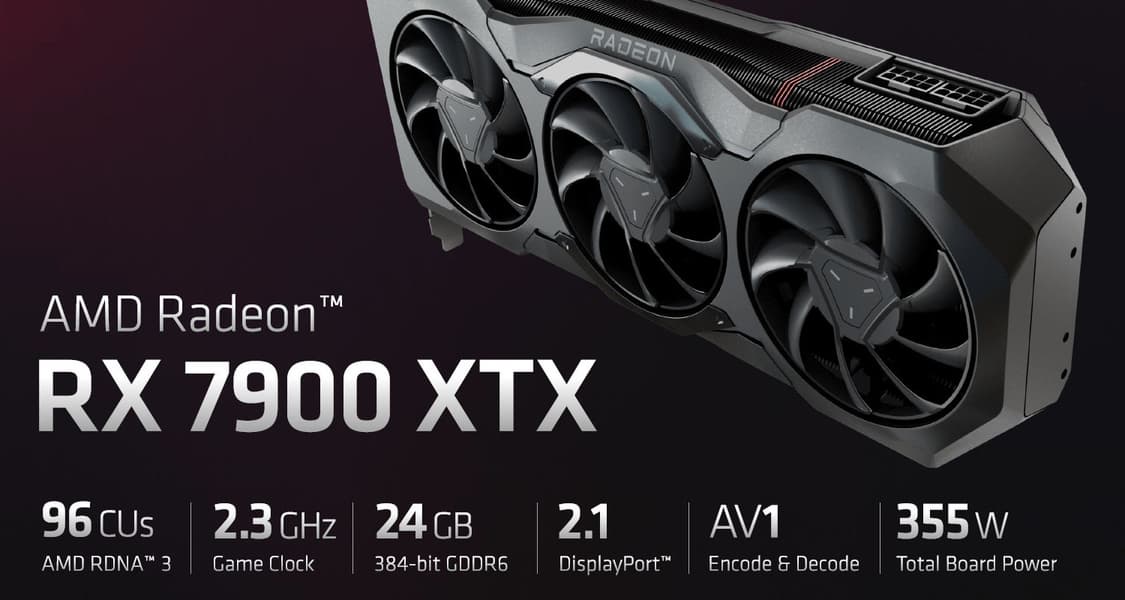 AMD Radeon RX 7900 XTX (24 ГБ) — флагманский ускоритель нового поколения AMD Radeon RX 7000, примерно соответствующий по скорости ускорителю Nvidia GeForce RTX 4080: в классических играх Radeon RX 7900 XTX чуть быстрее соперника, а в играх с RT немного отстает от него.