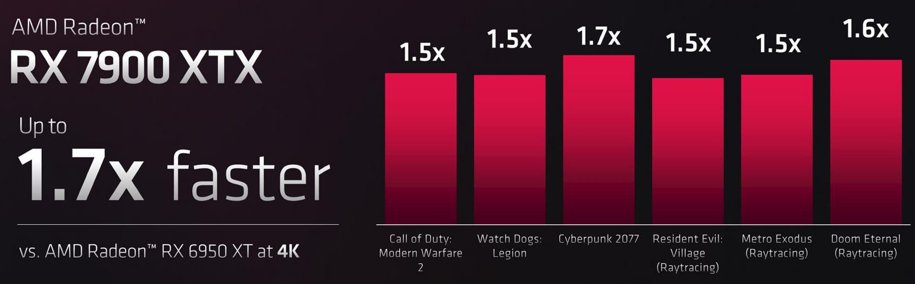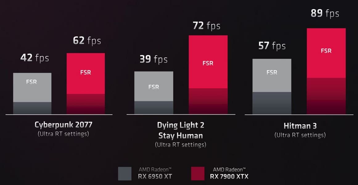 Благодаря новым оптимизациям, повышенной тактовой частоте и увеличенному количеству блоков ускорения трассировки лучей, в флагманском чипе RDNA3 обеспечивается повышение производительности при трассировке лучей до 1,8 раза по сравнению с лучшим решением архитектуры RDNA2. По данным самой компании, Radeon RX 7900 XTX обеспечивает в условиях активного использования трассировки лучей значительно более высокую частоту кадров по сравнению с RX 6950 XT из прошлого поколения: