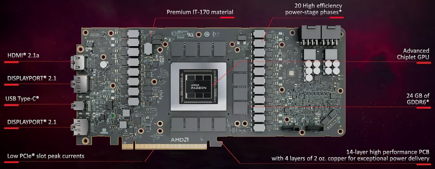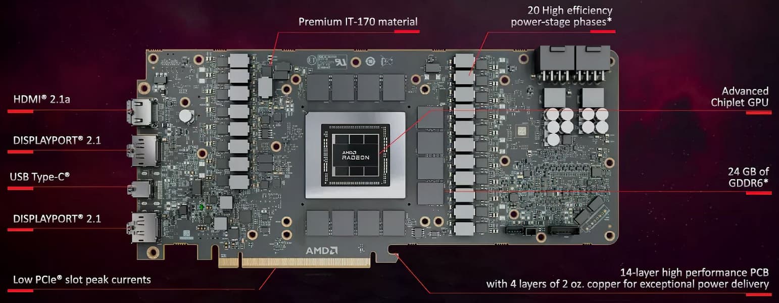 Новые модели видеокарт основаны на третьем поколении графической архитектуры — RDNA3, а графический процессор Navi 31 стал первым GPU, имеющим чиплетную конфигурацию из нескольких кристаллов на одной подложке, аналогично процессорам Ryzen. Чиплеты должны помочь в достижении лучшей производительности при сохранении невысокой сложности при меньшей себестоимости по сравнению с монолитным кристаллом. Кэш-память Infinity Cache и контроллеры GDDR6-памяти были перенесены на шесть маленьких кристаллов, которые производятся при помощи техпроцесса 6 нм, а основная часть GPU использует более совершенный техпроцесс 5 нм.