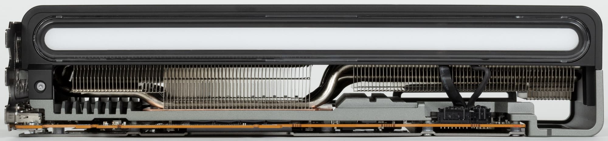 Референсный дизайн у моделей Radeon RX 7900 XT и RX 7900 XTX схожий, рассматриваемая сегодня старшая модель чуть больше младшей по всем размерам и имеет RGB-подсветку, в отличие от младшей, которую мы рассматривали в прошлый раз. Даже топовая модель на базе Navi 31 значительно меньше соответствующей ей по цене видеокарты компании Nvidia — RTX 4080, и для кого-то это может быть важным параметром при выборе. Для вывода изображения используются два стандартных разъема DisplayPort 2.1 и один HDMI 2.1, также есть разъем USB-C с поддержкой вывода DisplayPort — для использования с VR-шлемами.