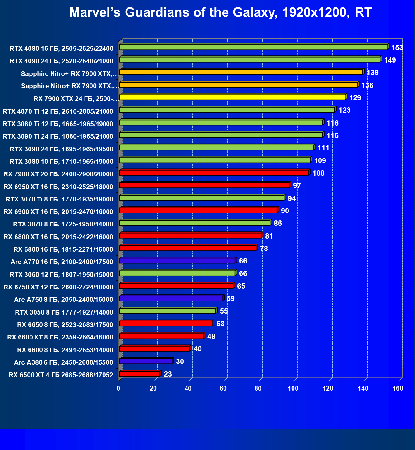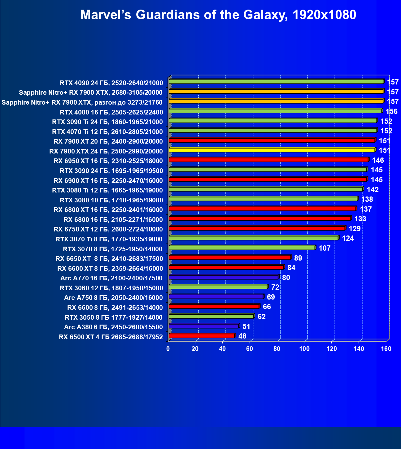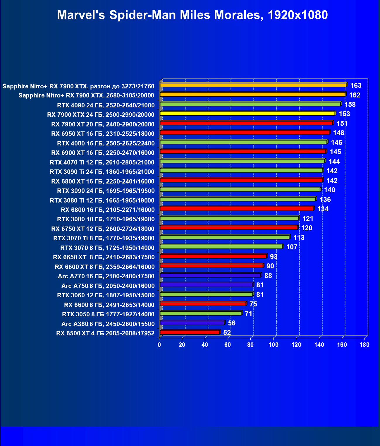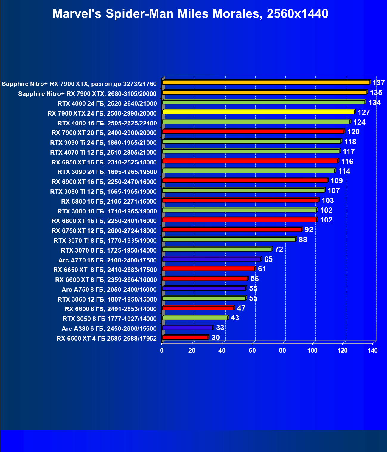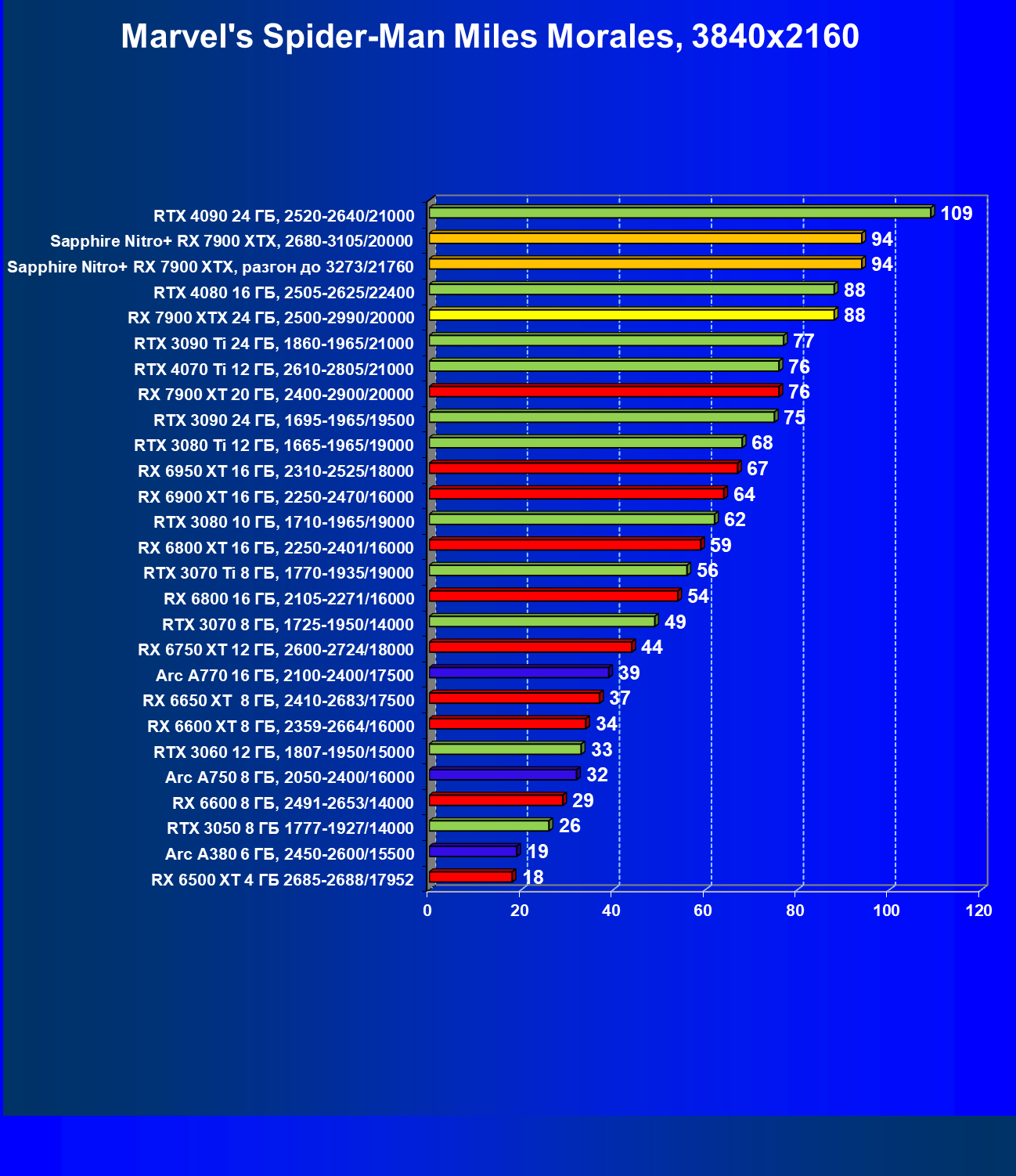 | 18 | Sapphire Nitro+ RX 7900 XTX, 2680—3105/20000 | 123 | 1351 | 110 000 |