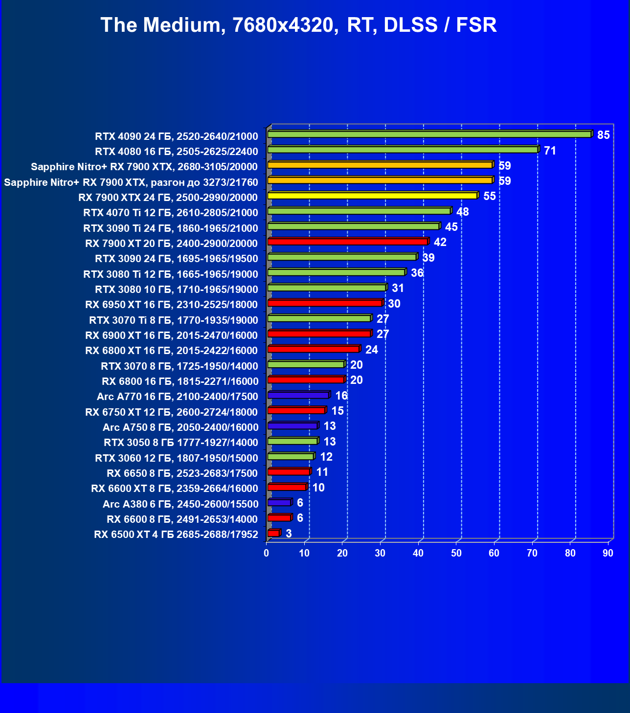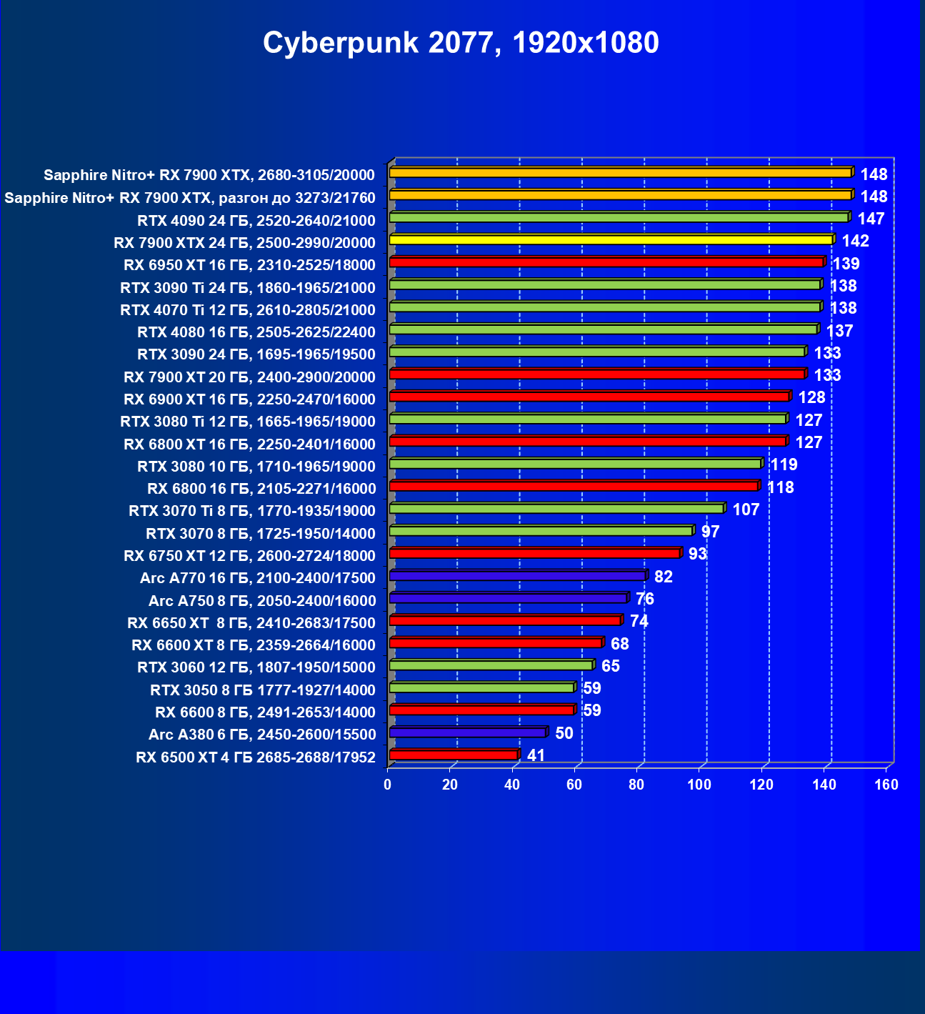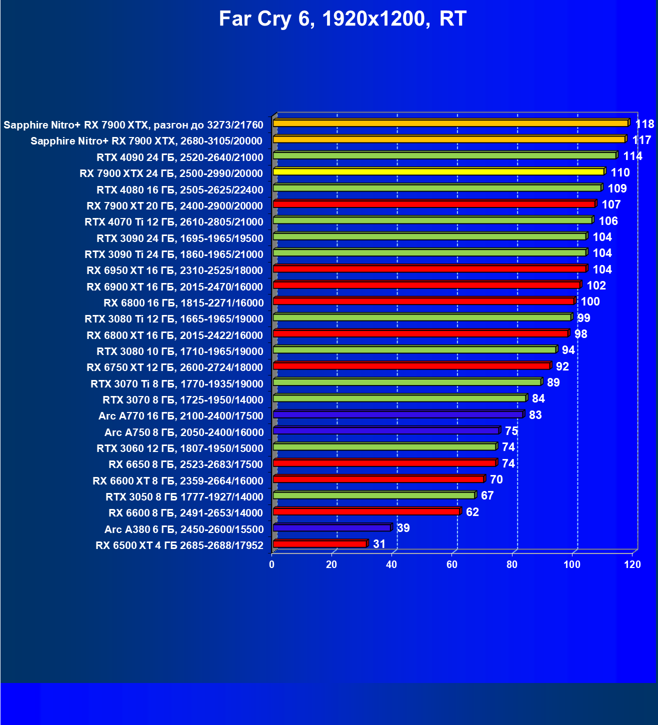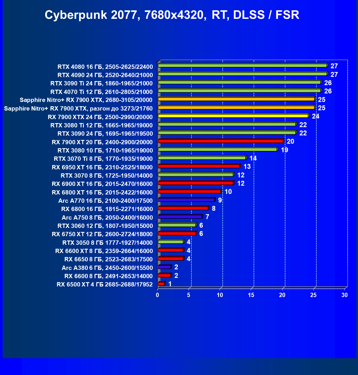 | 04 | Sapphire Nitro+ RX 7900 XTX, 2680—3105/20000 | 864 | 79 | 110 000 |