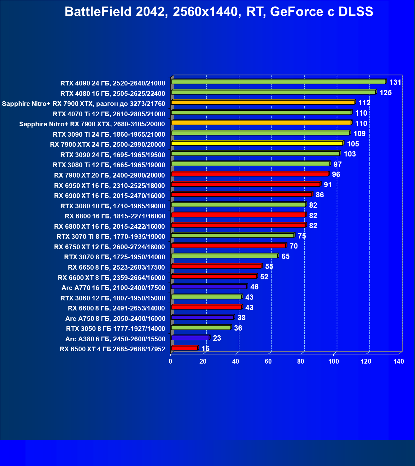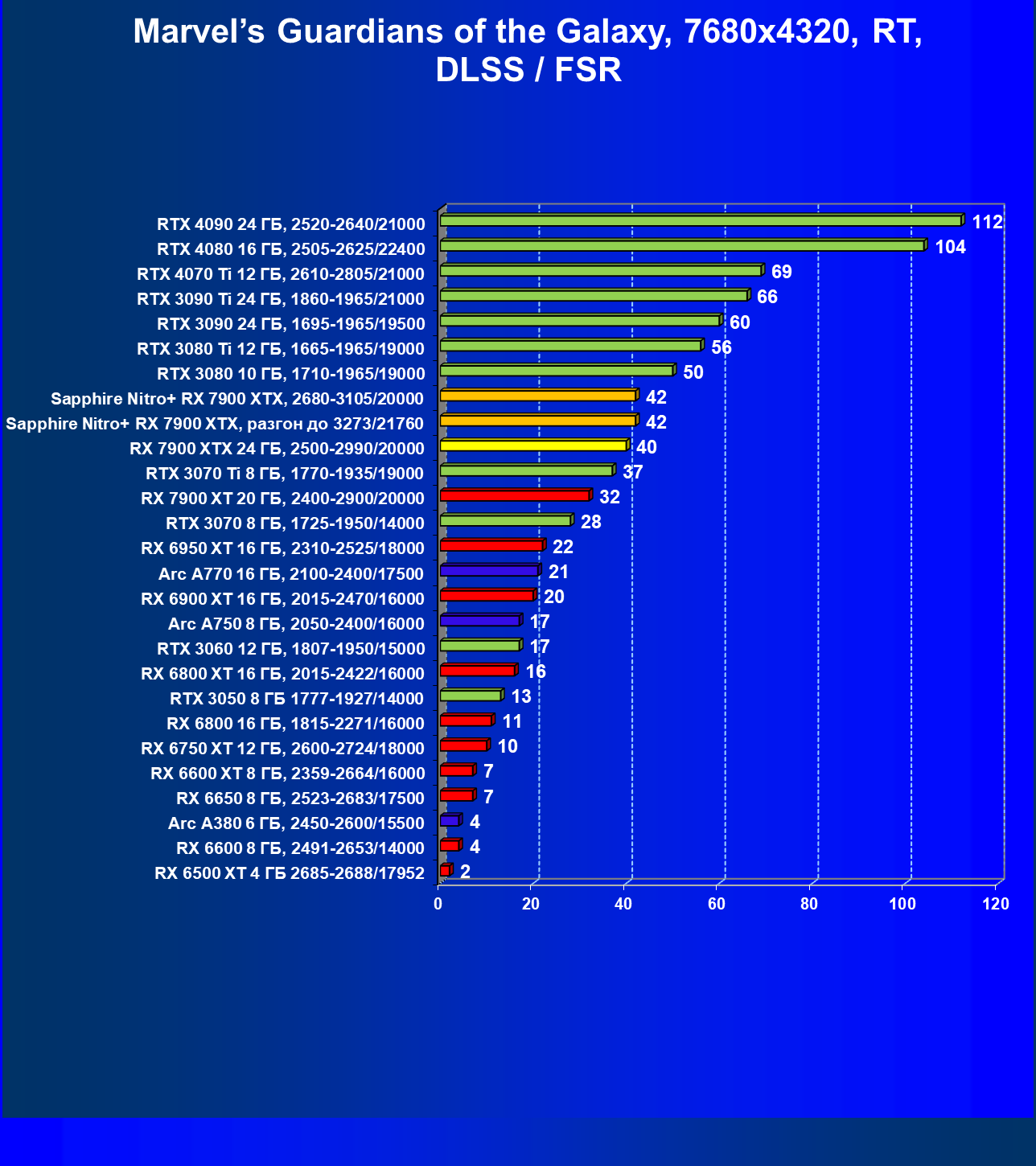 | 02 | Sapphire Nitro+ RX 7900 XTX, разгон до 3273/21760 | 570 | 52 | 110 000 |