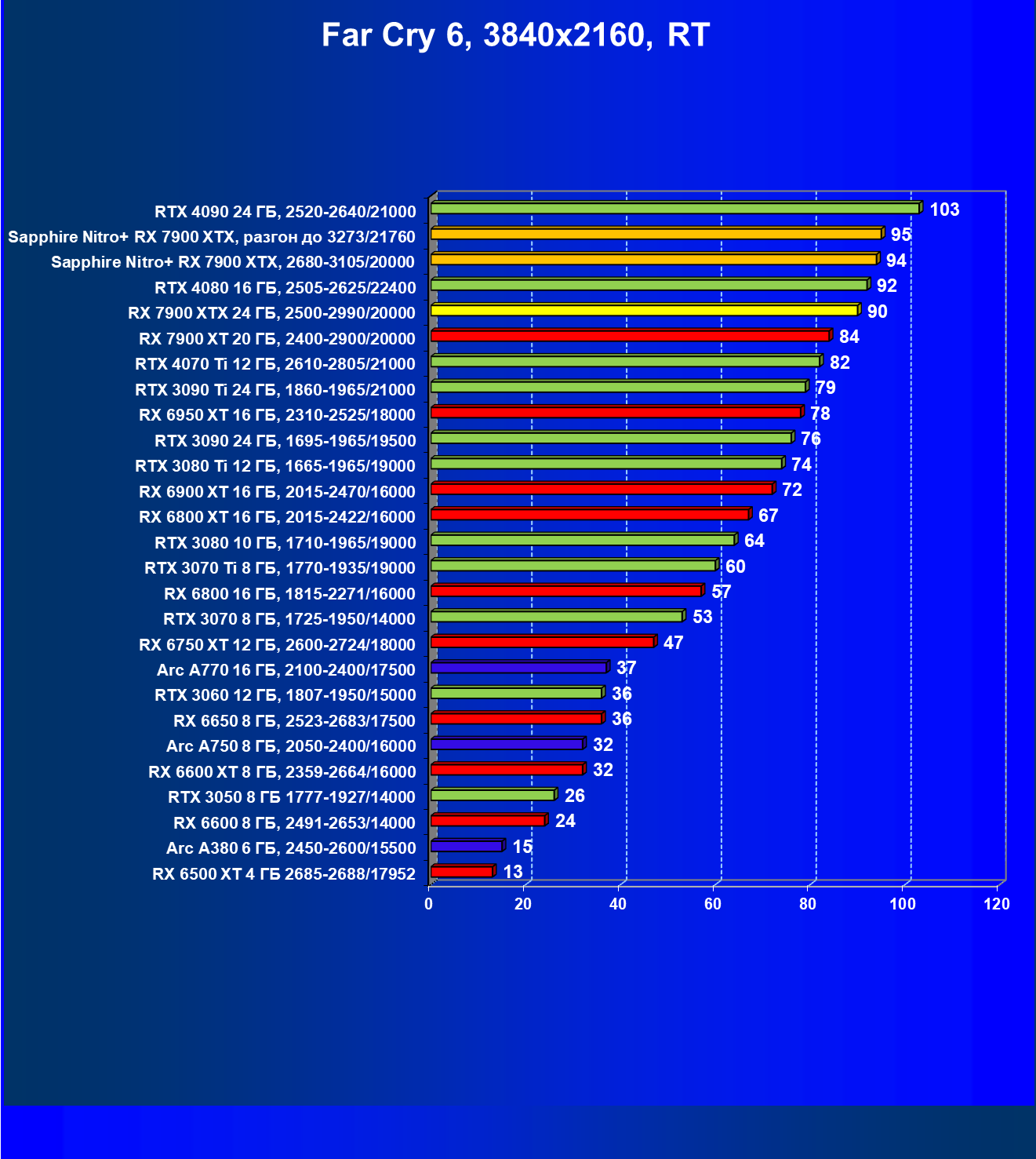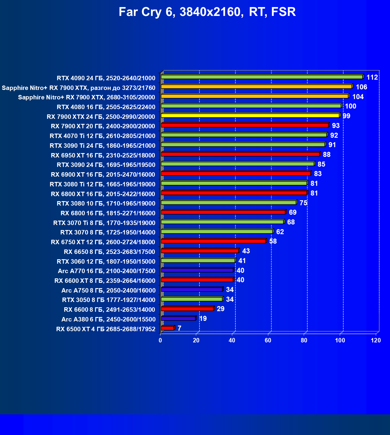 | 19 | RX 7900 XTX 24 ГБ, 2500—2990/20000 | 83 | 882 | 106 000 |