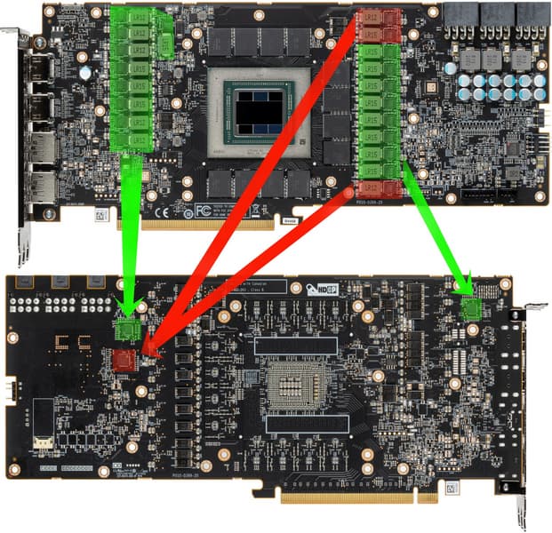 То есть хотя видеокарты AMD будет проще установить в уже имеющуюся систему, без нового (и довольно редкого пока что) блока питания, всего лишь два 8-контактных разъема на ней ограничивают максимальную мощность, подаваемую на видеокарту: 375 Вт в теории перекрывают заявленные 355 Вт потребления для RX 7900 XTX, но запаса не остается совсем. Неудивительно, что многие варианты видеокарт новой серии, особенно предназначенные для любителей разгона, имеют по три 8-контактных разъема.