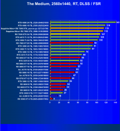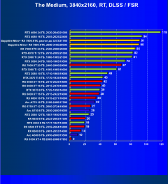 Рейтинг составлен по 9 тестам, в которых используется технология трассировки лучей и одновременно технология Nvidia DLSS, AMD FSR или Intel XeSS. Этот рейтинг нормирован по самому слабому ускорителю в данной группе — Radeon RX 6500 XT (то есть сочетание скорости и функций Radeon RX 6500 XT приняты за 100%).