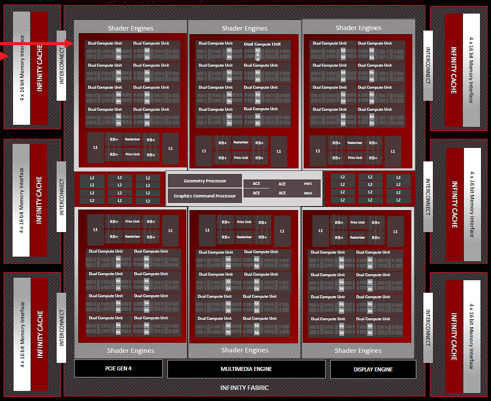Основной чиплет содержит шесть шейдерных движков, каждый из которых состоит из 16 вычислительных блоков (или восьми двойных вычислительных блоков RDNA3), имеющих по 1024 потоковых процессора. То есть всего в чипе содержится 6144 потоковых процессора, 96 ускорителей трассировки лучей и 96 ИИ-ускорителей. Также Navi 31 имеет 384 текстурных блока TMU и аж 192 блоков ROP — вполовину больше, чем Navi 21.