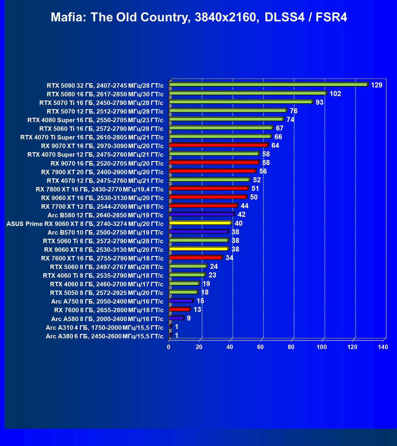 В данном случае ситуация уже несколько иная: вариант RTX 5060 Ti с 16 ГБ резко вышел вперед (понятно, что за счет поддержки и эффективного использования MFG в рамках DLSS4), и RX 9060 XT (16 ГБ) смог продемонстрировать в среднем производительность на уровне уже RTX 5060 Ti с 8 ГБ (который чуть дешевле). А вот Radeon RX 9060 XT (8 ГБ) уже оказался между RTX 5060 Ti (8 ГБ) и RTX 5060, уже сильно обгоняя RX 7700 XT. А карта Asus засчет фабрично поднятых частот смогла обойти даже сильно более дорогой RX 7800 XT, но всё равно догнать RTX 5060 Ti с 8 ГБ не смогла.