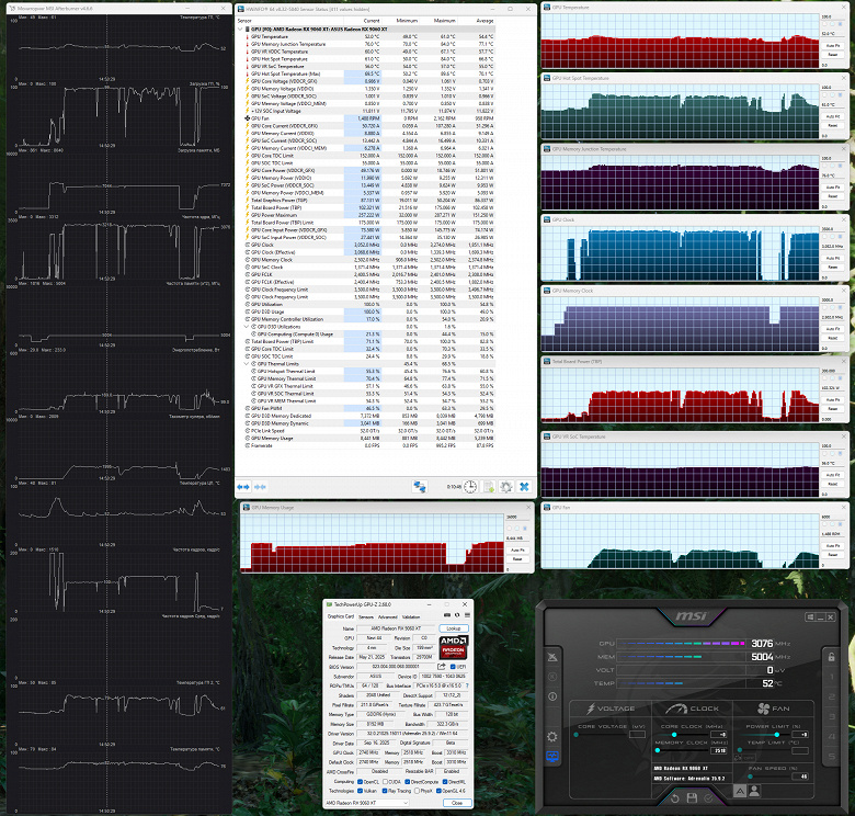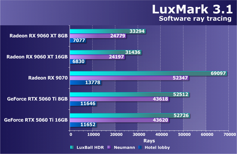 Еще раз отметим, что в классических играх производительность Radeon RX 9060 XT (с 8 и 16 ГБ памяти) позволяет получить высокий уровень комфорта в играх на максимальных настройках качества в разрешении 1080p (Full HD), во многих играх с Radeon RX 9060 XT (16 ГБ) можно хорошо поиграть и в разрешении 1440p (2.5K), но вариант с 8 ГБ в этом плане несколько хуже, с ним лучше ограничиться разрешением 1080p. Использование трассировки лучей надо обязательно сочетать с технологиями динамического масштабирования, и в таком случае можно получить высокую играбельность в 1080p, а в ряде случаев и в 1440p.