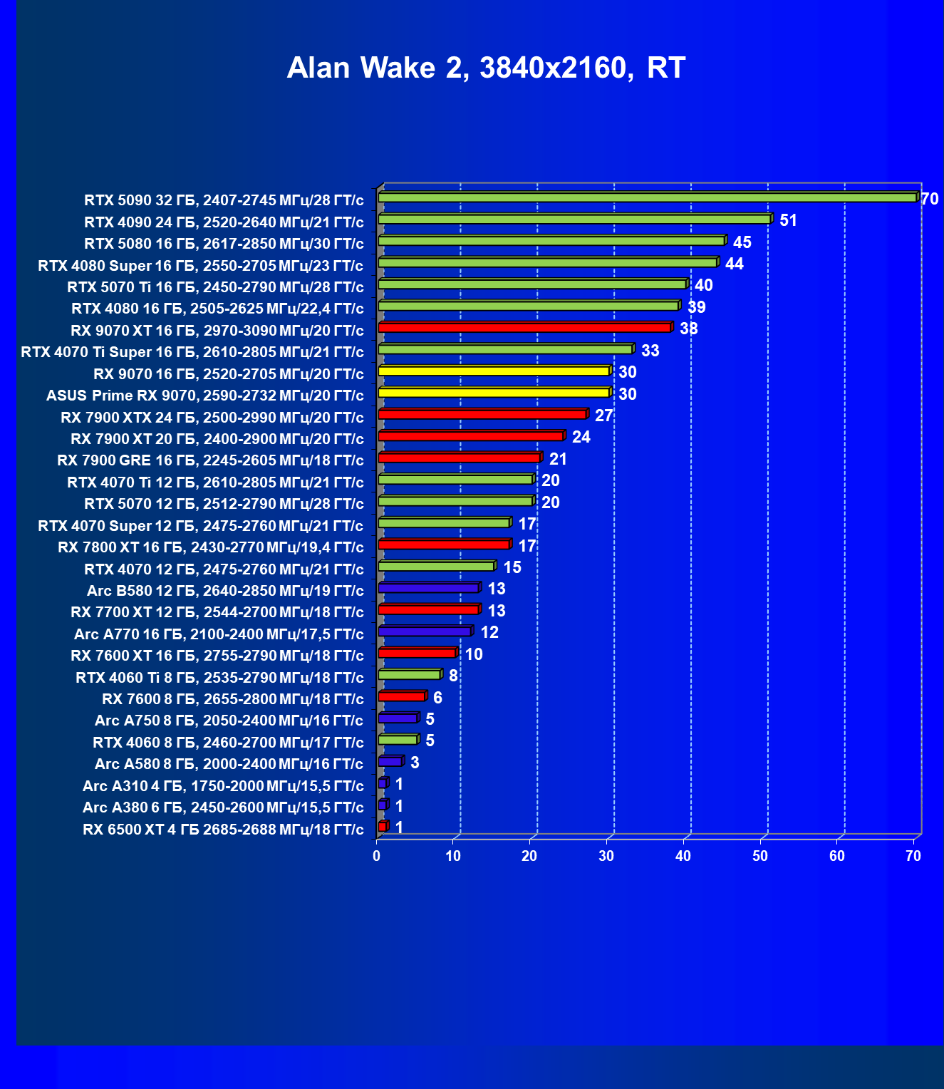 В играх с активным использованием трассировки лучей и разными видами динамического масштабирования (FSR/XeSS) Radeon RX 9070 находится на одном уровне с GeForce RTX 4070 Super и Radeon RX 7900 XTX. В разрешениях до 2.5K включительно он также позволяет получить хороший комфорт в играх на высоких настройках графики, а во многих играх аналогичный комфорт будет и в 4K, однако использование трассировки лучей надо обязательно сочетать с технологиями динамического масштабирования.