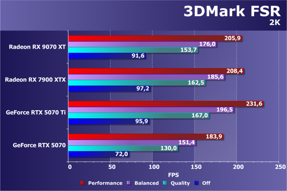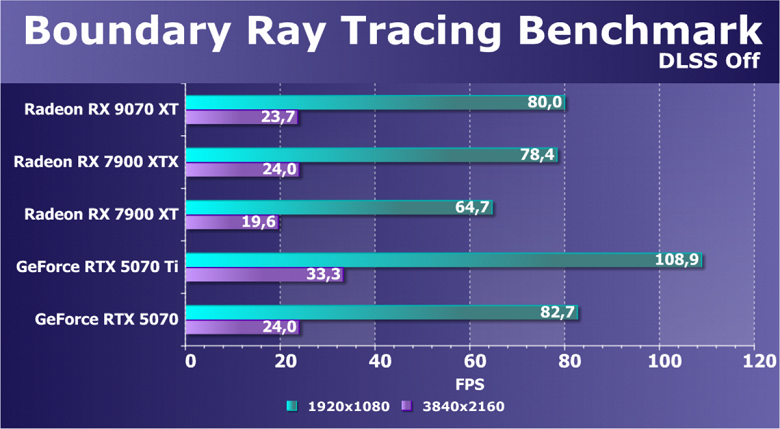 Еще раз отметим, что в классических играх Radeon RX 9070 XT может обеспечить высокий уровень комфорта в играх на максимальных настройках качества во всех разрешениях до 4K включительно. В играх с активной трассировкой лучей и разными видами апскейлинга (FSR/XeSS) Radeon RX 9070 XT позволит получить хороший комфорт в играх на высоких настройках графики в разрешениях до 2.5K включительно, а во многих играх приемлемая производительность будет и в 4K, однако в некоторых играх использование трассировки лучей надо сочетать с технологиями динамического масштабирования).