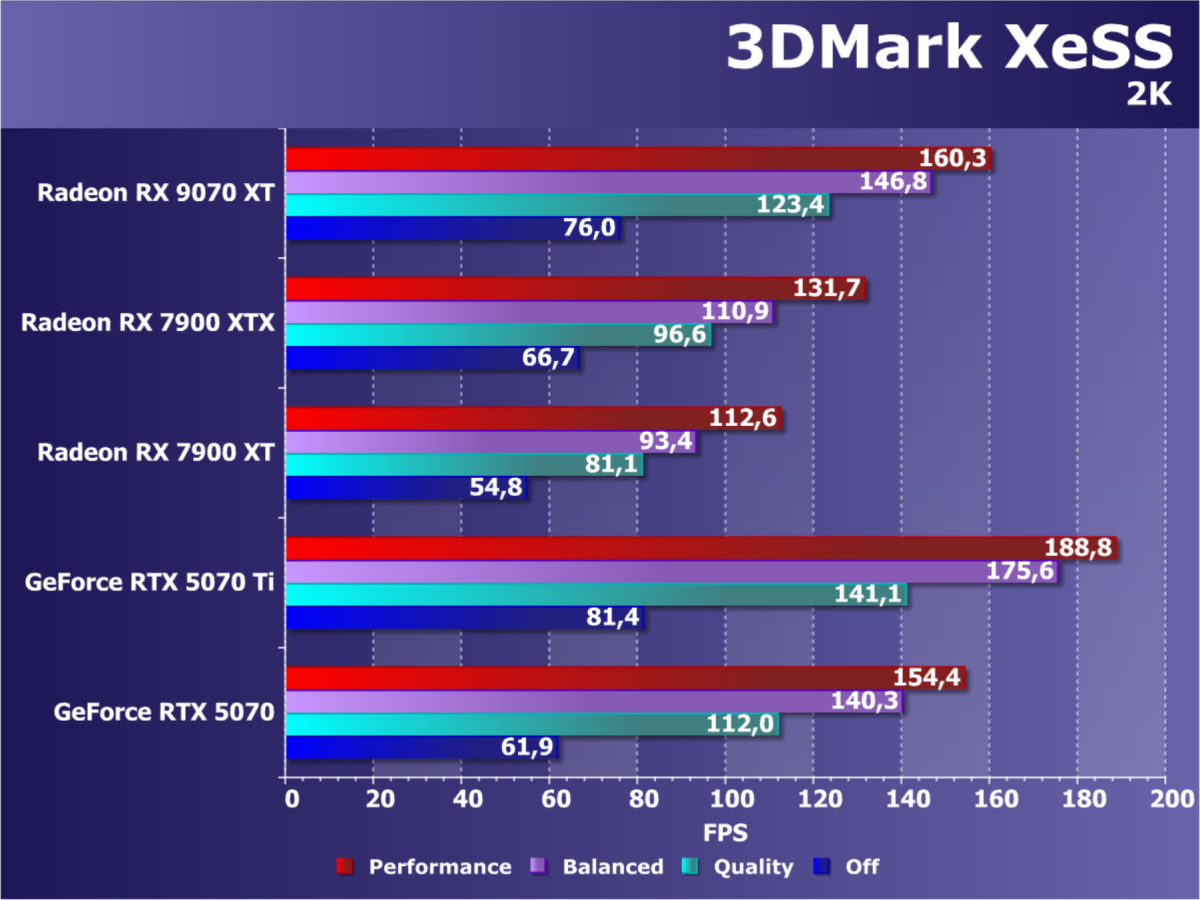 В играх с активной трассировкой лучей и разными видами апскейлинга (FSR/XeSS) Radeon RX 9070 XT находится на одном уровне с GeForce RTX 4070 Ti, чуть выше GeForce RTX 4070 Super и весьма существенно опережает флагмана предыдущего поколения Radeon RX 7900 XTX. В разрешениях до 2.5K включительно можно получить хороший комфорт в играх на высоких настройках графики, а во многих играх приемлемая производительность будет и в 4K, однако в некоторых играх использование трассировки лучей надо сочетать с технологиями динамического масштабирования).