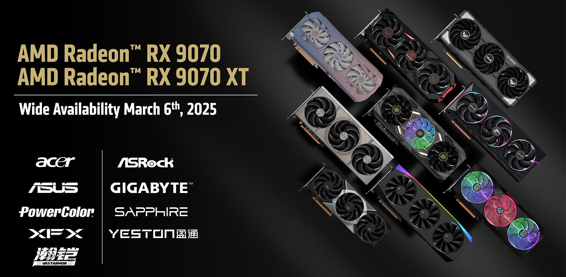 В этот раз AMD решила не выпускать на рынок собственные варианты видеокарт серии Radeon RX 9070 (XT). То, что показано у них на слайдах — всего лишь графические изображения видеокарт самой AMD, и они действительно существуют в физическом воплощении, но лишь внутри компании. А на рынке таких продуктов именно производства AMD нет — все видеокарты серии Radeon RX 9070 будут производиться партнерами компании. Они получили очень разные тактовые частоты и уровни энергопотребления, а также системы охлаждения. Все видеокарты имеют разъем PCIe 5.0 x16, а стандартные варианты потребляют до 304 Вт энергии — это меньше, чем у предыдущего флагмана, но варианты производителей отличаются в том числе бо́льшим уровнем потребления.