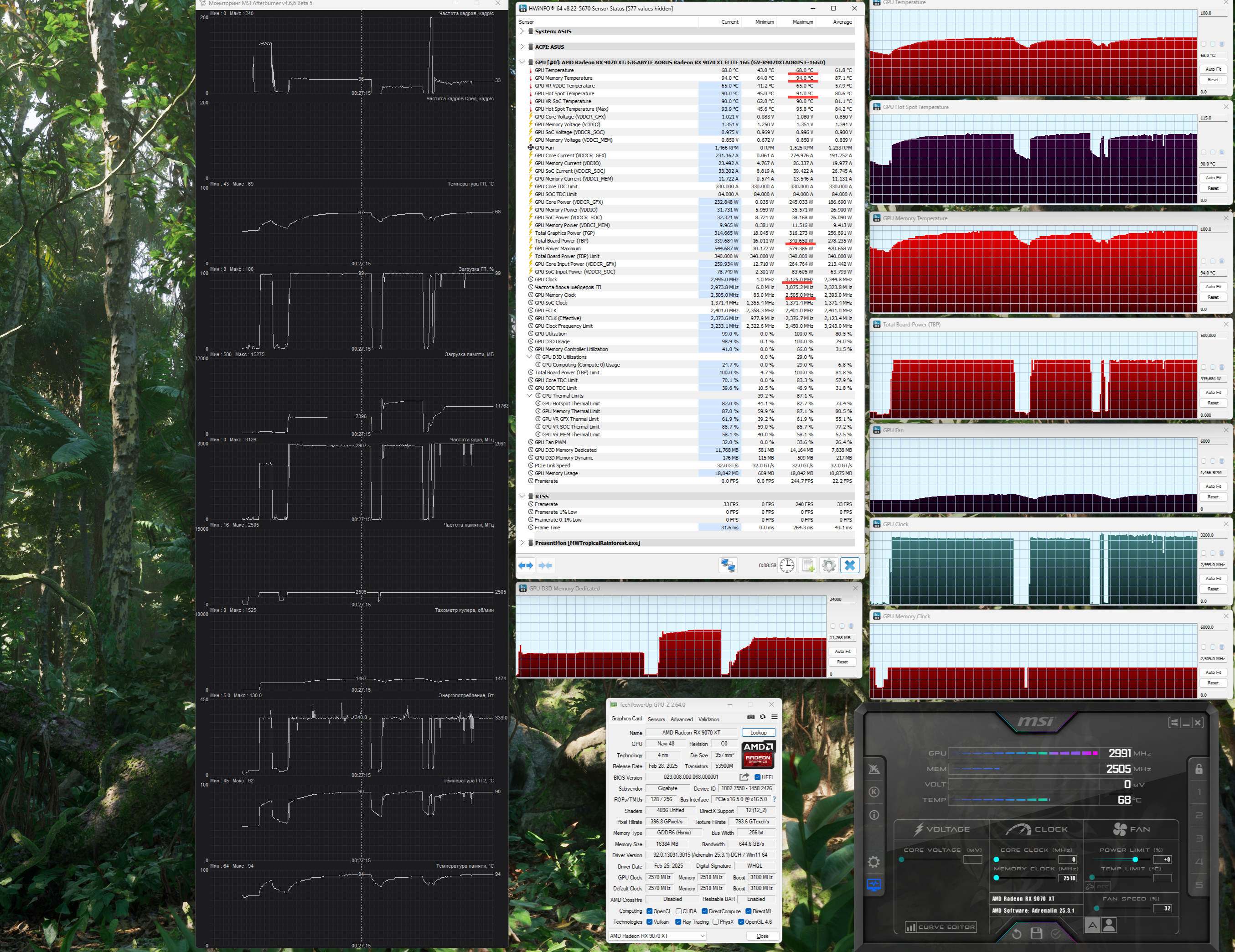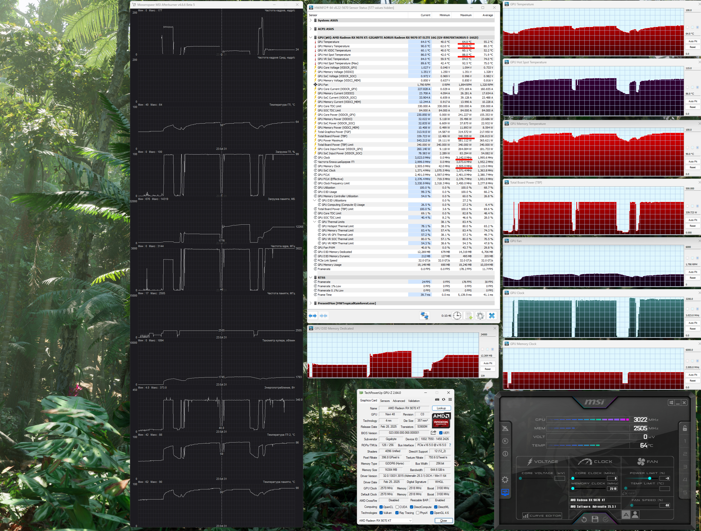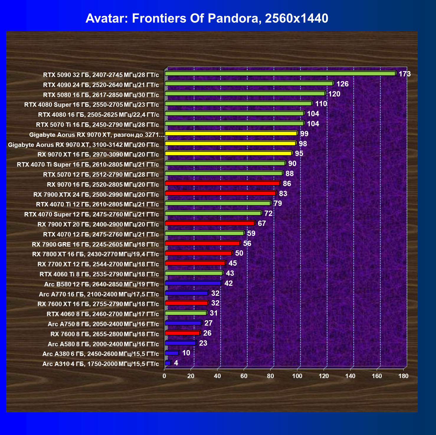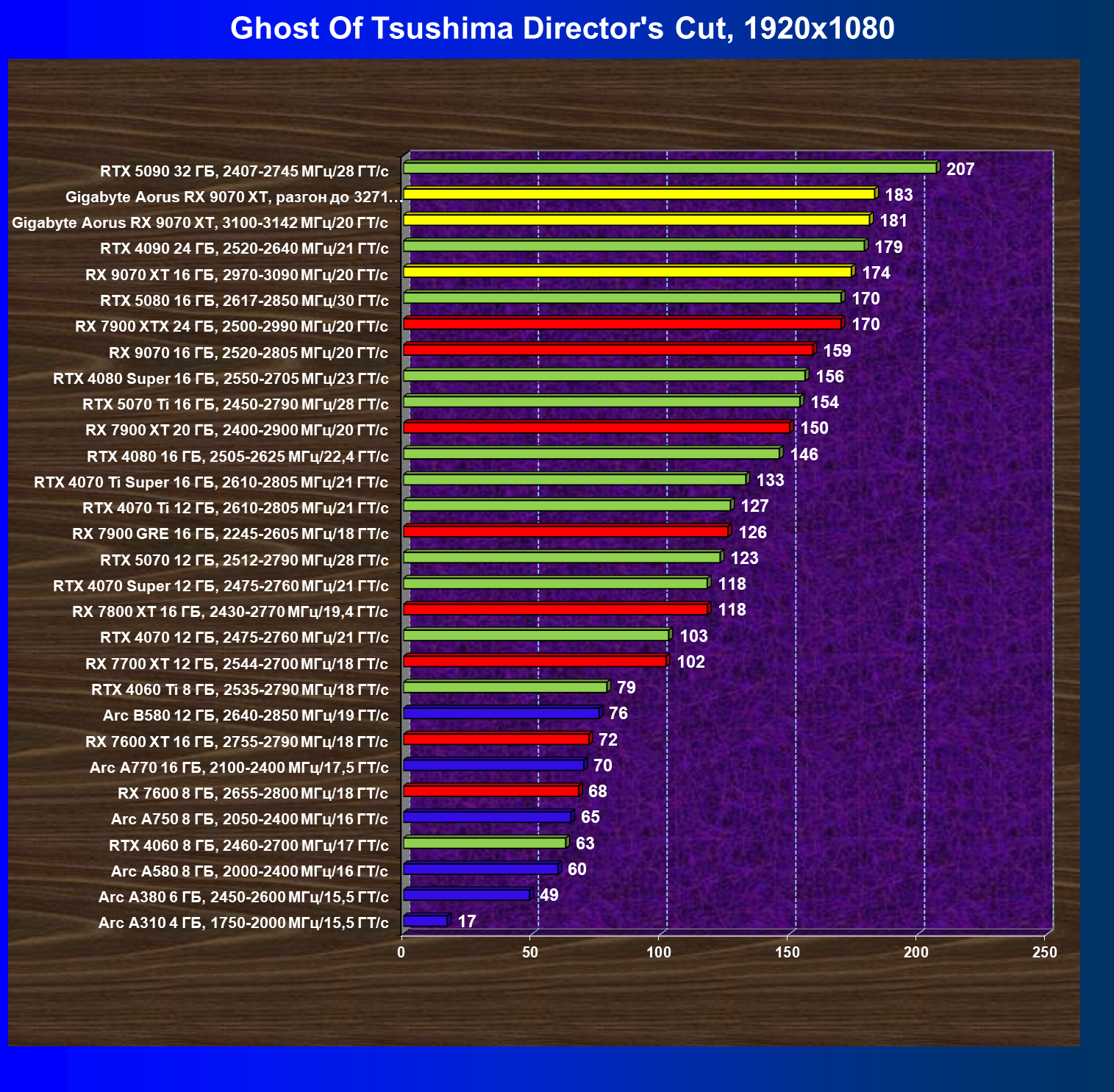 | 06 | Gigabyte Aorus RX 9070 XT, 3100—3142 МГц/20 ГТ/с | 1824 | 167 | 109 000 |