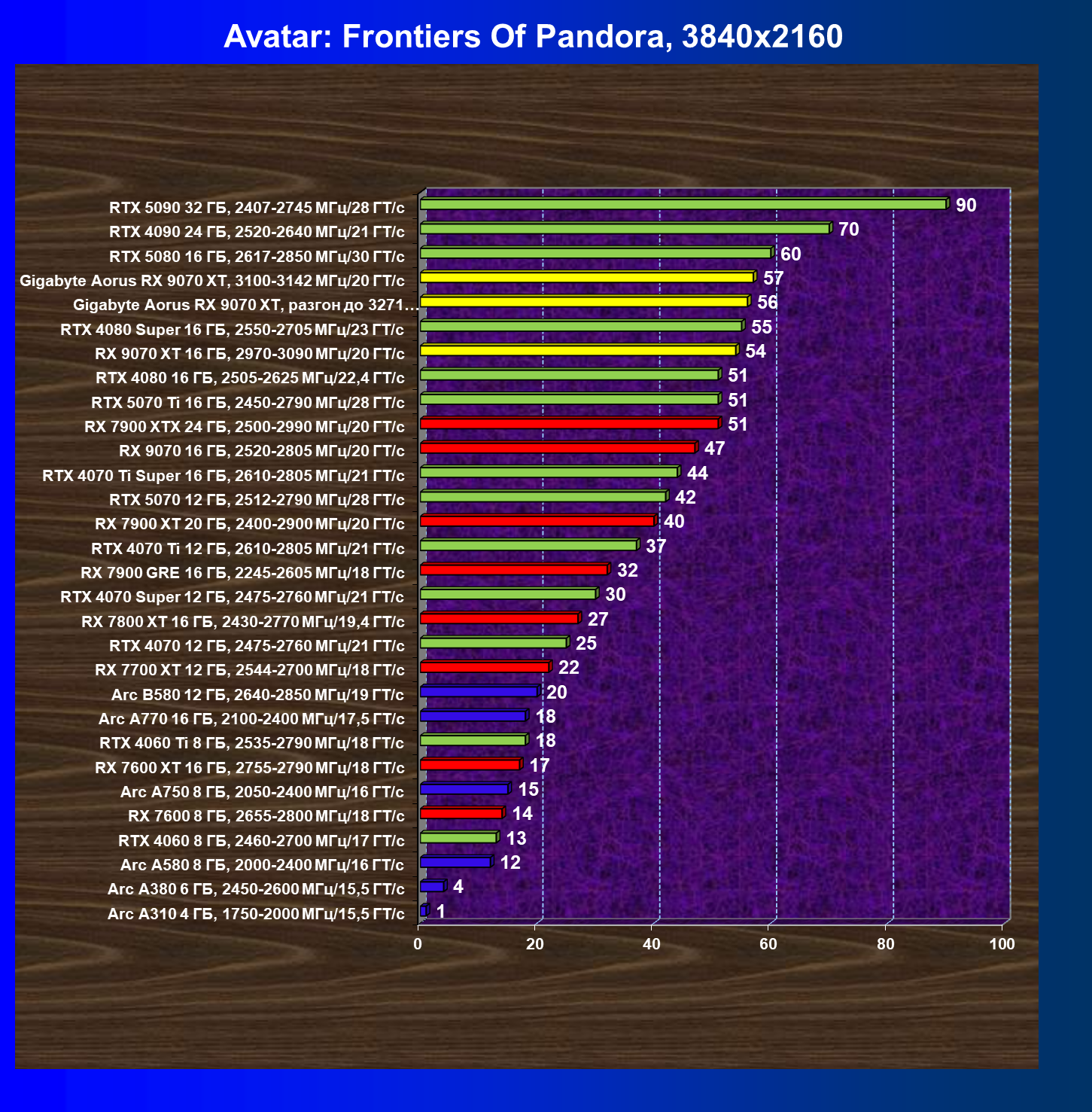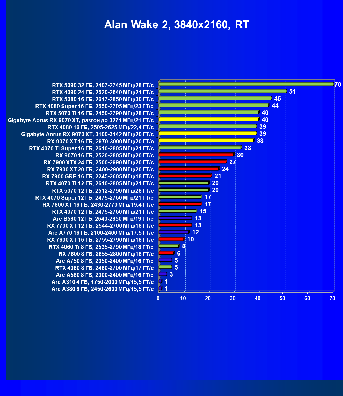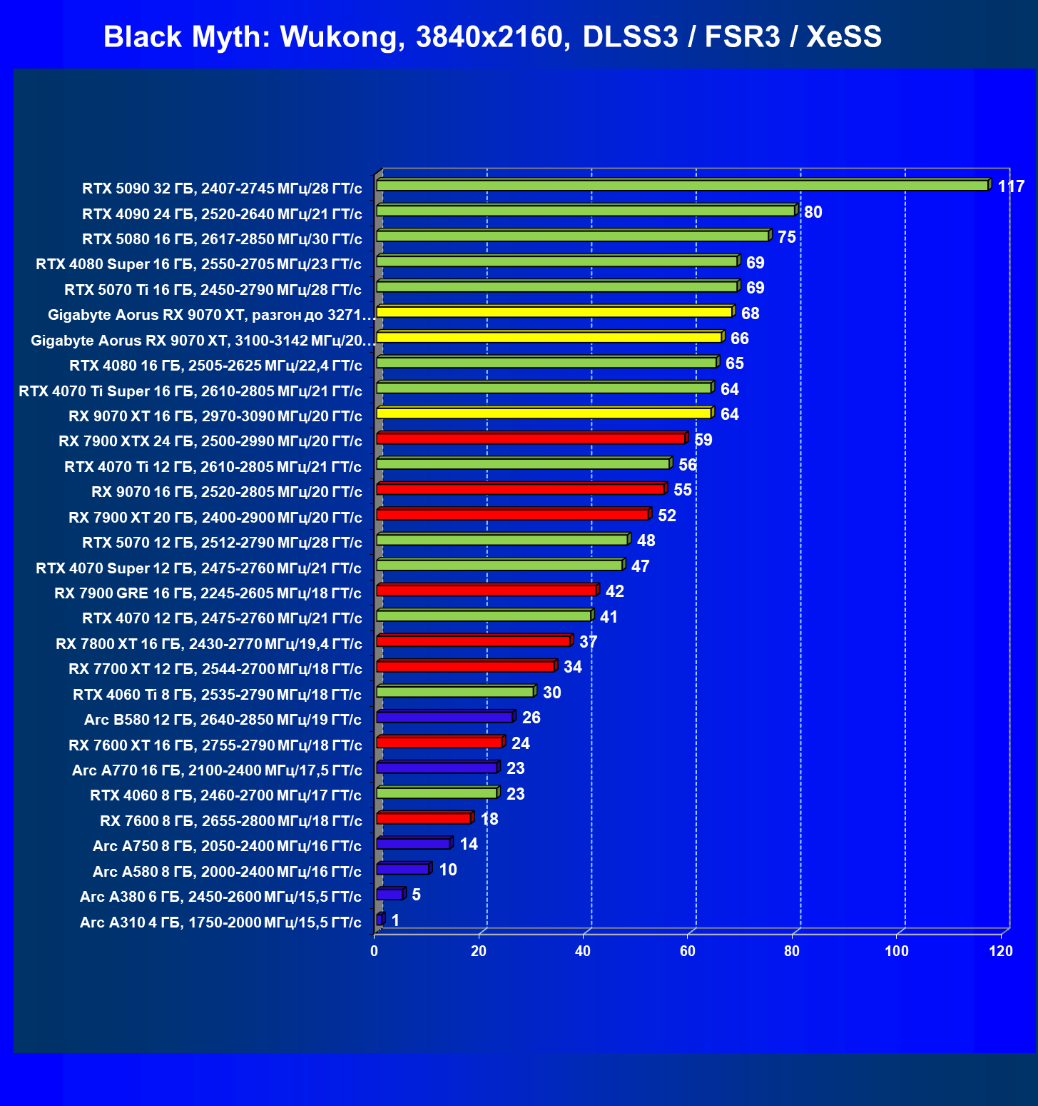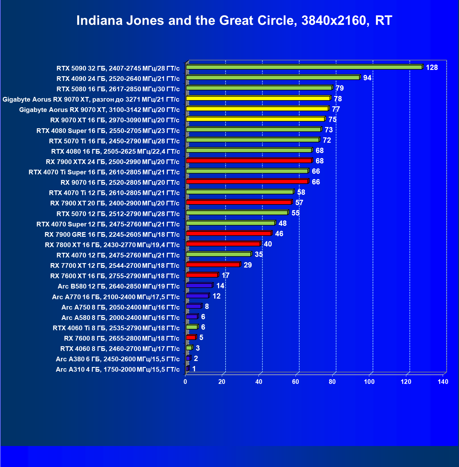 | 10 | Gigabyte Aorus RX 9070 XT, 3100—3142 МГц/20 ГТ/с | 4184 | 384 | 109 000 |