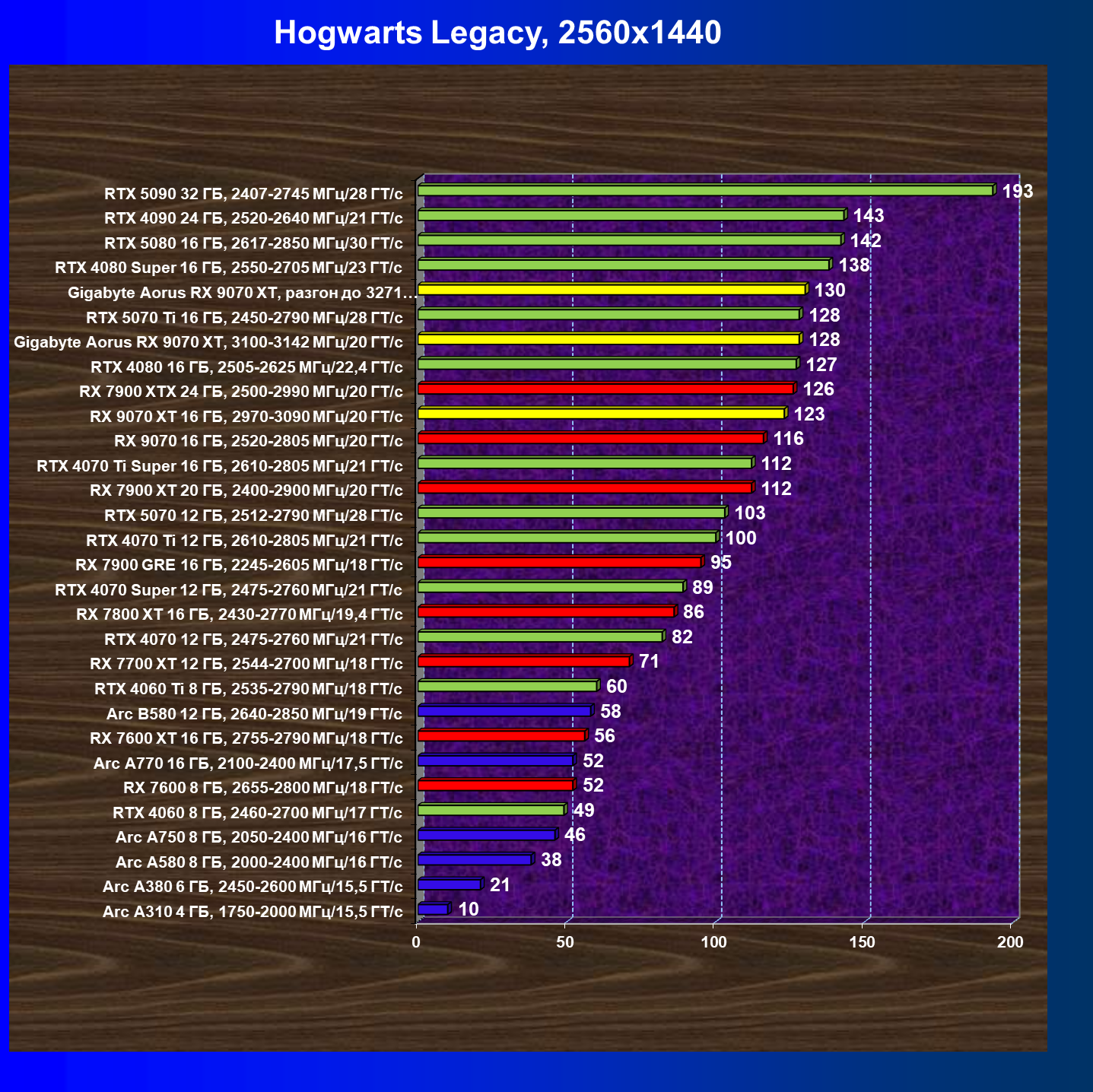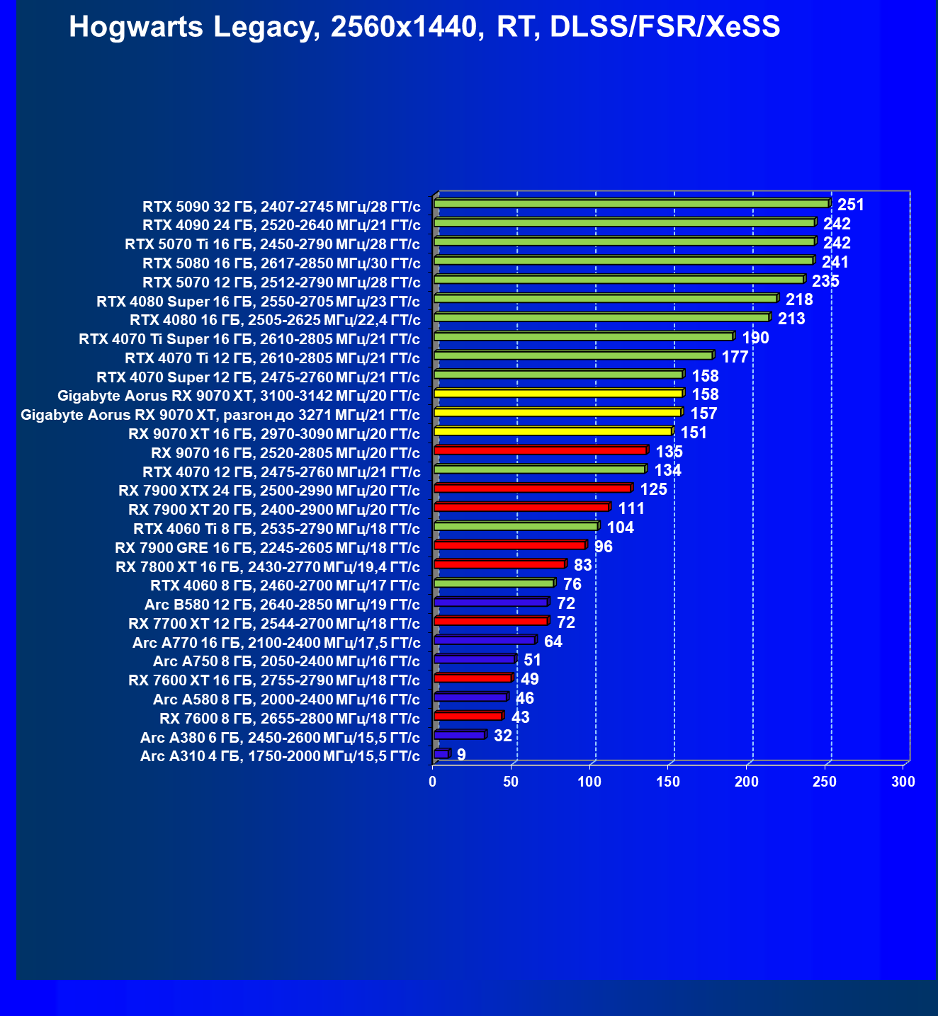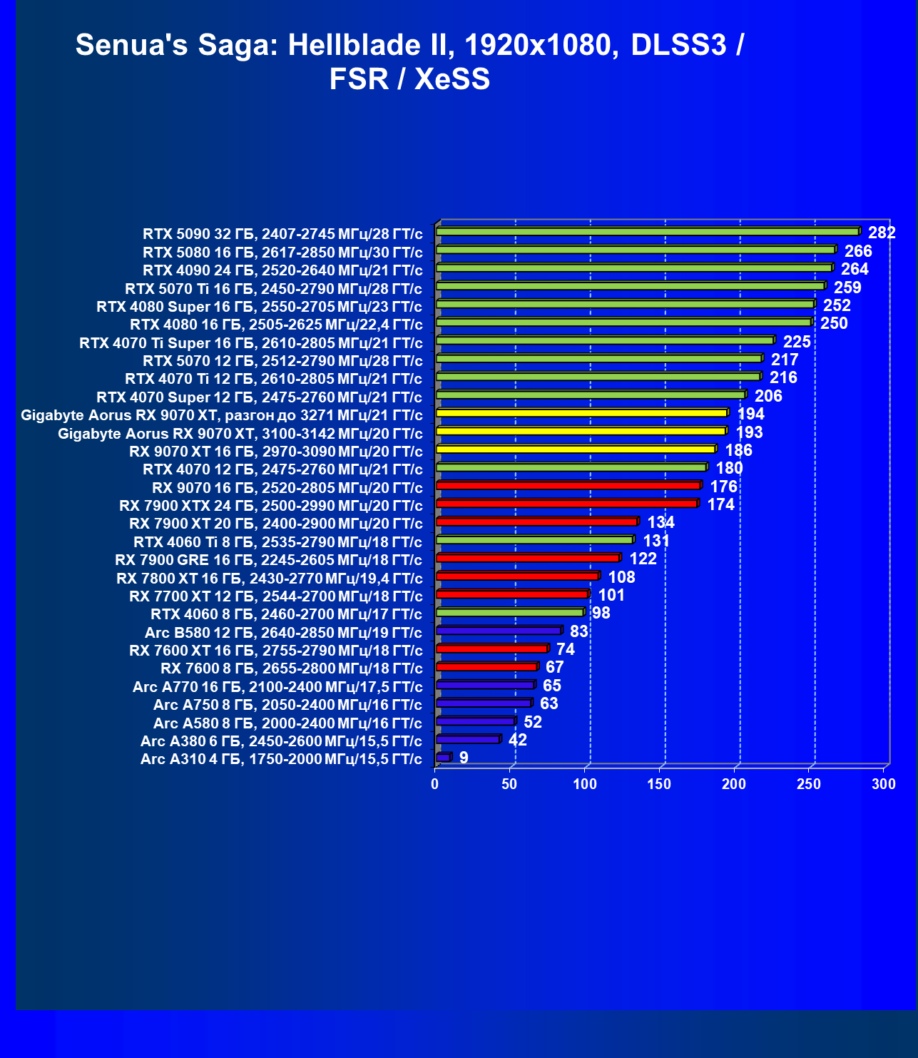 | 09 | RX 9070 XT 16 ГБ, 2970—3090 МГц/20 ГТ/с | 1754 | 167 | 105 000 |