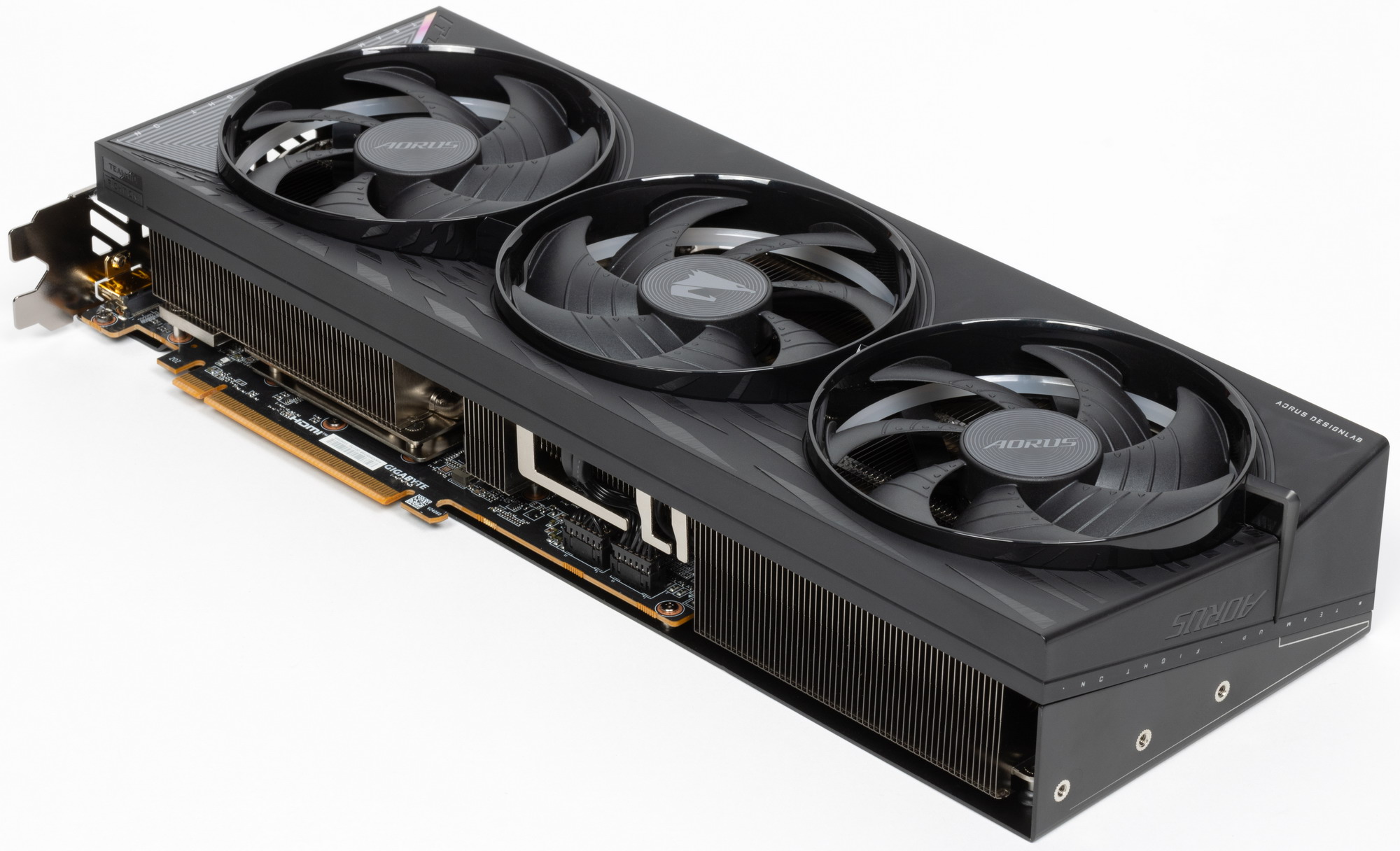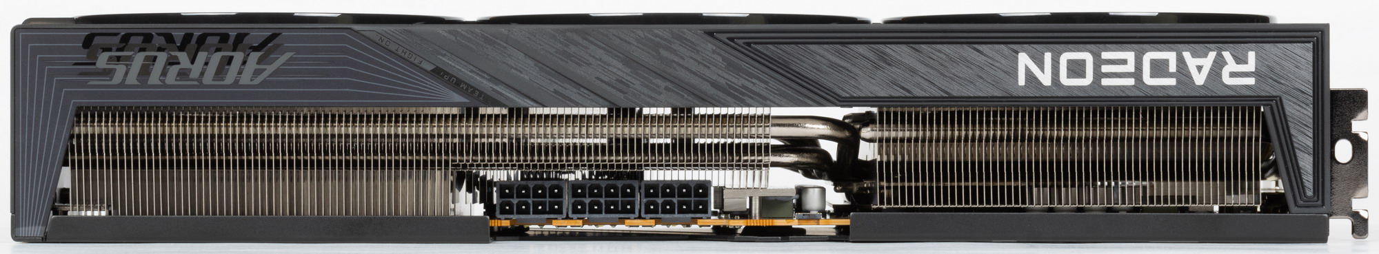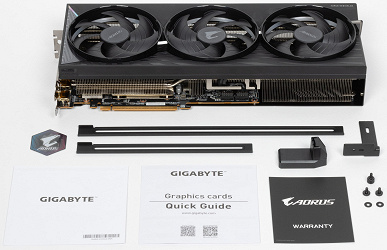Конкретная протестированная карта Gigabyte Aorus Radeon RX 9070 XT Elite 16G (16 ГБ) имеет крупные размеры 34×13 см и занимает 3 слота в системном блоке. Карта может потреблять до 340 Вт (официальный лимит AMD — 350 Вт) и имеет три 8-контактных разъема питания PCIe 2.0. Кулер тихий. У карты 4 видеовыхода: 2 HDMI 2.1b и 2 DisplayPort 2.1a — последний обеспечивает пропускную способность до 80 Гбит/с в режиме передачи UHBR 20 и позволяет подключить 8K-дисплей с частотой обновления 60 Гц по одному кабелю. Карта имеет стильный и симпатичный дизайн, снабжена фирменной подсветкой Halo, создающей красивые эффекты при вращении вентиляторов.