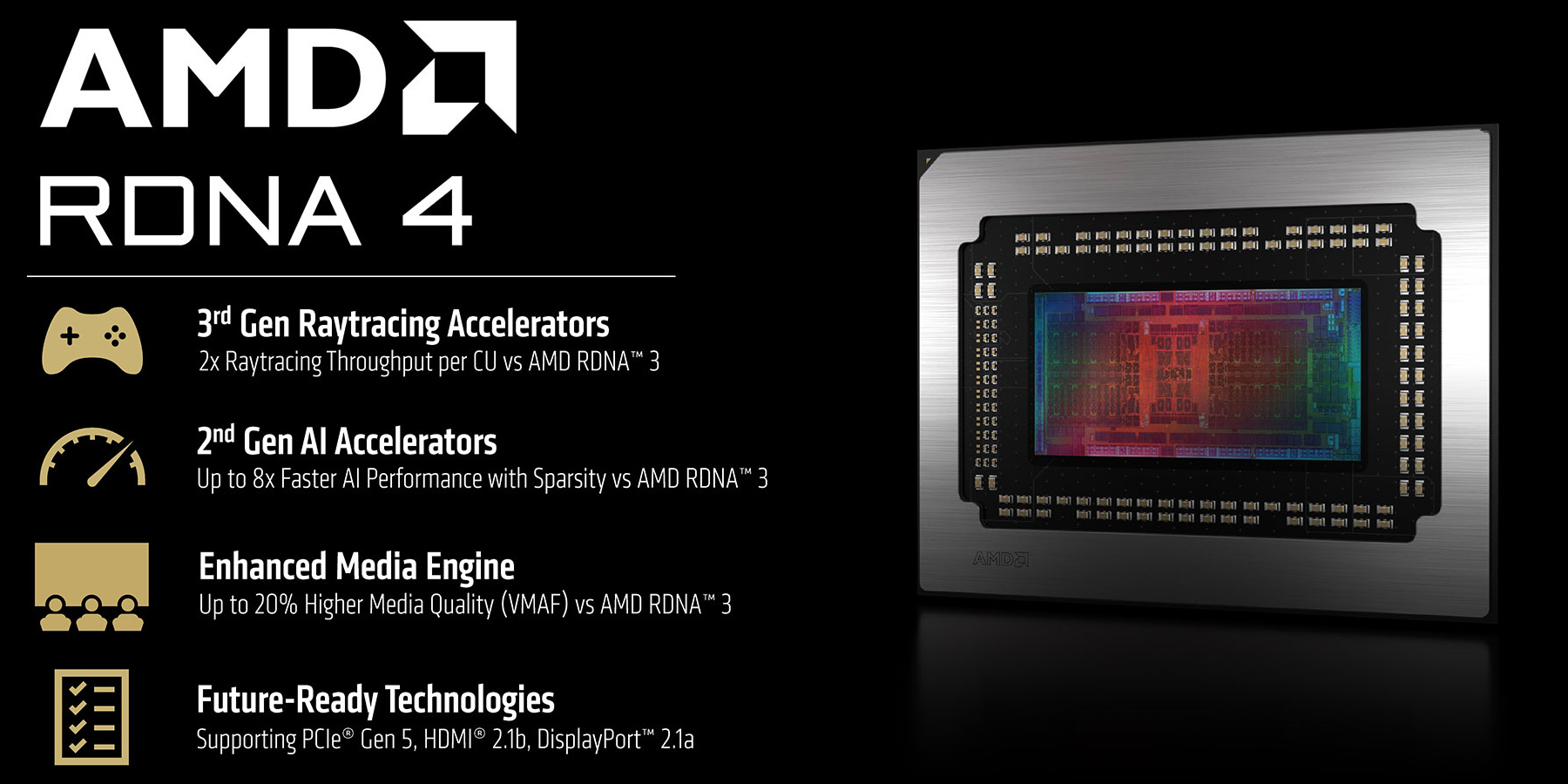 По сравнению с предыдущей архитектурой компании, в RDNA 4 больше всего улучшений было внедрено в аппаратные блоки трассировки лучей, но и ИИ-ускорители не обошли вниманием. Практически все вычислительные блоки получили свои усовершенствования для повышения производительности и эффективности, ИИ-ускорители получили поддержку новых типов данных с меньшей точностью, но большей производительностью, а блоки трассировки лучей стали значительно быстрее справляться с работой. Но хотя Nvidia перешла уже на память GDDR7 в своих новейших видеокартах, AMD продолжила использовать память «старого» стандарта — GDDR6, обеспечивающего максимальную производительность в 20 Гбит/с против 30 Гбит/с, но для улучшения эффективной пропускной способности в их графических процессорах есть специальный большой кэш Infinity Cache.
