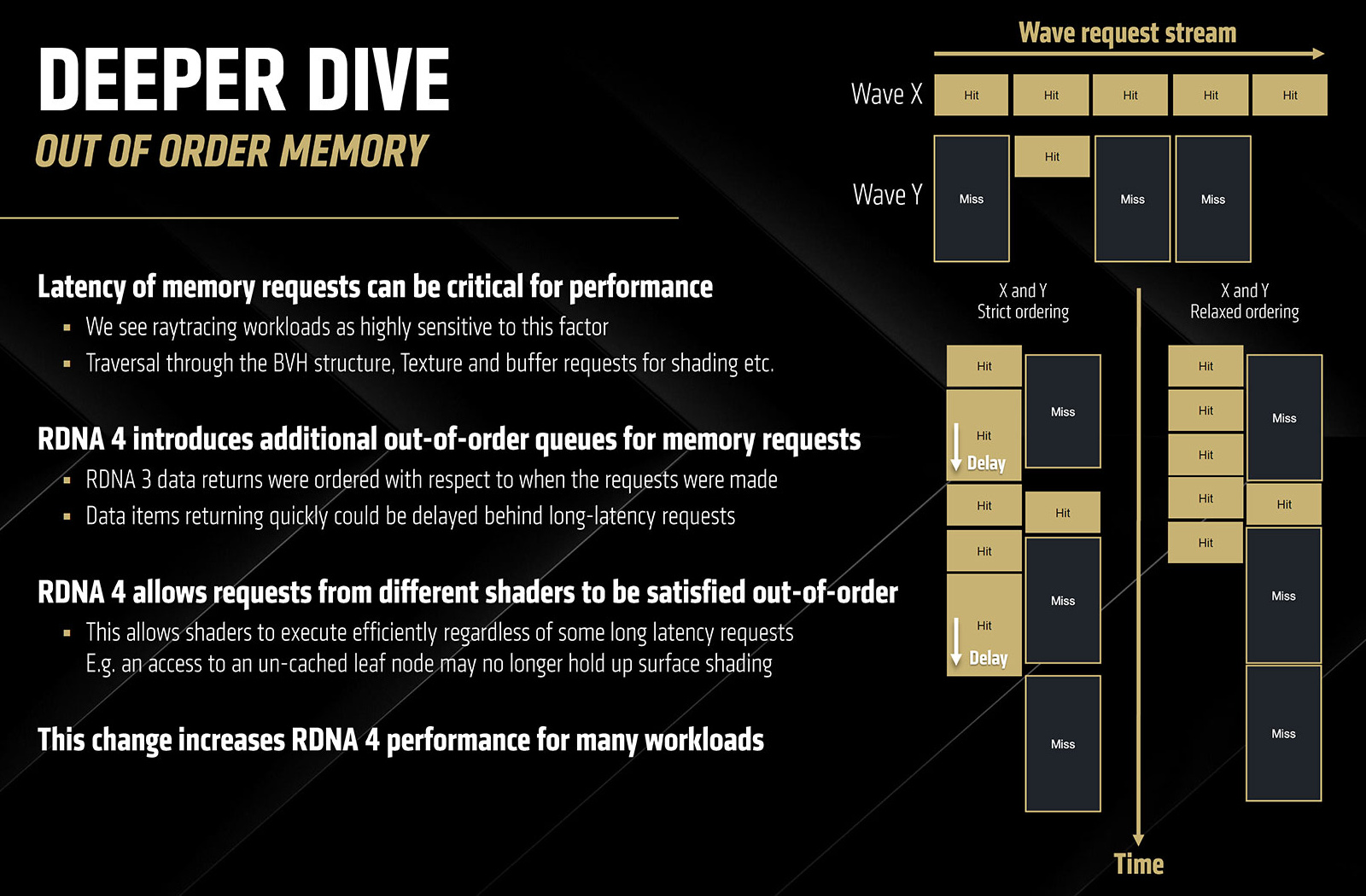 Трассировка лучей и ускорение матричных операций чувствительны к скорости и задержкам памяти, поэтому AMD решила внести некоторые изменения и в систему управления памятью, внедрив внеочередную память — Out-of-Order Memory Queuing. Так как математические операции выполняются волнами (waves), то взаимные зависимости между этими волнами иногда приводят к пропуску запросов, так как очередь запросов памяти из одной волны ждет окончания работы другой волны. Это можно исправить при помощи внеочередного управления памятью, которое повышает в том числе и эффективность трассировки лучей. И скоро мы узнаем, как все улучшения и изменения на нее повлияли.