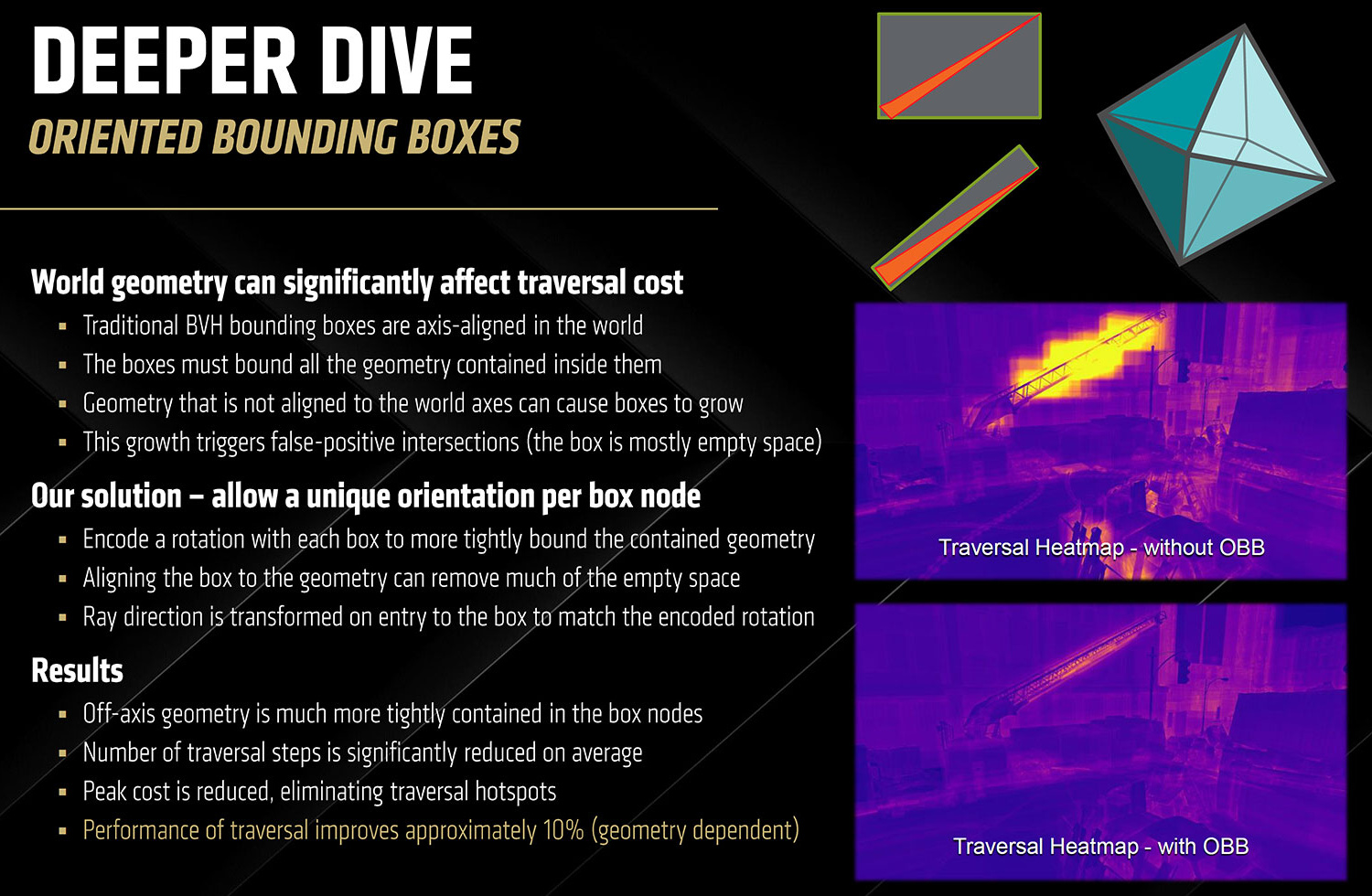 Еще из совсем нового в аппаратной трассировке на RDNA 4 можно отметить новый вид BVH-структур в виде ориентированных ограничивающих объемов (Oriented Bounding Boxes — OBB), которые могут быть ориентированы не по глобальным осям сцены, а по оси объектов. Таким образом улучшается эффективность обхода BVH, что дает прирост скорости в 10% по данным AMD. Обычно используют ограничивающие объемы, расположенные в пространстве по глобальным осям сцены, но чаще всего геометрия объектов имеет другую форму, которая не очень хорошо вписывается в них — это приводит к лишней трате ресурсов при тестировании лучей. AMD предлагает вариант ориентированных по оси объекта ограничивающих объемов, чтобы ориентировать их ближе к форме объекта — это сокращает количество лучей, необходимых для расчетов. Изменение ориентации ограничивающих примитивов относительно оси объектов позволит снизить количество итераций при поиске пересечений.