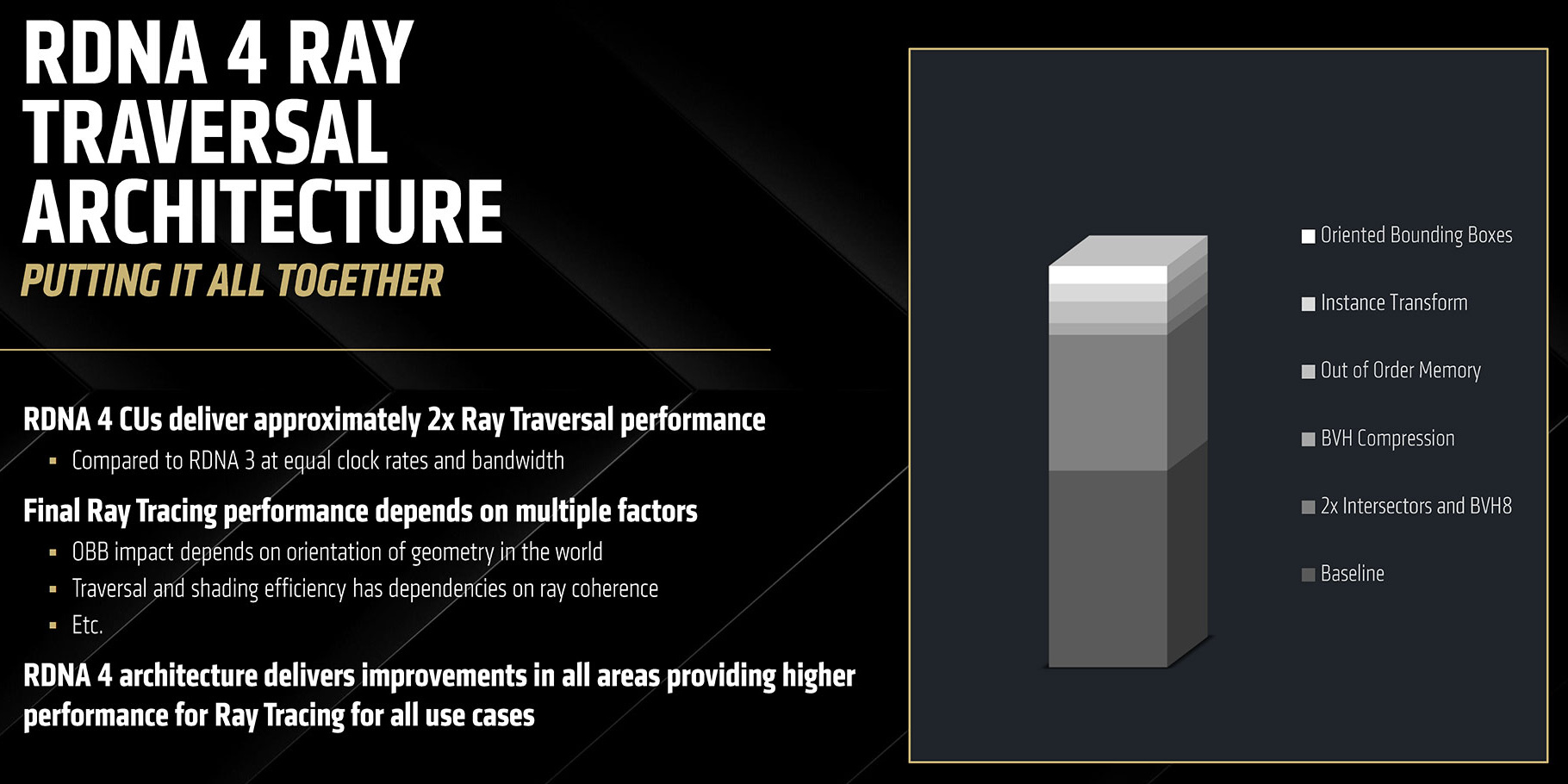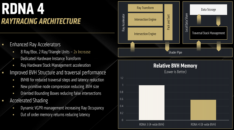 Есть и другие улучшения в Ray Accelerator: использование структуры BVH8 вместо BVH4 увеличивает производительность и снижает использование видеопамяти, объем структур BVH уменьшается. Новые RT-ядра поддерживают аппаратную трансформацию копий объектов (instance), что позволяет их копировать для сцены без дублирования в памяти, обрабатывая несколько образцов как один. В RDNA 4 также был изменен порядок операций при трассировке и обращения к памяти, шейдеры запрашивают данные из кэша без строгой очередности для улучшения общей эффективности, так как попадания и промахи в кэше меньше мешают друг другу. Но эти улучшения лишь немного повысили производительность ускорителей трассировки, а основной прирост дает удвоение производительности аппаратных движков пересечений: