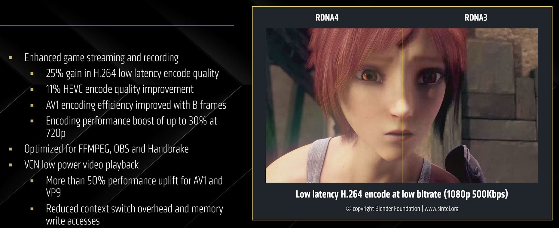 В чипе Navi 48 есть два медиадвижка для работы с видеоданными (кодирования и декодирования), в этом они схожи с конкурентами Nvidia, имеющими по два блока NVEnc и NVDec. Новый медиадвижок AMD обеспечивает улучшение качества кодирования форматов H.264 и H.265 с низкими задержками, а при кодировании AV1 теперь поддерживаются B-кадры, что повышает эффективность при том же битрейте. AMD говорит, что качество кодирования H.264 (AVC) было увеличено до 25%, а H.265 (HEVC) — на 11%, и это хорошо, так как по качеству кодирования видео AMD до сих пор отставала от Intel и Nvidia, чьи решения дают близкое качество картинки, превосходящее предыдущие Radeon. Если говорить о производительности, то медиадвижок показывает на 50% более высокую скорость кодирования AV1 и VP9 по сравнению с предшественником при сокращенном использовании видеопамяти.