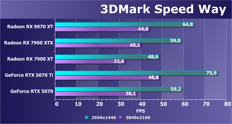 В классических играх Radeon RX 9070 XT по производительности выходит на один уровень с GeForce RTX 4080, чуть обгоняет GeForce RTX 4070 Ti Super и Radeon RX 7900 XTX и чуть отстает от GeForce RTX 5070 Ti. Это позволяет получить высокий уровень комфорта в играх на максимальных настройках качества во всех разрешениях до 4K включительно.