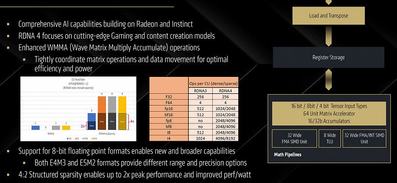 Базовая производительность для формата вычислений FP16 была увеличена в RDNA 4 вдвое, для разреженных матриц возможно еще одно удвоение и еще одно в случае использования формата FP8, который часто используют в ИИ-нагрузках — это уже до восьми раз большая производительность, по сравнению с RDNA 3. В результате получается до 389 TFLOPS вычислений FP16 (с учетом разреженности) и до 1557 TOPS вычислений с точностью INT4 и также с учетом разреженности.