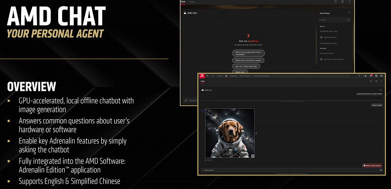 Что касается остальных программных улучшений, то можно отметить удобное приложение драйвера «AMD Software», в котором есть способ сообщения об ошибках и артефактах в играх — AMD Image Inspector, также представлен локальный чат-бот, работающий на ИИ-ускорителях — AMD Chat, утилиты потокового вещания для стримеров, удобное средство для запуска игр, аппаратное ускорение шумопонижения AMD Noise Suppression и многое другое.