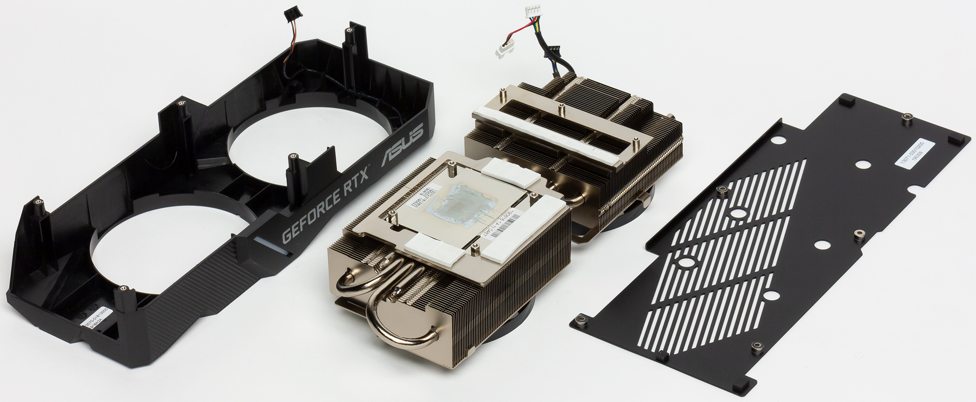 Компания отмечает, что для достижения относительно тихой работы карты использует толстый радиатор, с которым плата занимает почти 3 слота в системном блоке (впрочем никакого «почти» тут быть не может: или 2 слота, или 3). И действительно, мы видим массивный двухсекционный радиатор с пластинчатыми ребрами, которые пересекают 4 тепловые трубки, прижимающиеся к платформе для охлаждения ядра. На той же подошве имеется термоинтерфейс для охлаждения микросхем памяти. К силовым элементам конвертера питания прижимается подошва на второй части радиатора. На обороте карты установлена толстая пластина, служащая исключительно элементом жесткости.