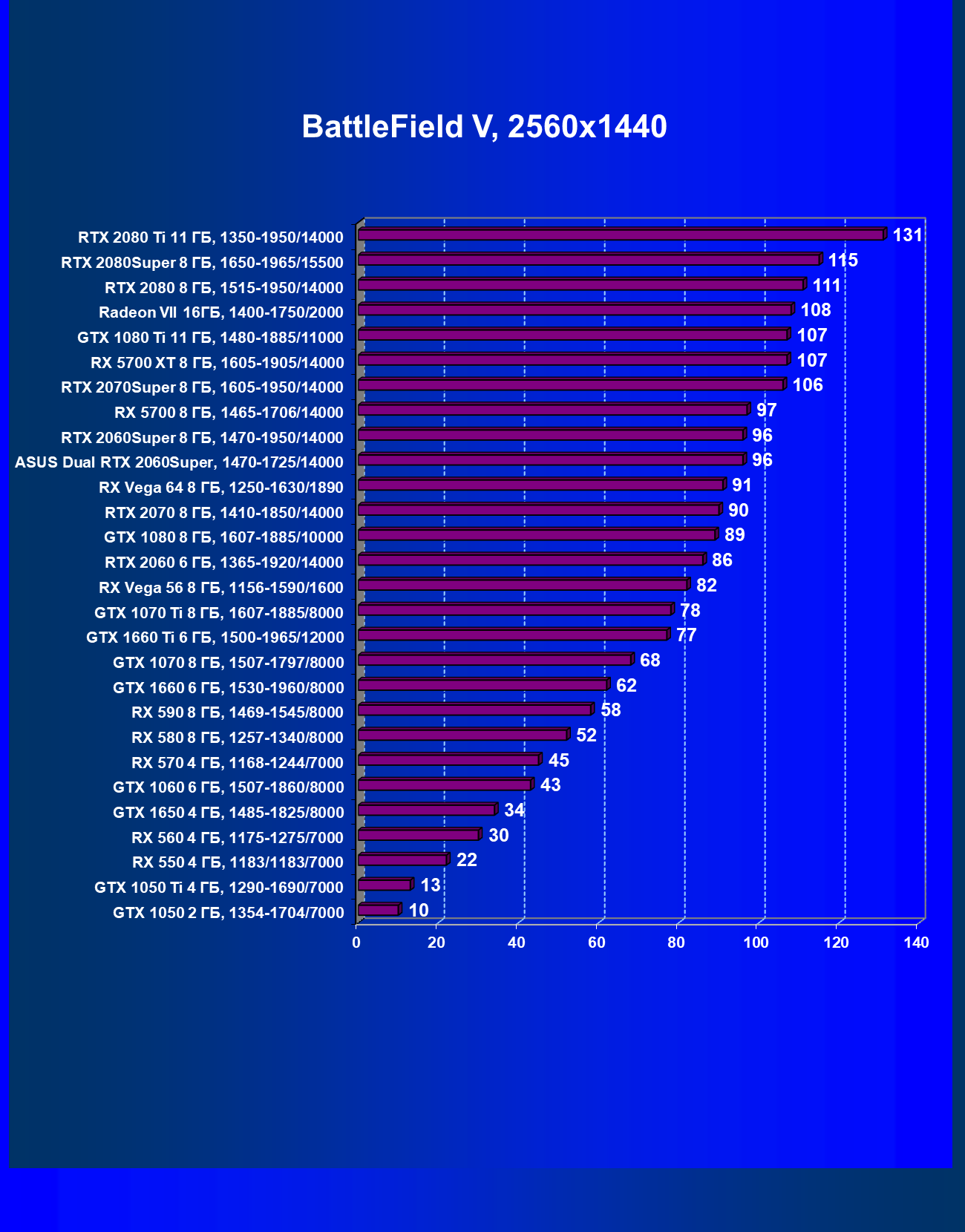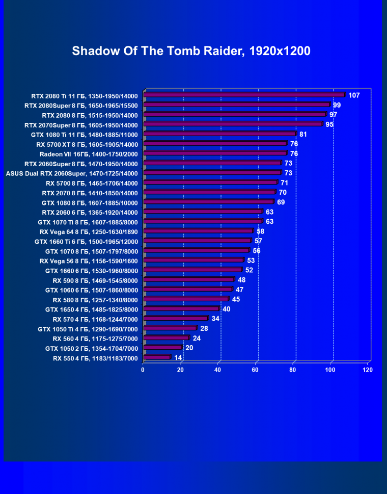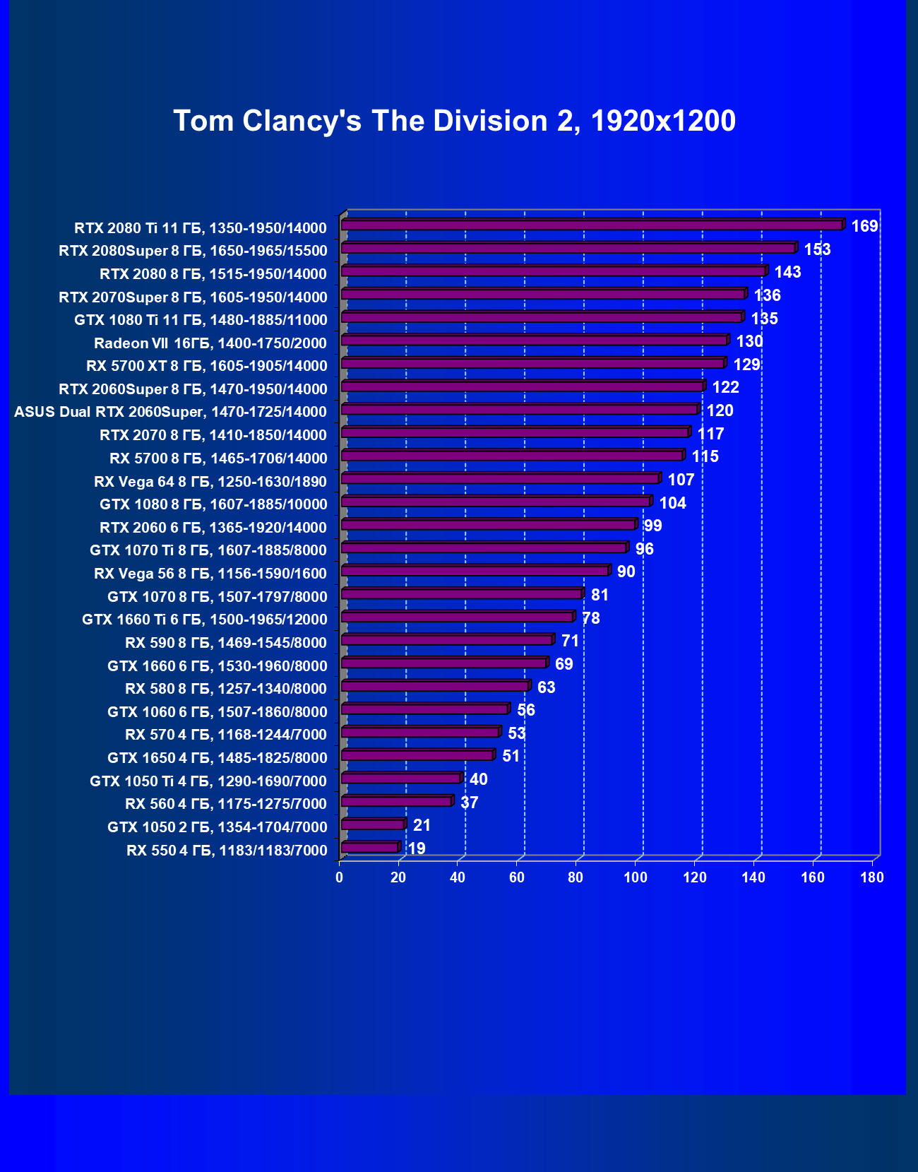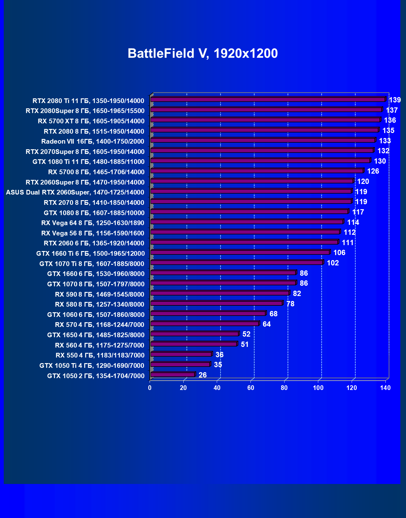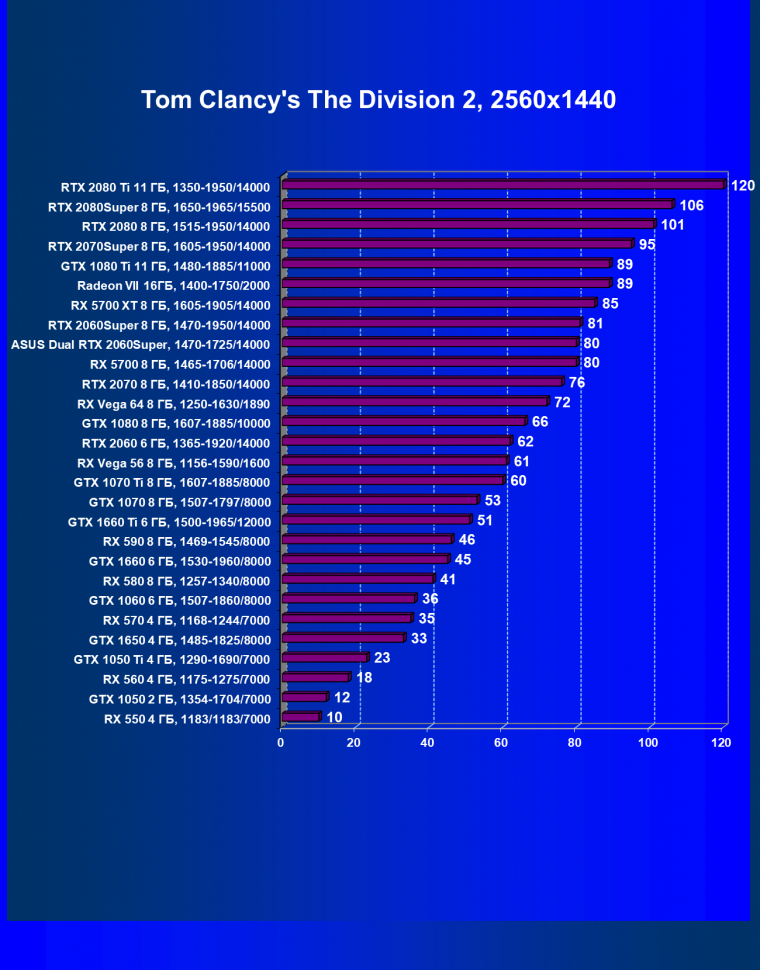 | 10 | Asus Dual RTX 2060 Super, 1470—1725/14000 | 293 | 820 | 28 000 |