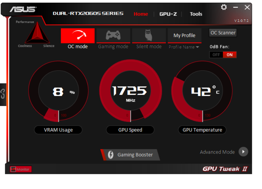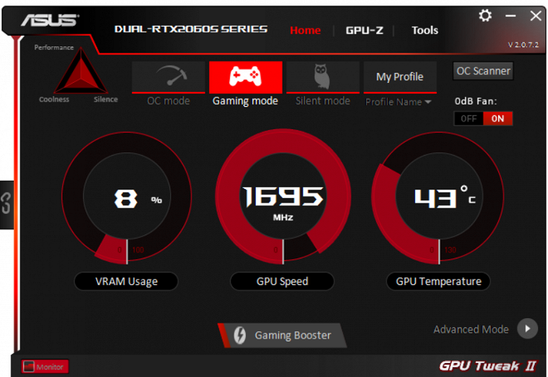 Управление работой карты обеспечивается с помощью фирменной утилиты GPU Tweak II, о которой мы многократно писали. Ускоритель не позиционируется для оверклокеров и не заинтересует фанатов разгона. Специальных режимов с различающимися частотами — три, они традиционные для продуктов Asus.