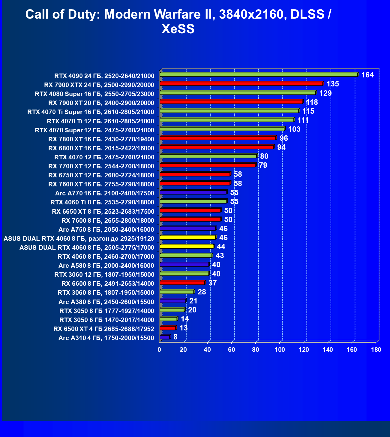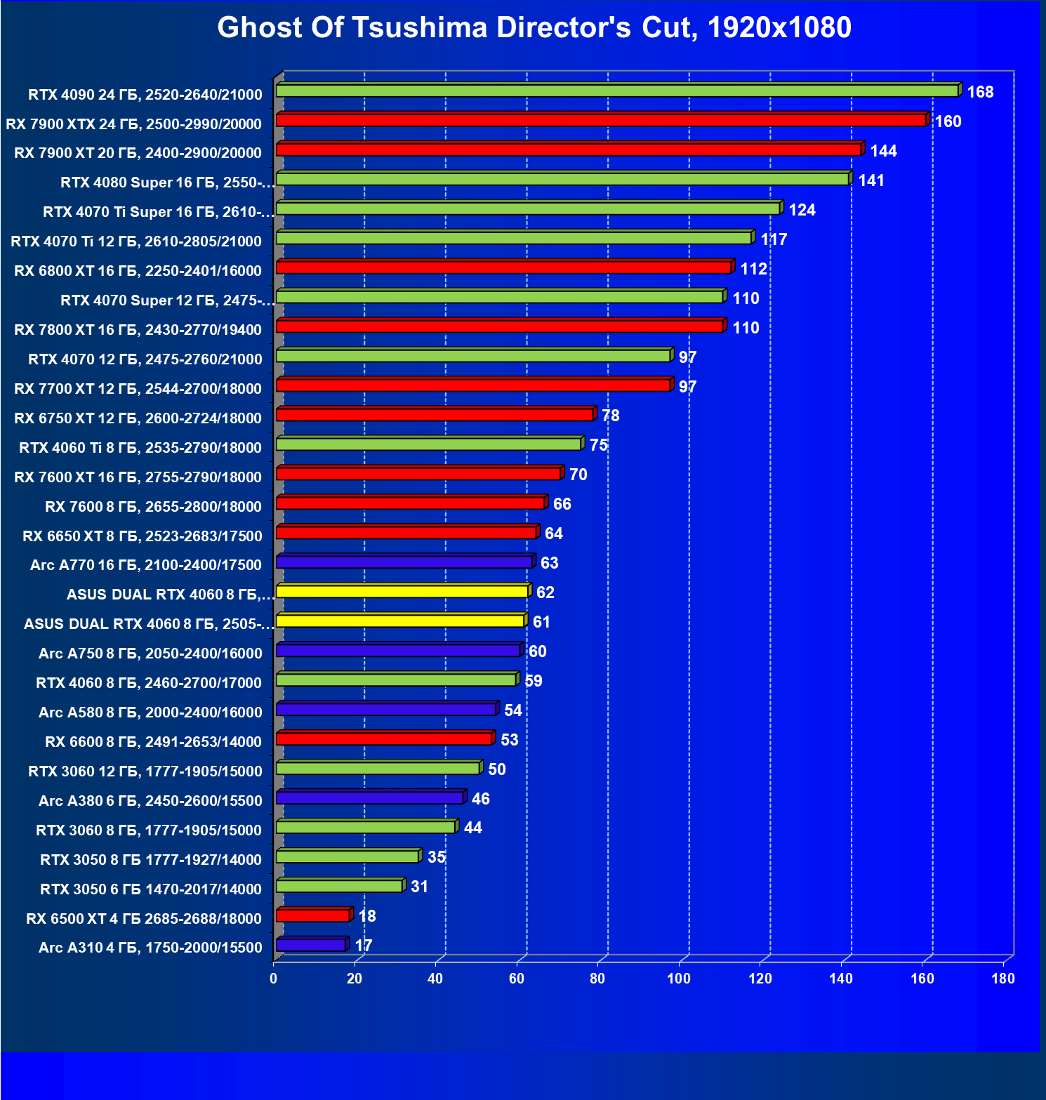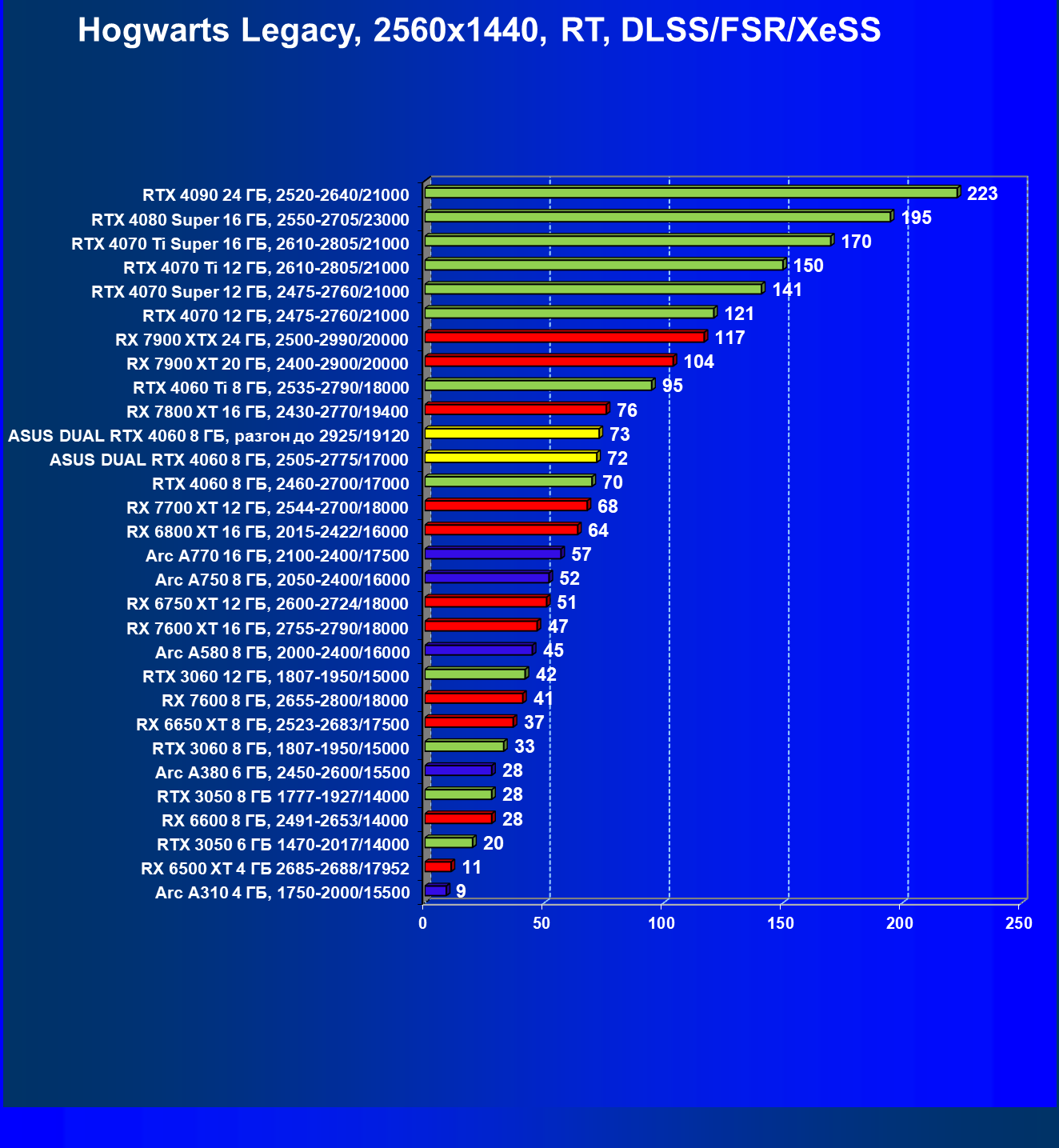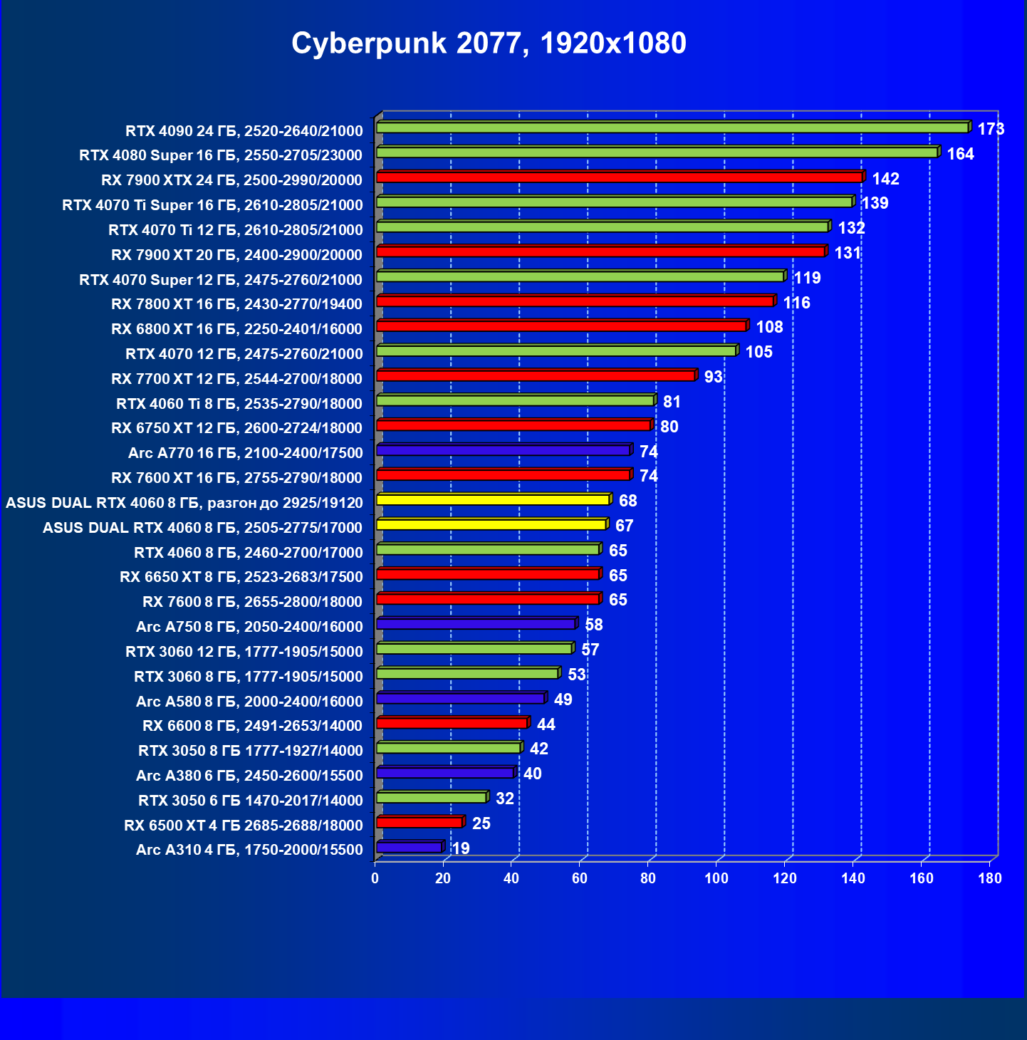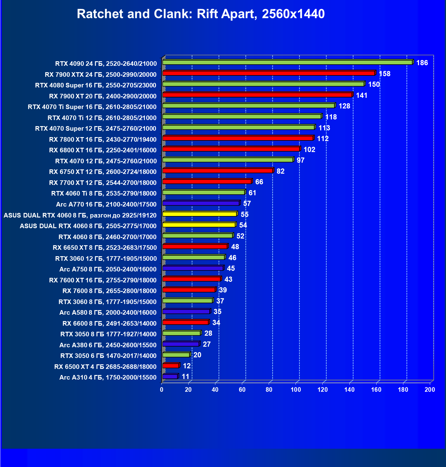 | 11 | Asus Dual RTX 4060 8 ГБ, 2505—2775/17000 | 190 | 607 | 32 000 |