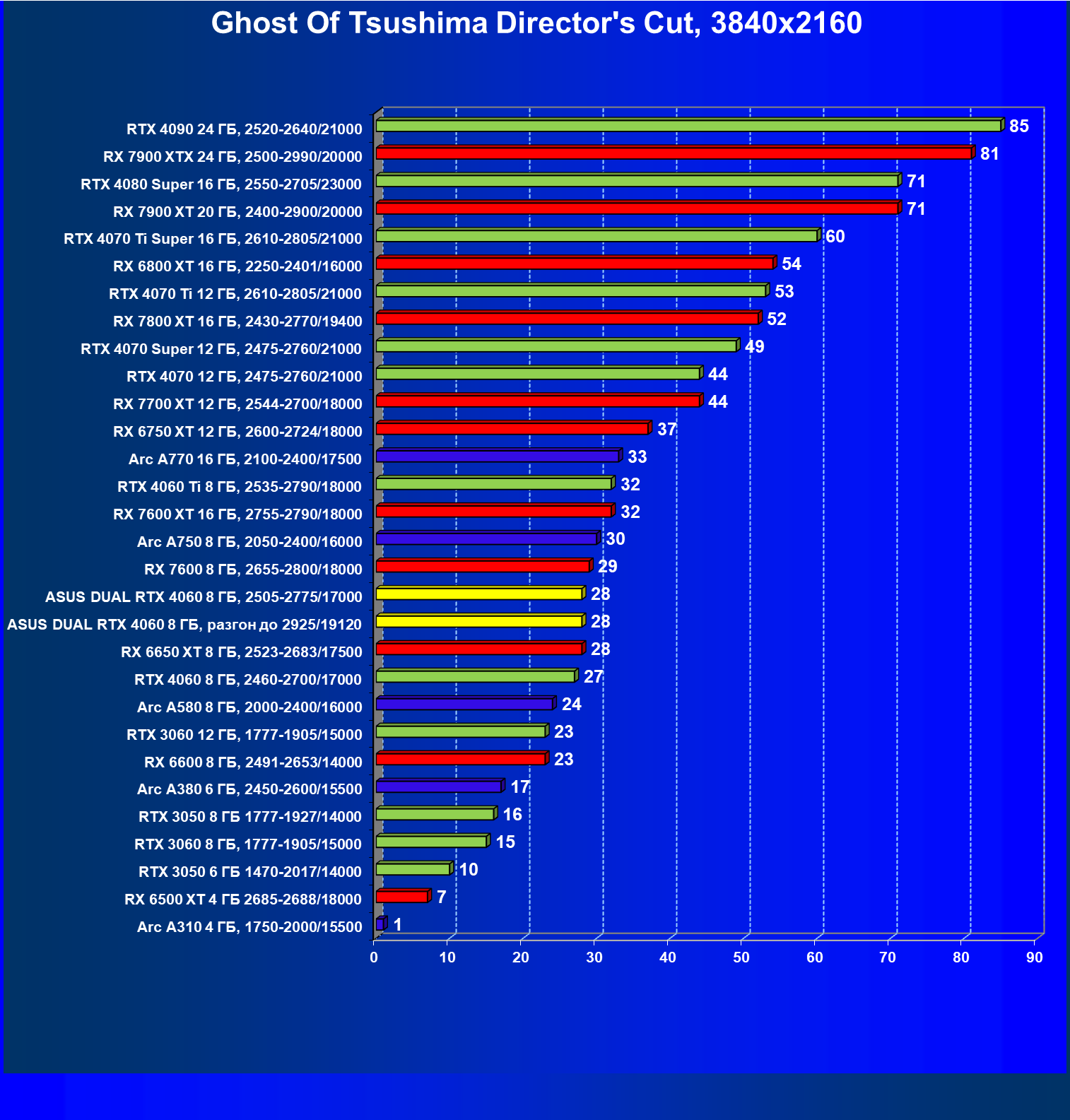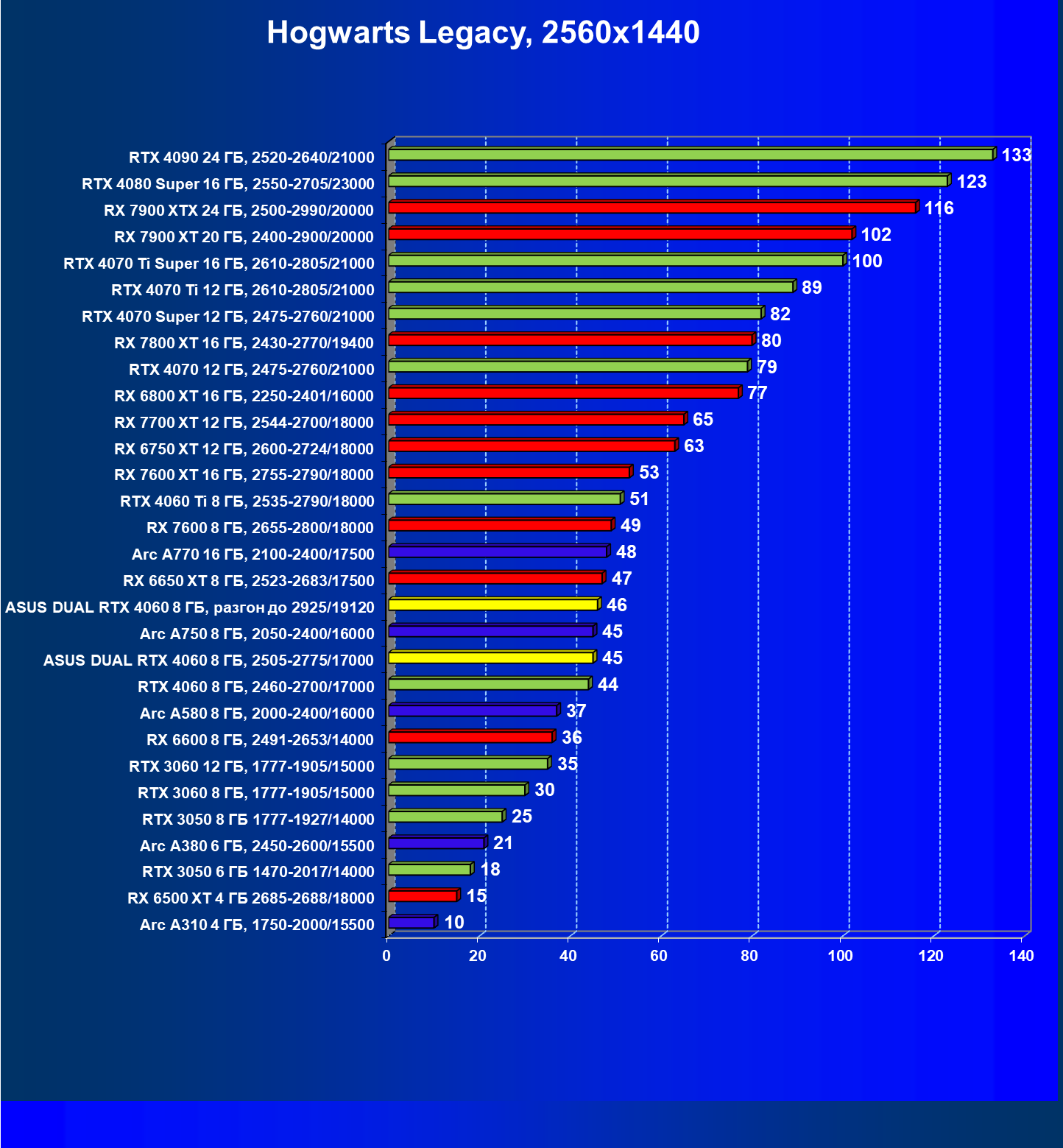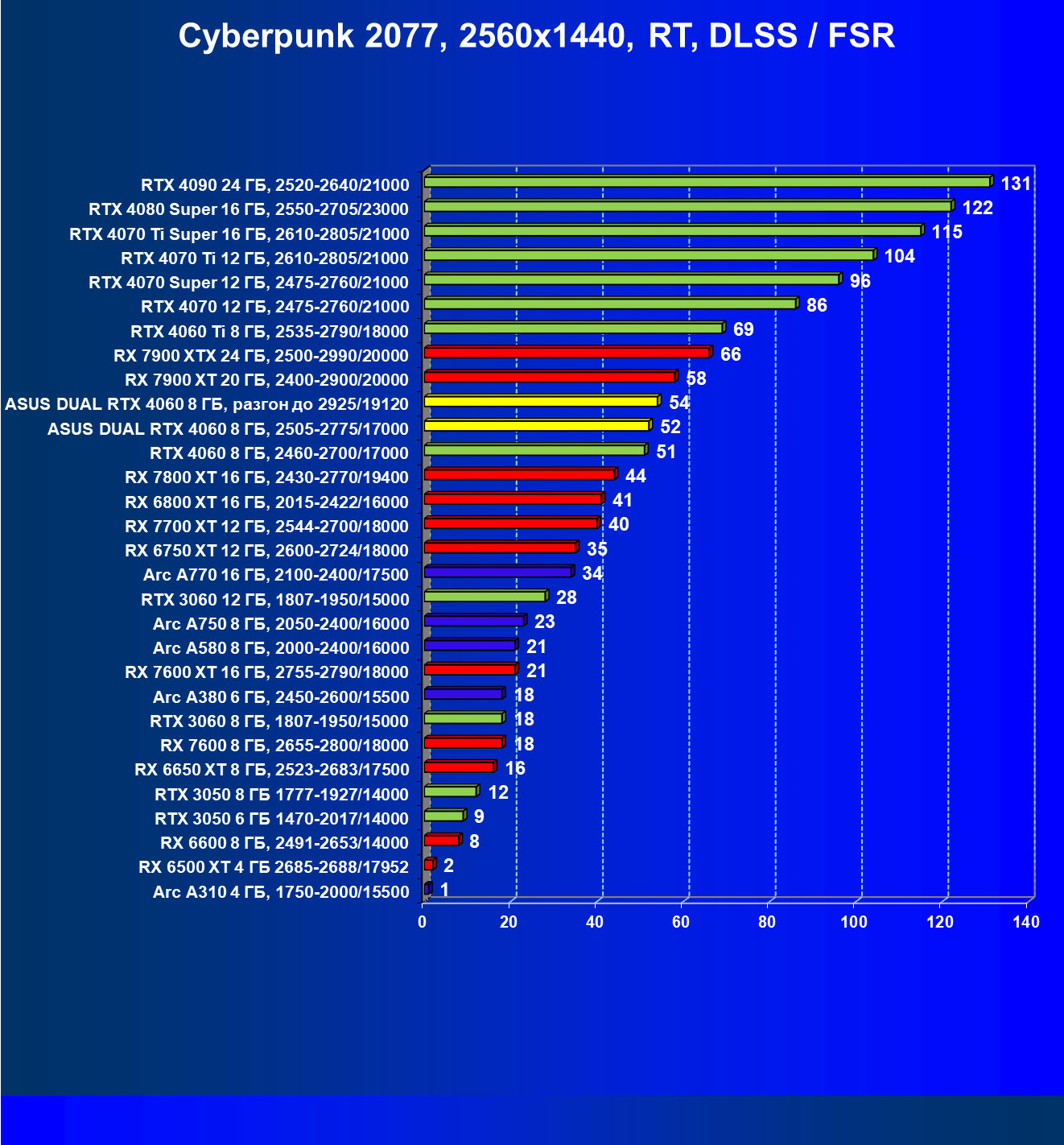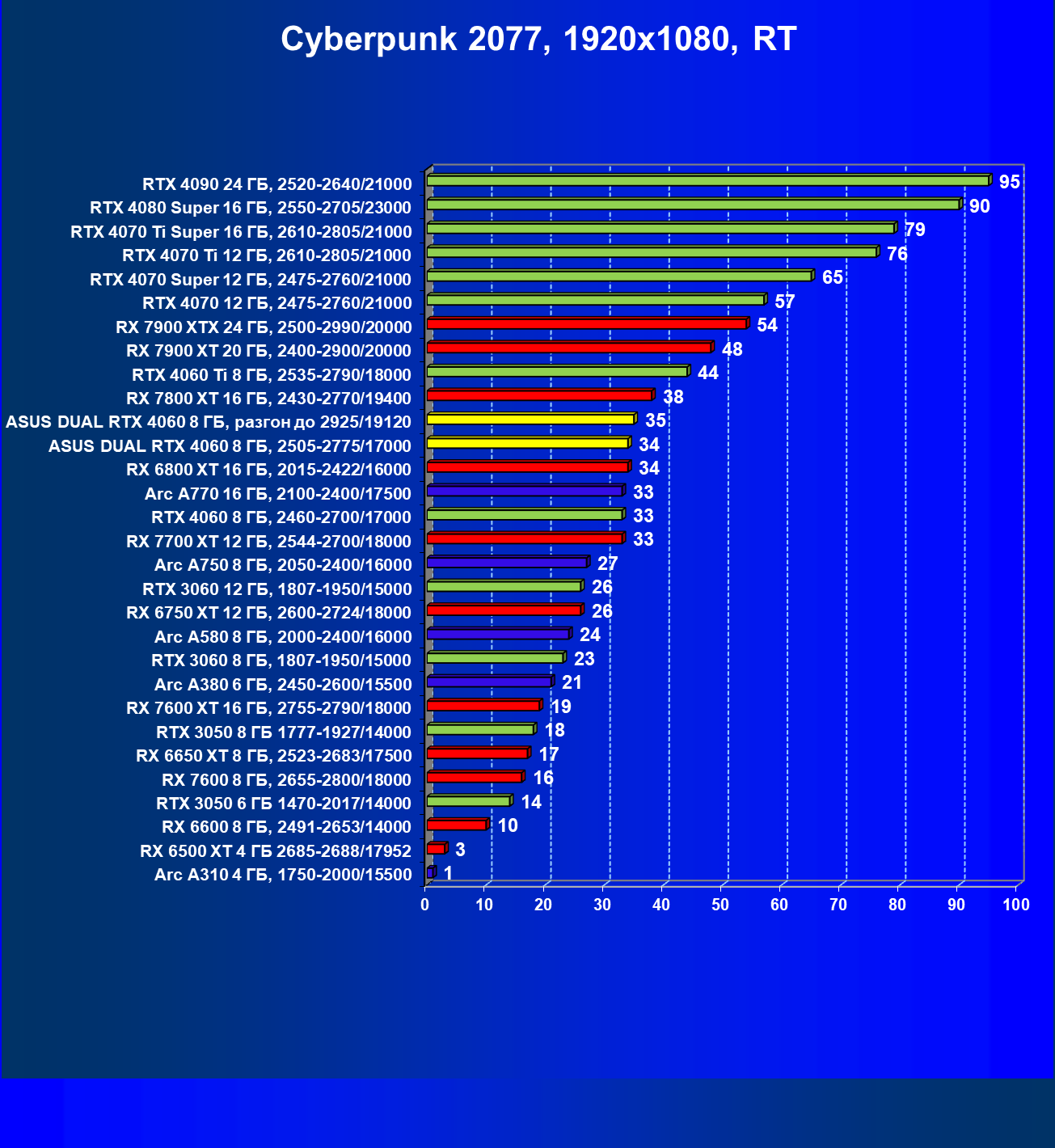 | 11 | Arc A770 16 ГБ, 2100—2400/17500 | 345 | 1173 | 34 000 |