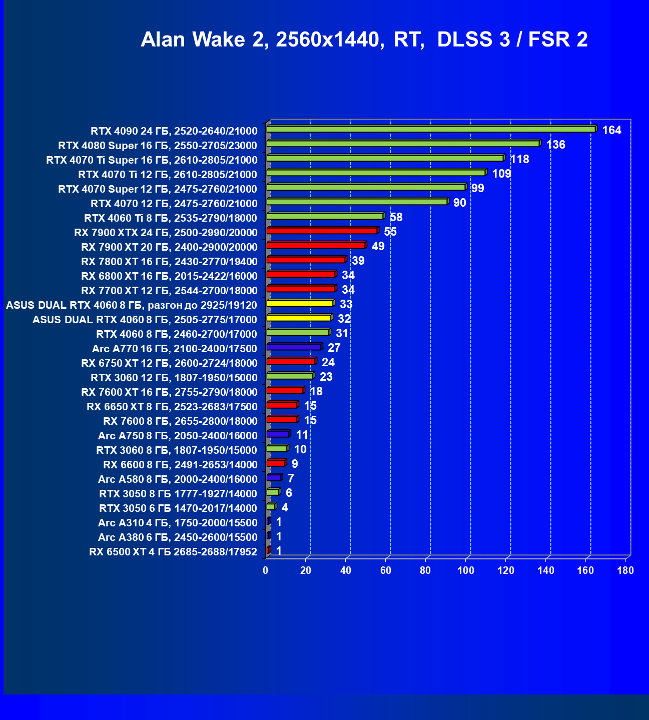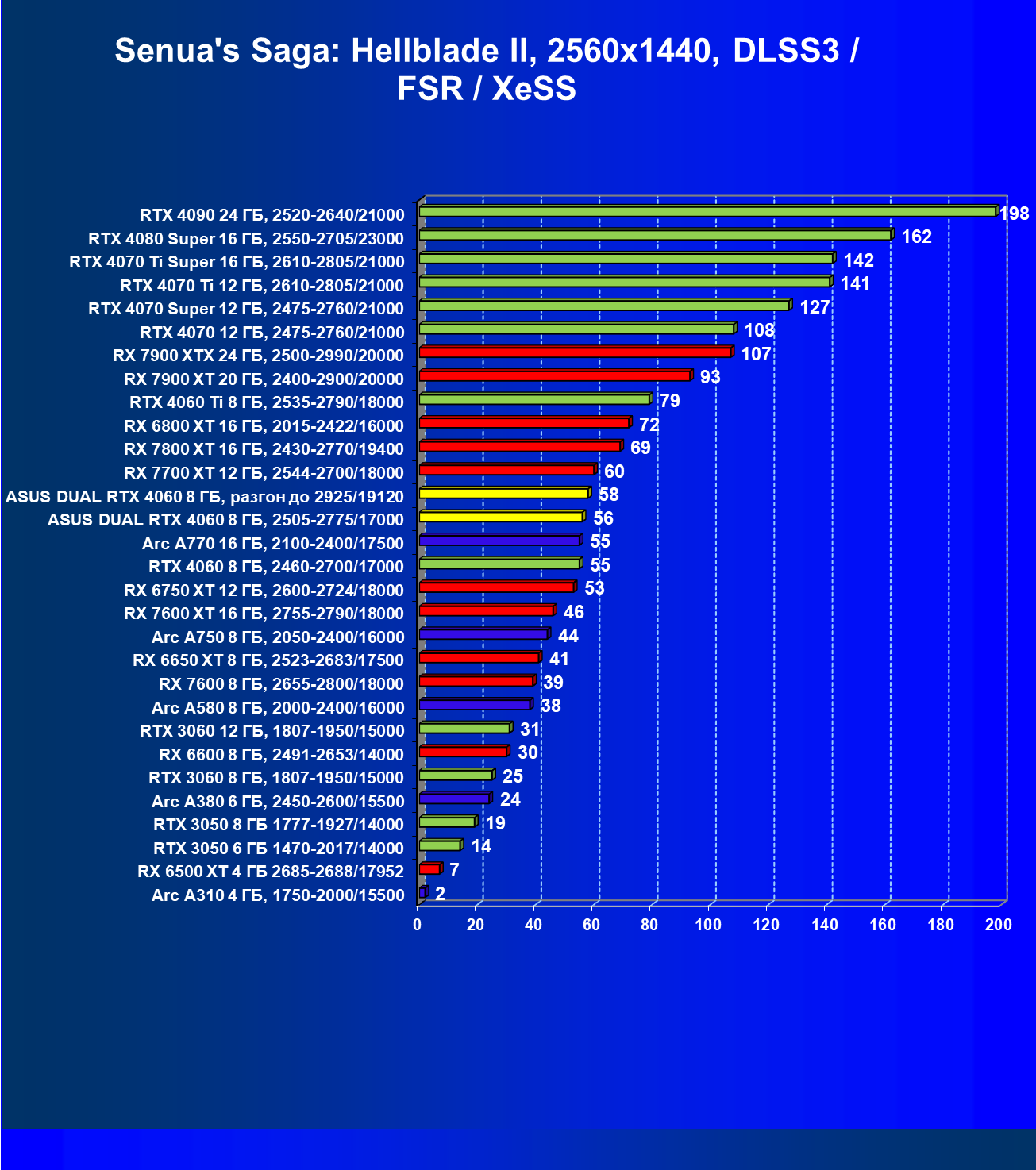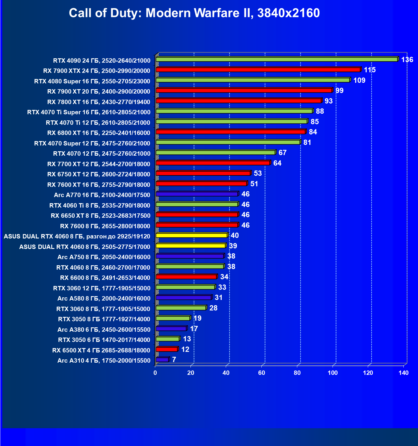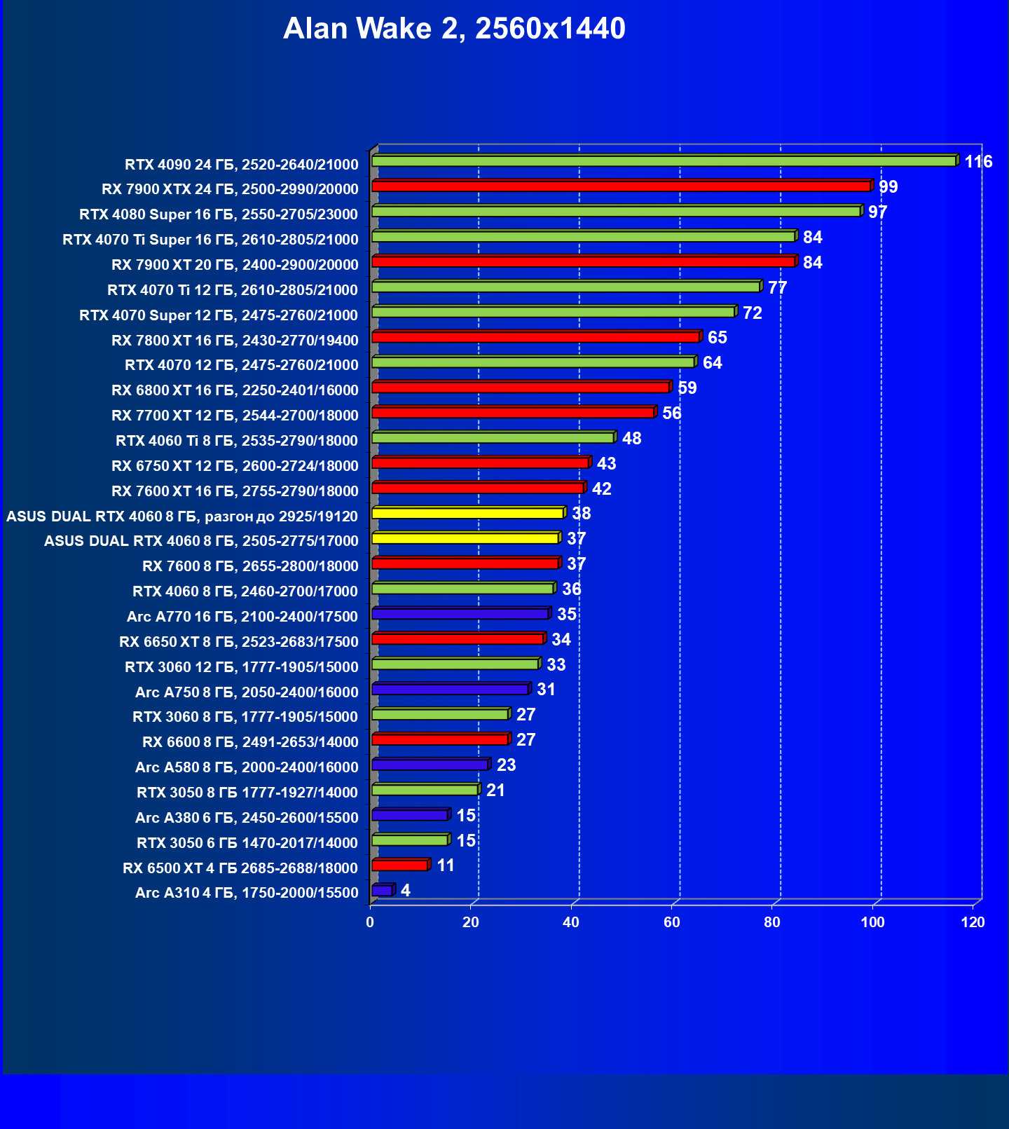 | 07 | Arc A770 16 ГБ, 2100—2400/17500 | 198 | 673 | 34 000 |