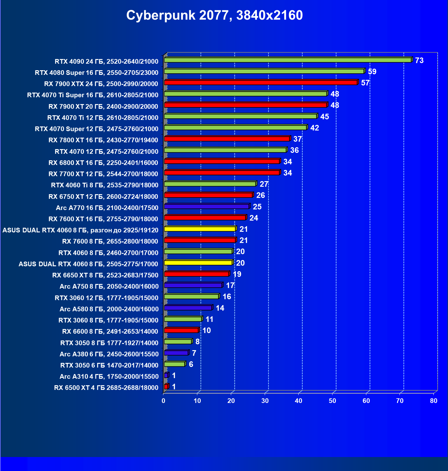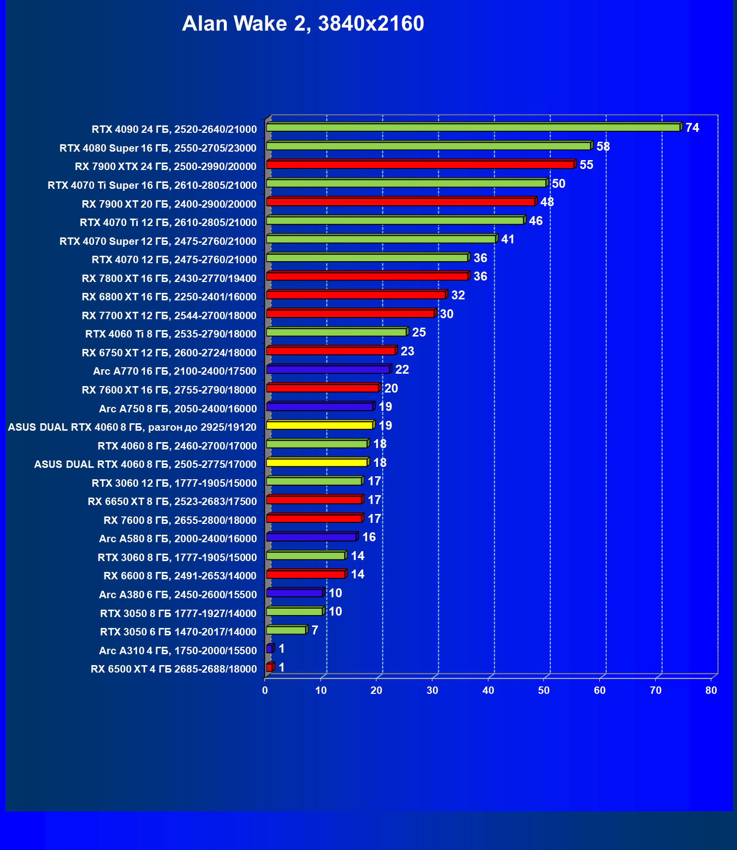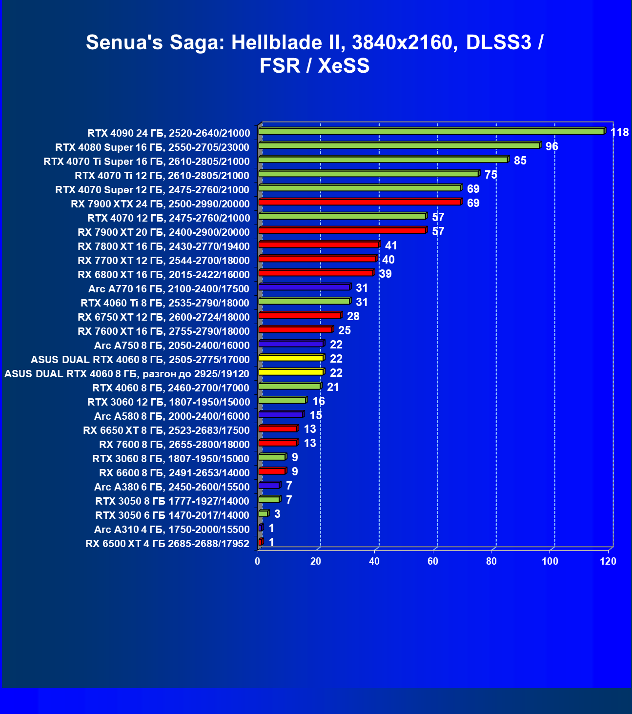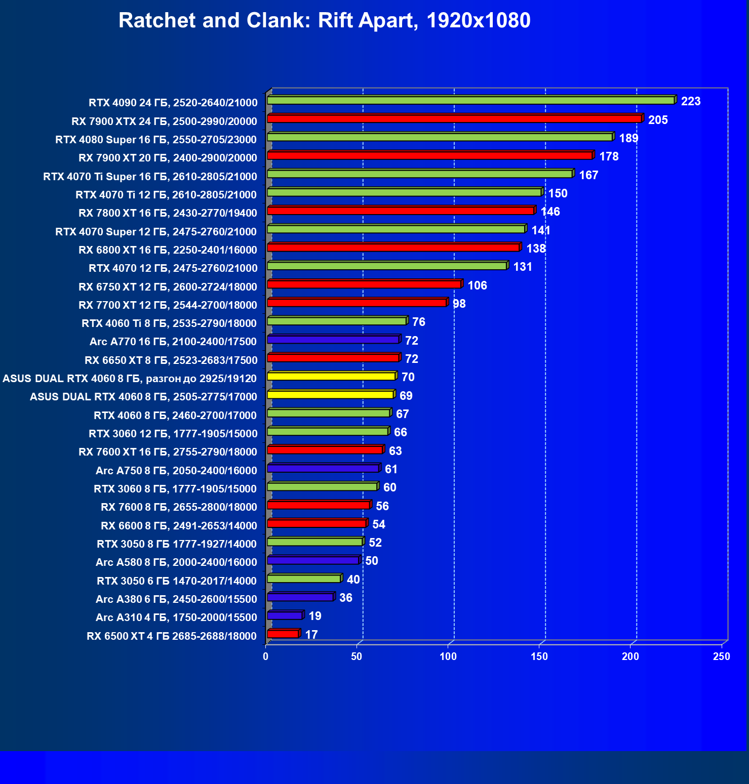 | 07 | Arc A770 16 ГБ, 2100—2400/17500 | 198 | 673 | 34 000 |