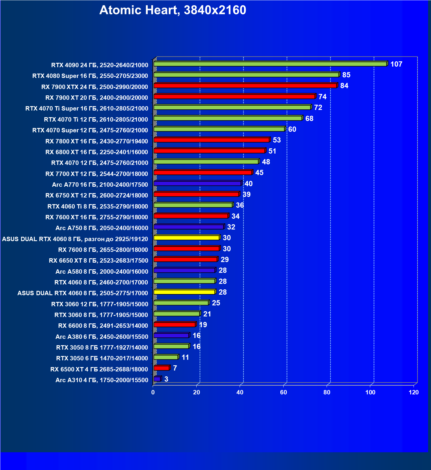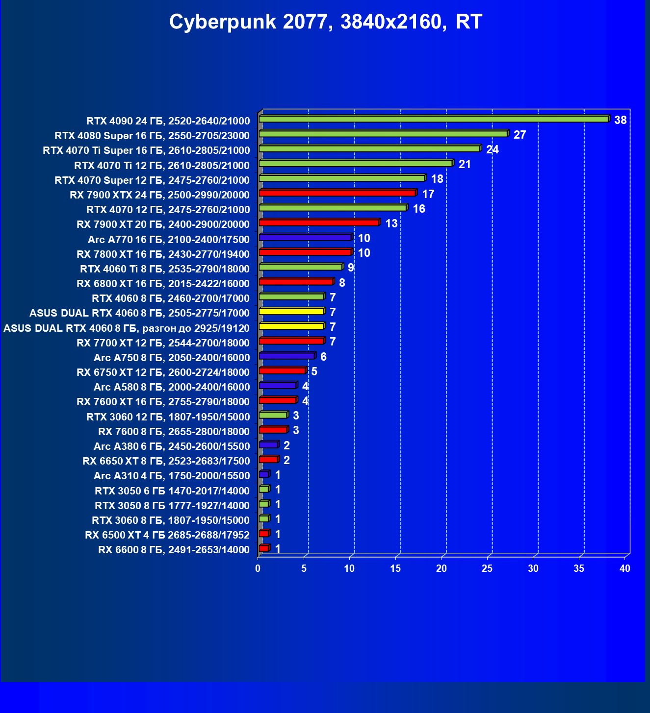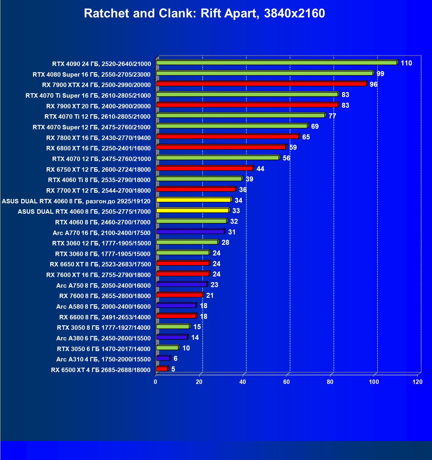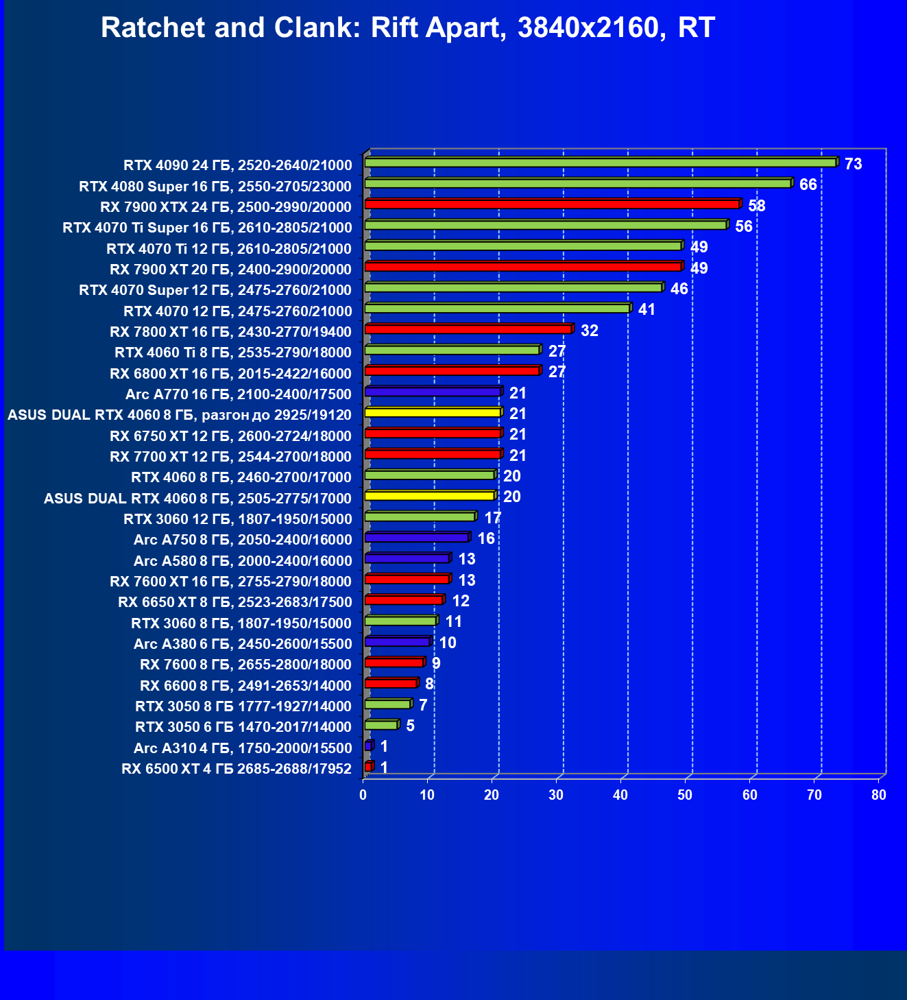 | 07 | Arc A770 16 ГБ, 2100—2400/17500 | 198 | 673 | 34 000 |
