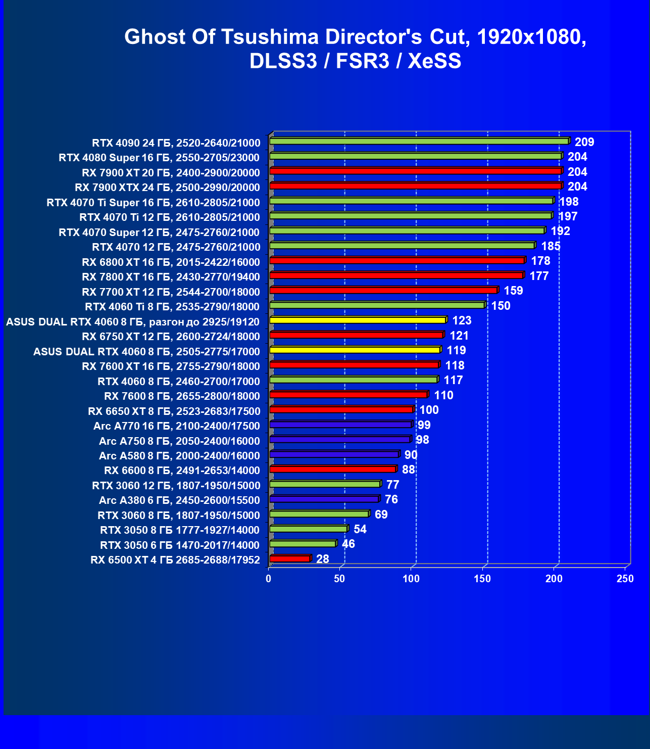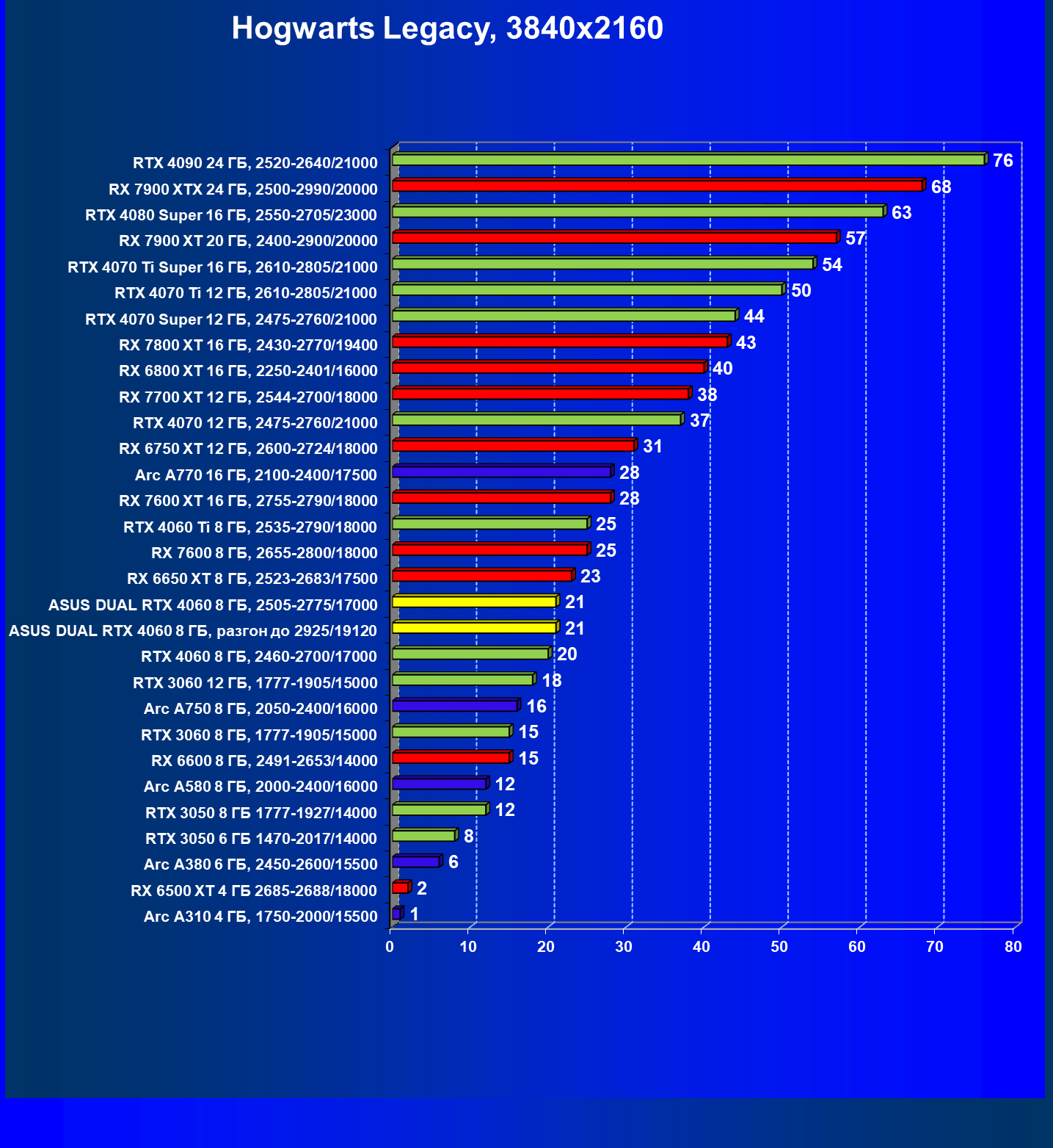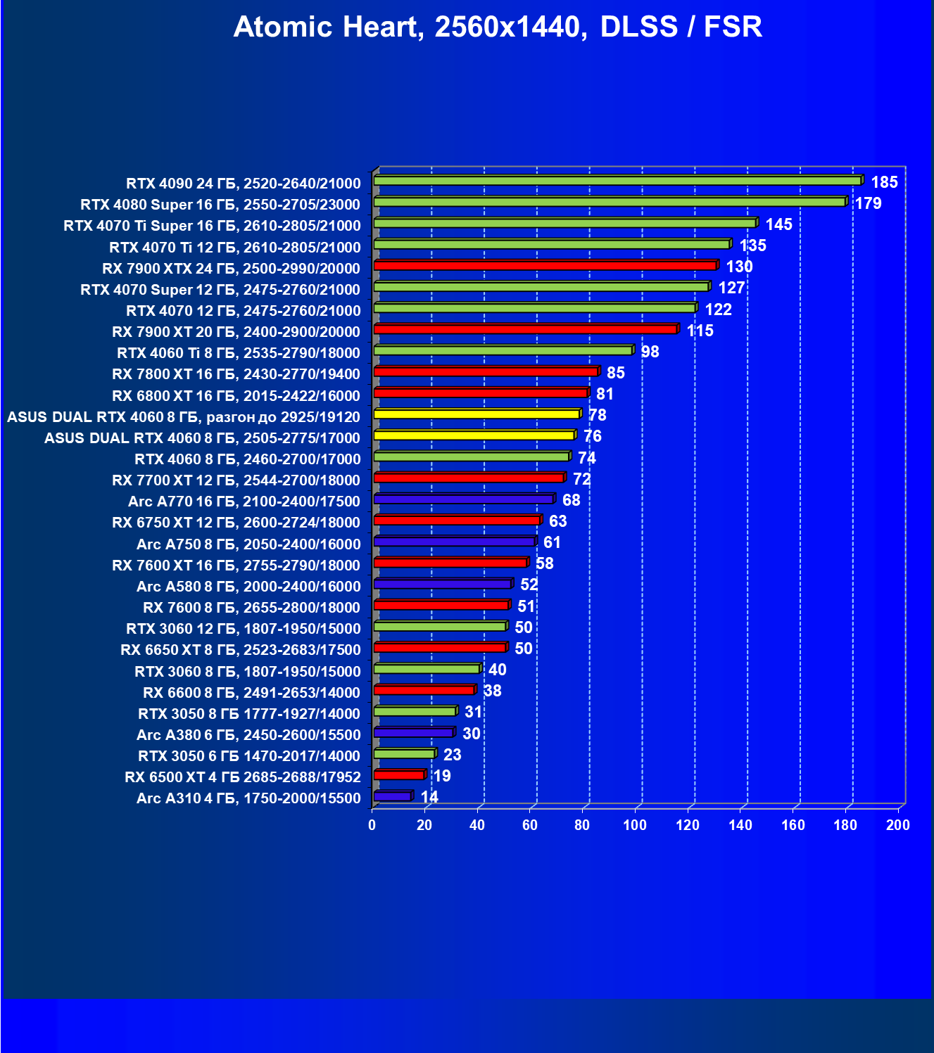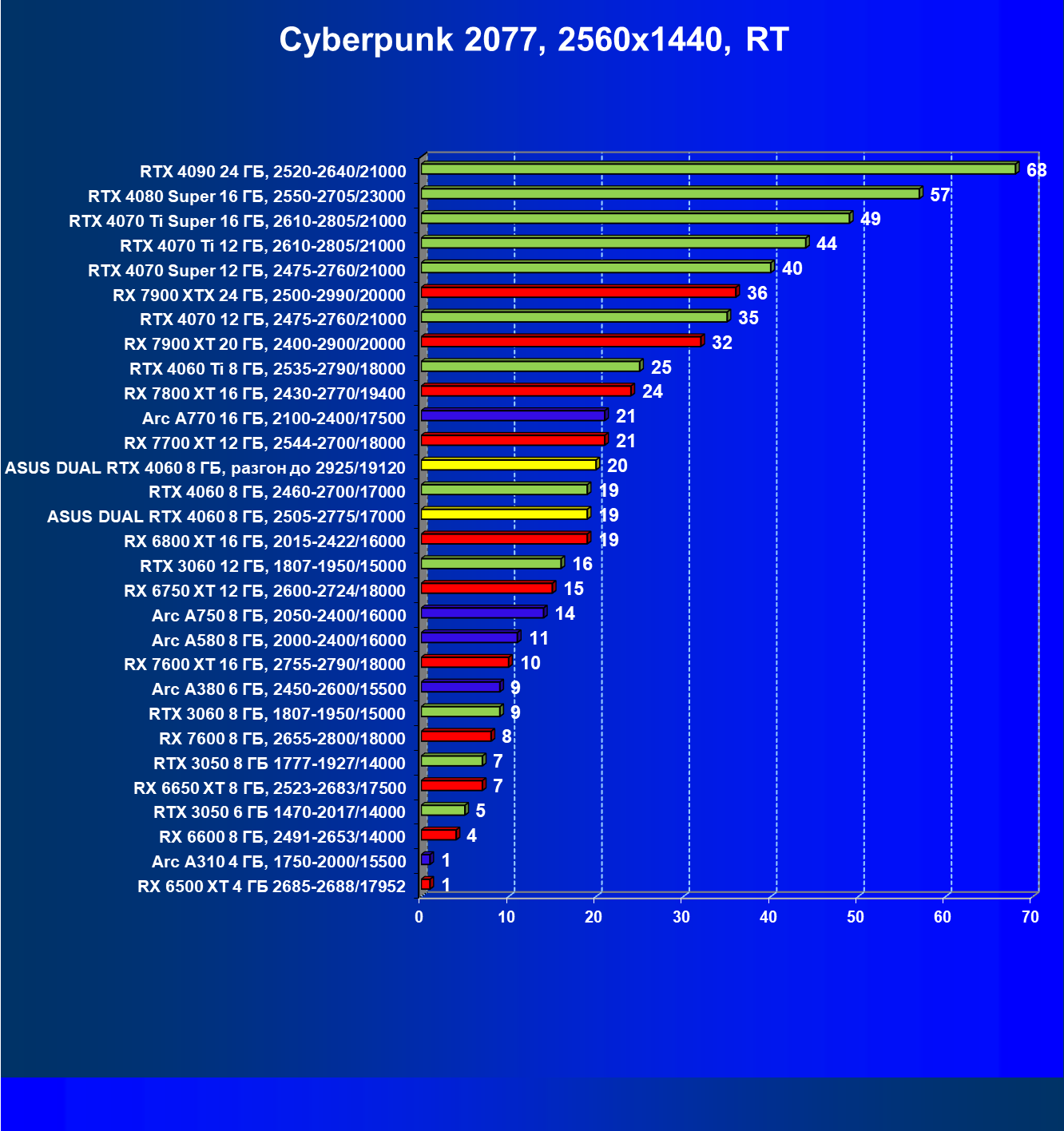| 07 | Arc A770 16 ГБ, 2100—2400/17500 | 198 | 673 | 34 000 |