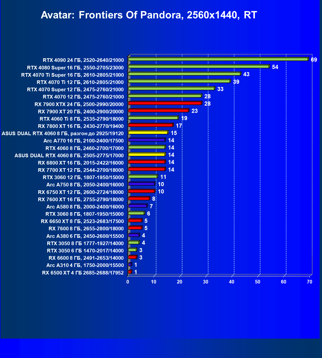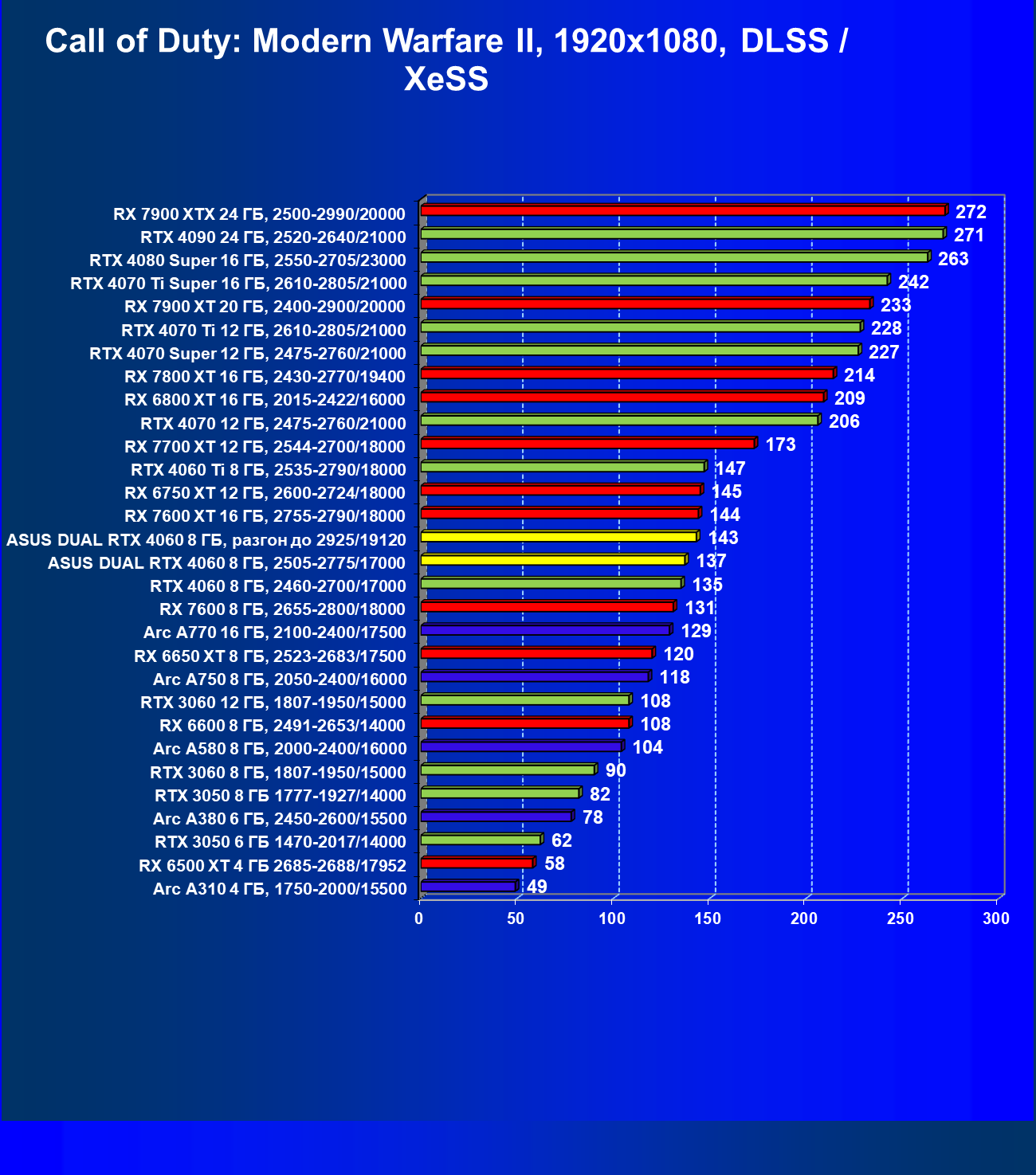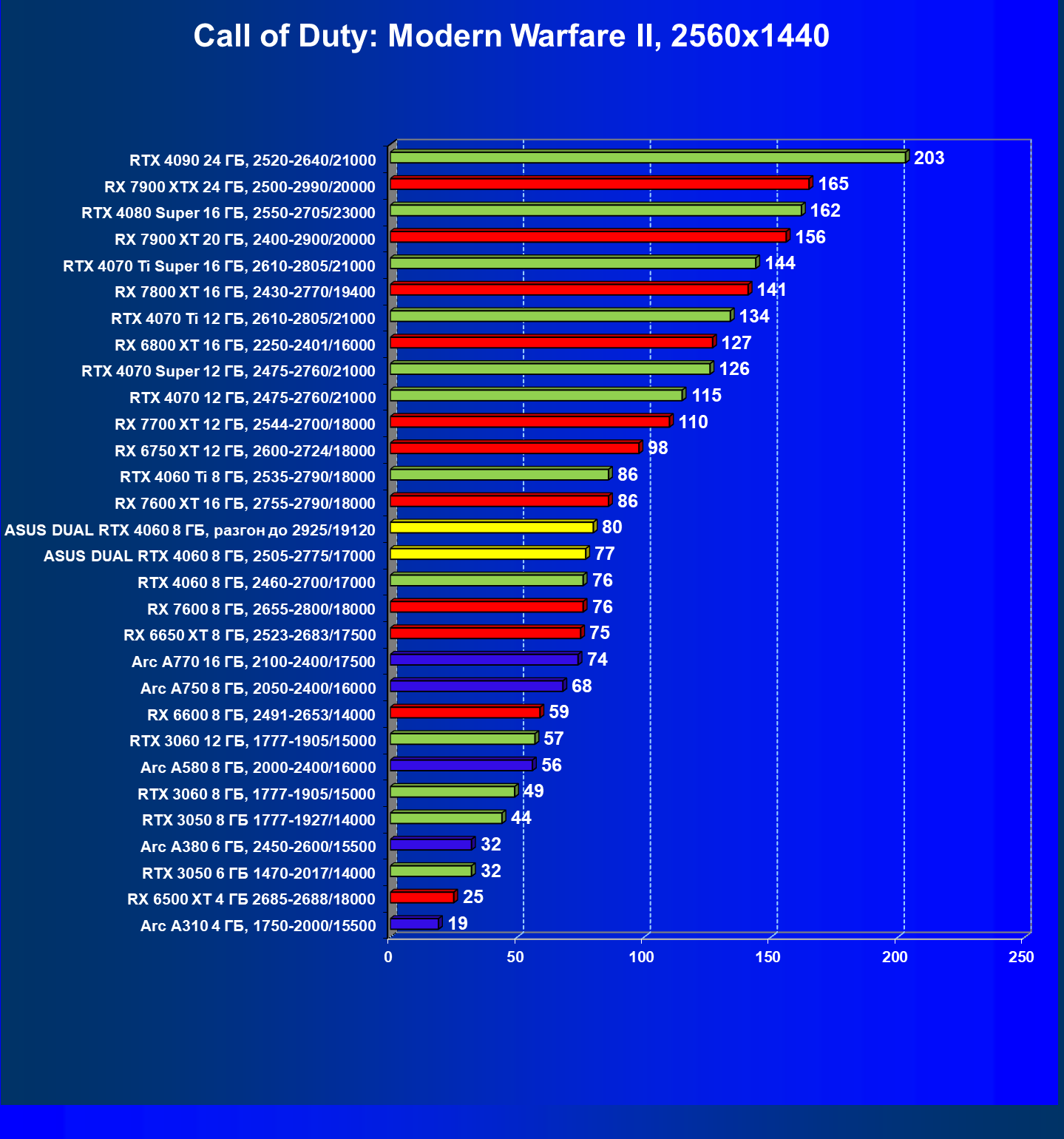 | 15 | Arc A770 16 ГБ, 2100—2400/17500 | 673 | 198 | 34 000 |