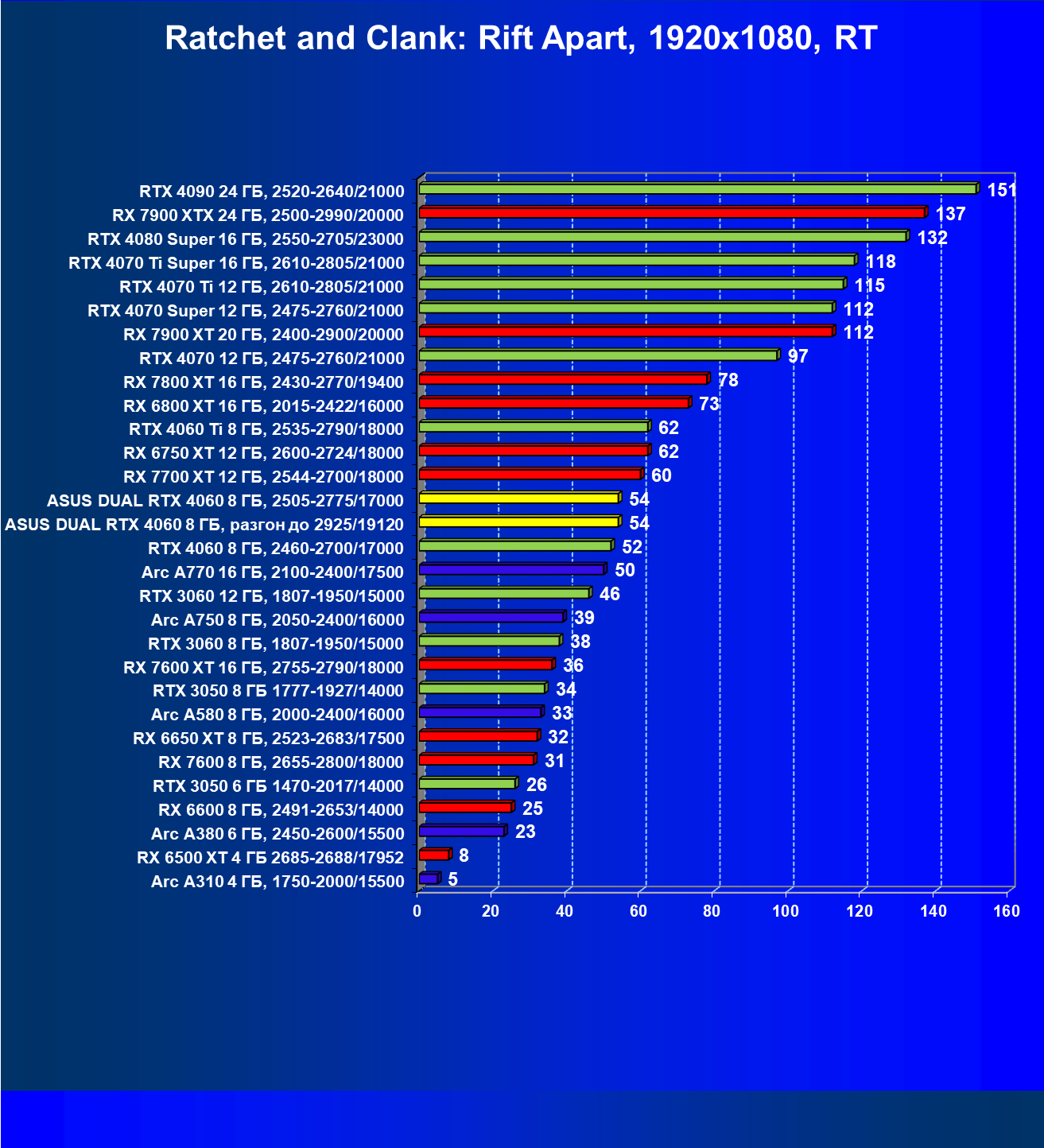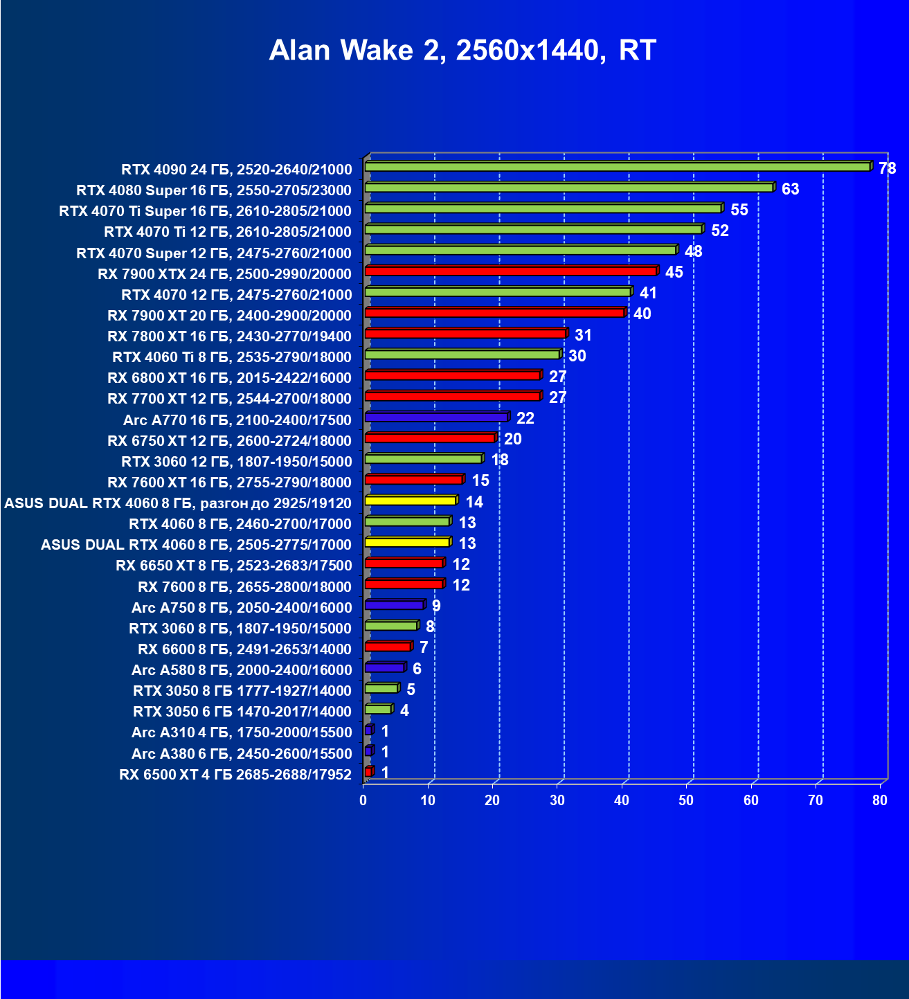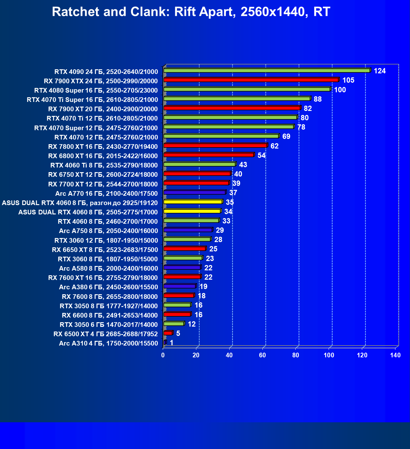 В классических играх без трассировки лучей GeForce RTX 4060 оказался между конкурентами Radeon RX 7600 и Radeon RX 7600 XT, а видеокарта Arc A770 оказалась чуть производительнее. Карта Asus из-за фабричного разгона выдает чуть более высокий результат, но даже ручной разгон не дает ей возможности догнать Arc A770 или Radeon RX 7600 XT.