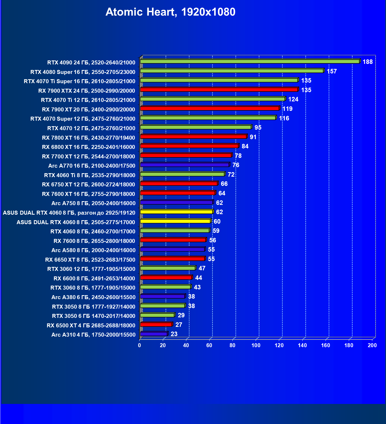 | 05 | Asus Dual RTX 4060 8 ГБ, разгон до 2925/19120 | 415 | 1329 | 32 000 |