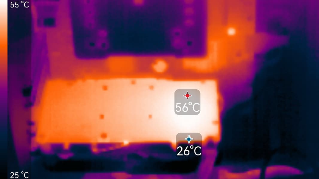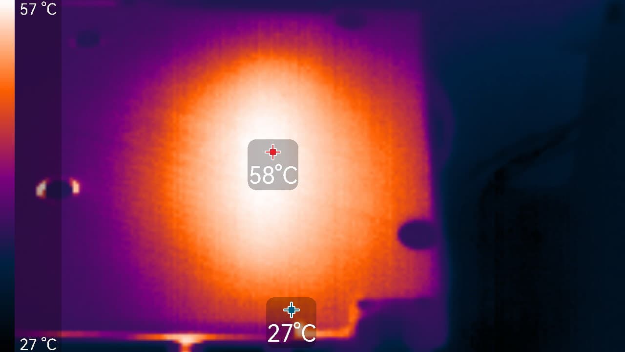 Максимальный нагрев наблюдался в районе VRM, а также около разъема питания.